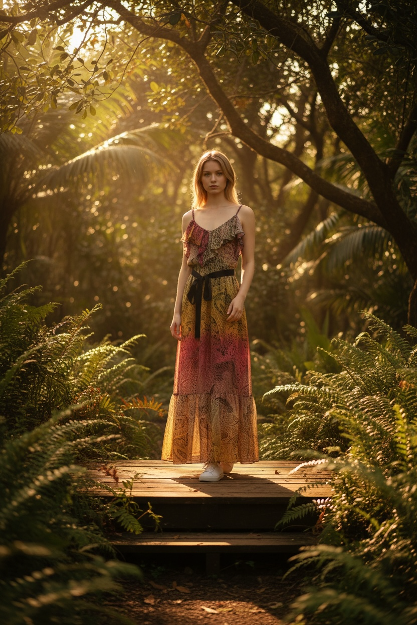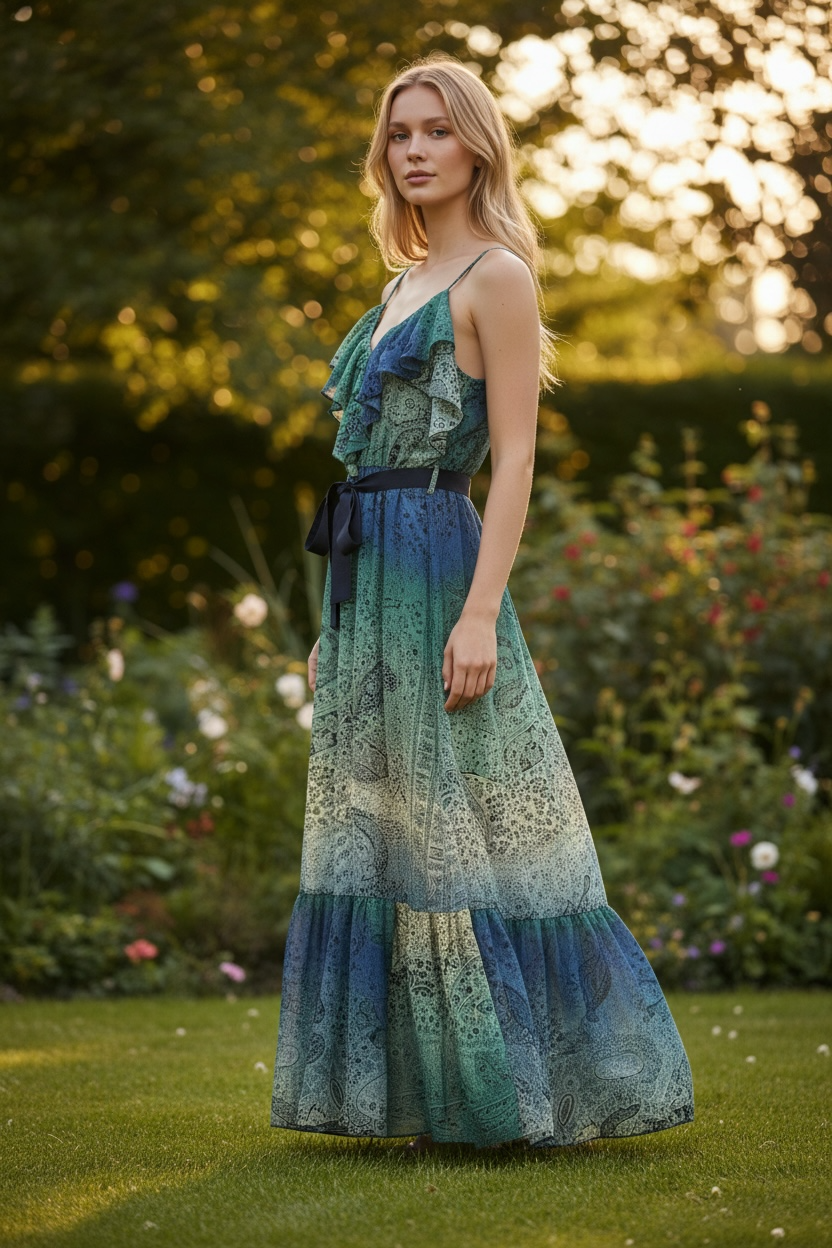 Abito lungo foderato dal design femminile ed elegante, caratterizzato da un cinturino in vita che valorizza la silhouette. Lo scollo è impreziosito da una delicata balza decorativa, che aggiunge movimento e romanticismo al capo. Le spalline sottili completano il look con un tocco leggero e raffinato, rendendo l’abito ideale sia per occasioni speciali che per serate estive.