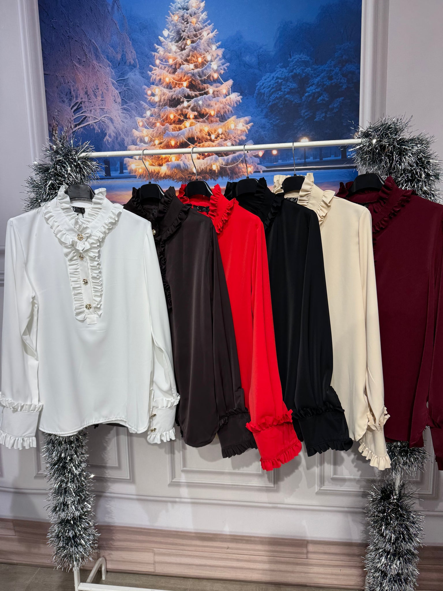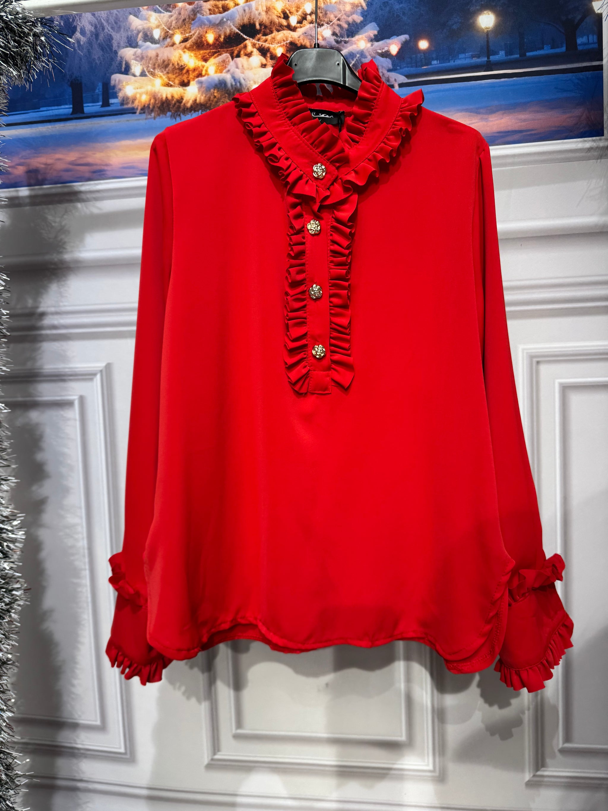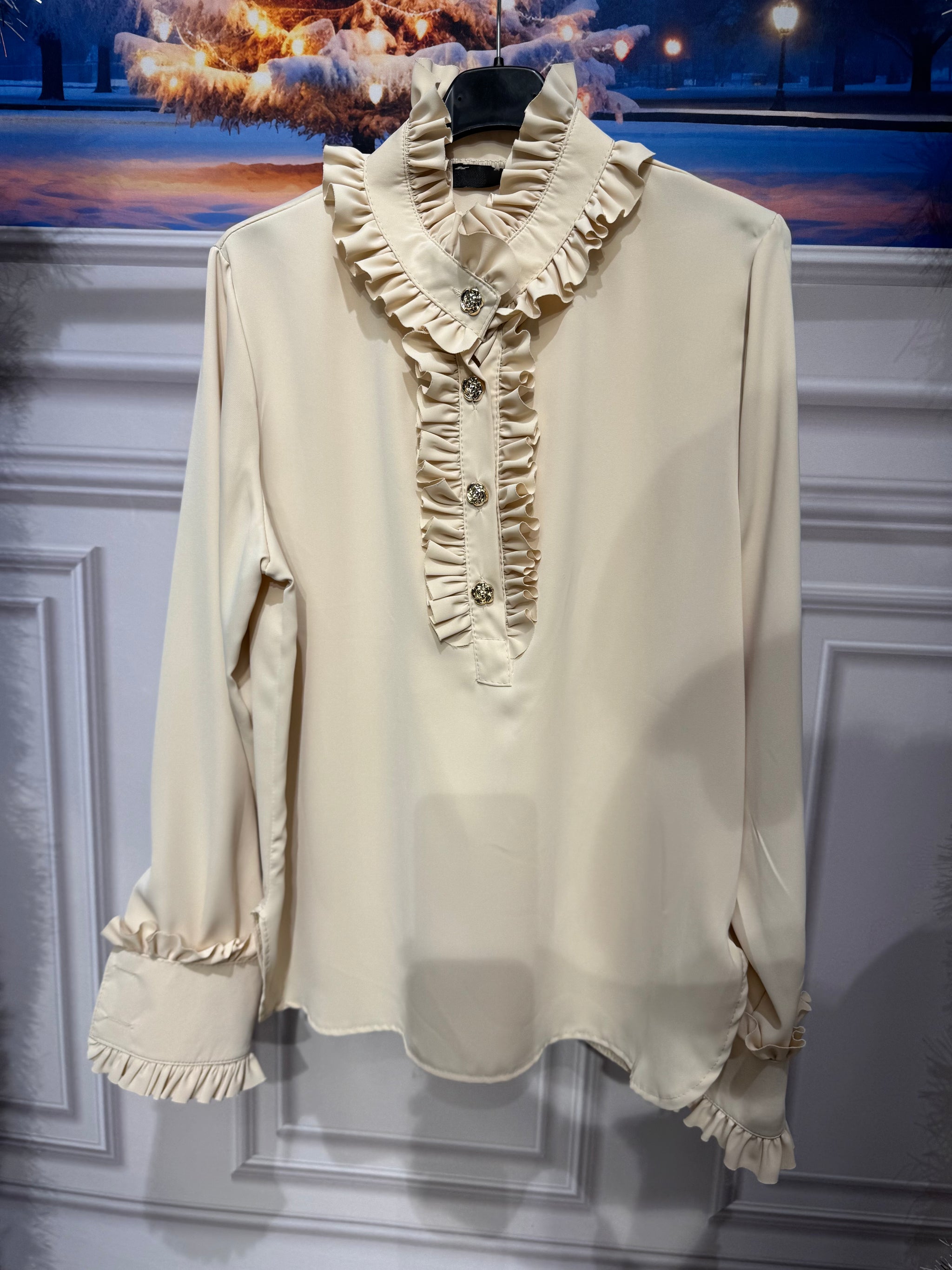 Blusa collo camicia con bottoni gioiello e arriccio sul collo e sul polsino, vestibilità 110cm di giro seno