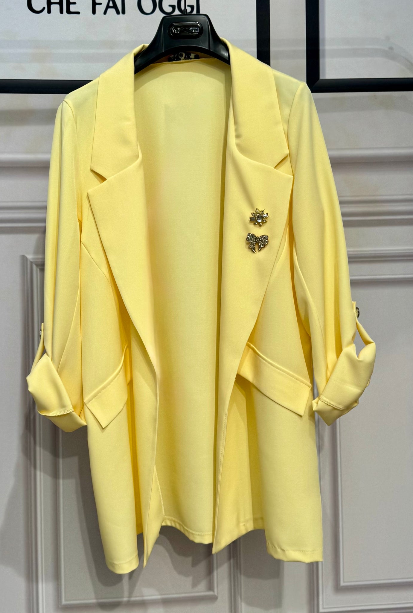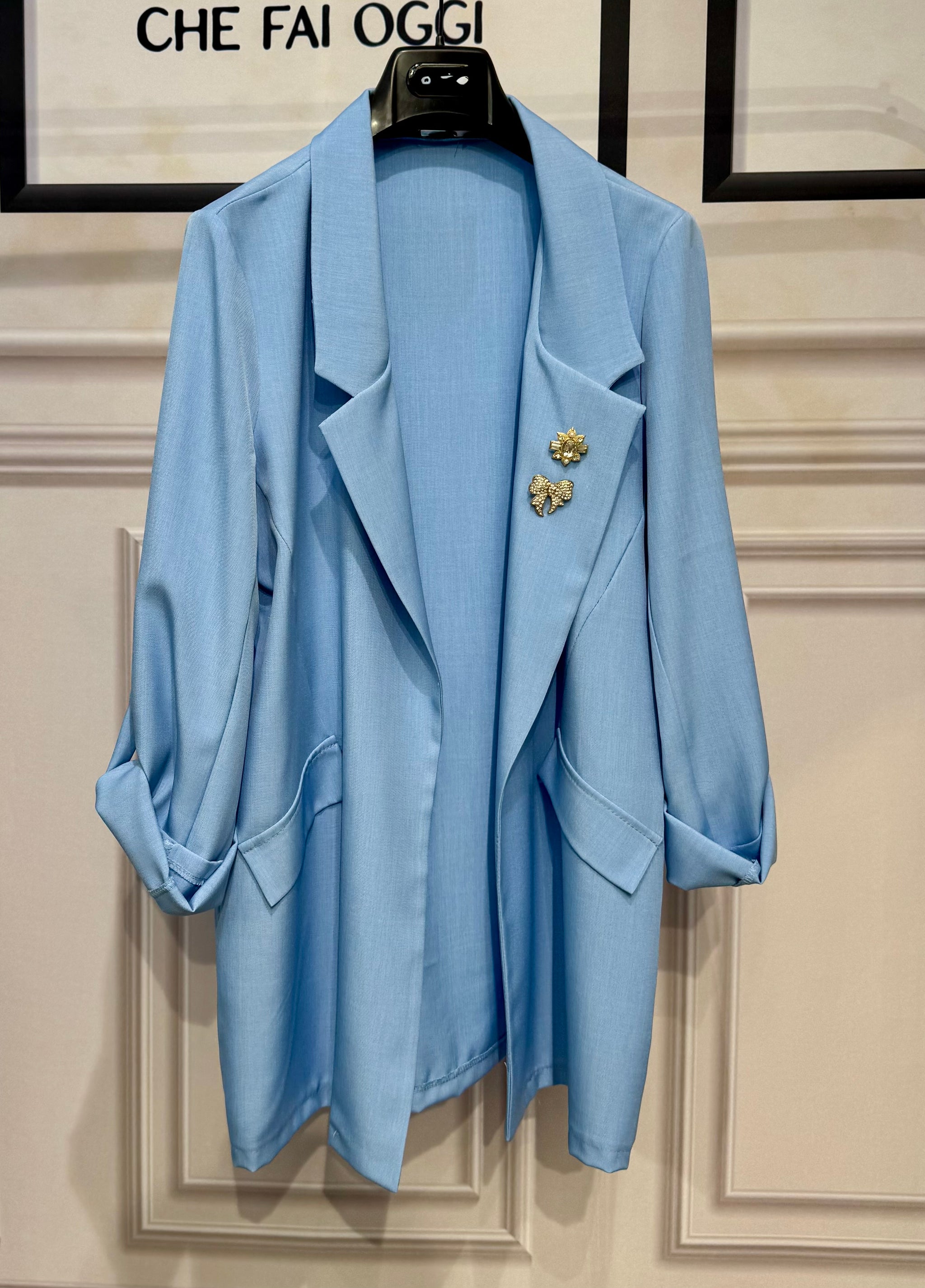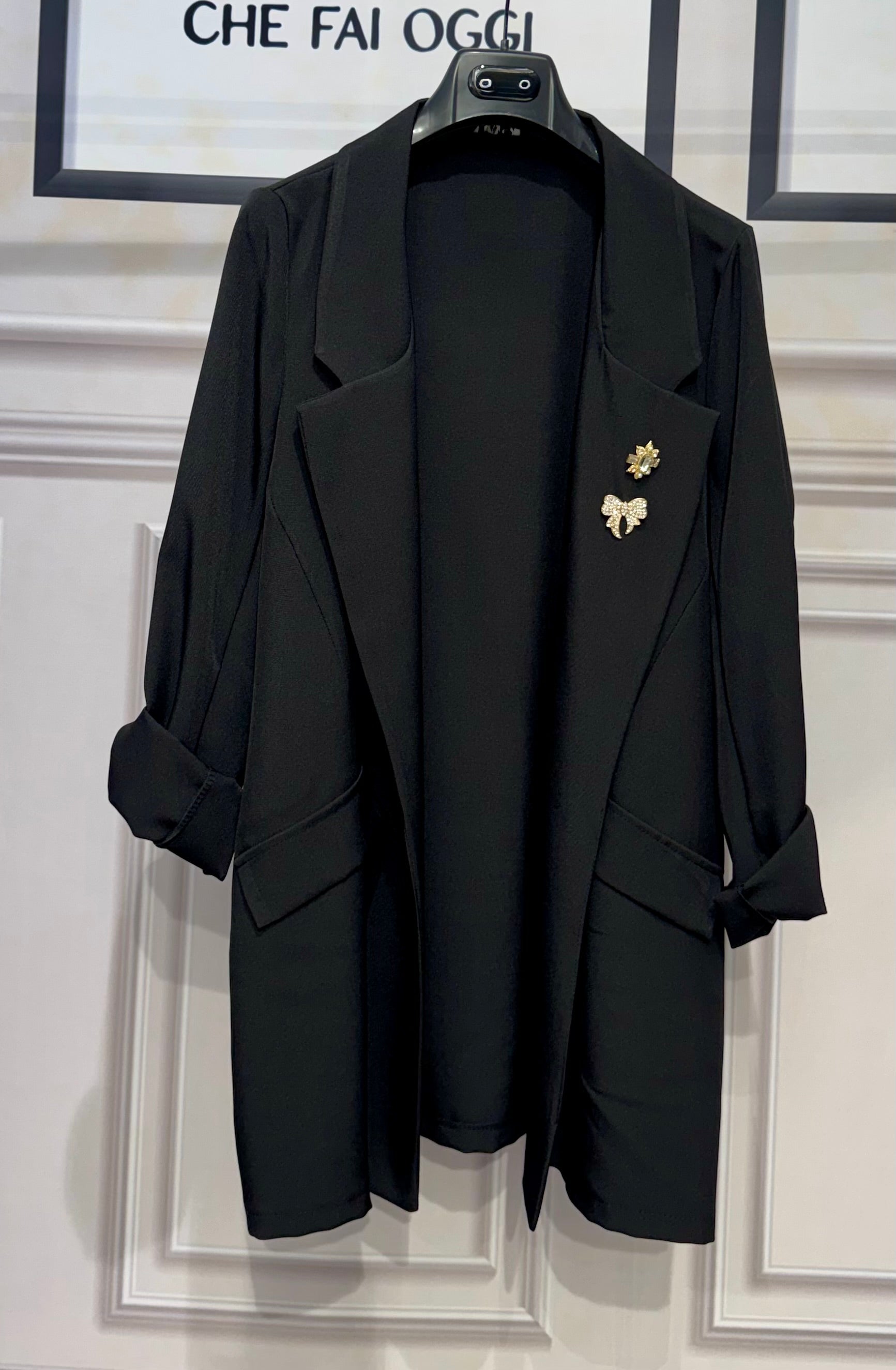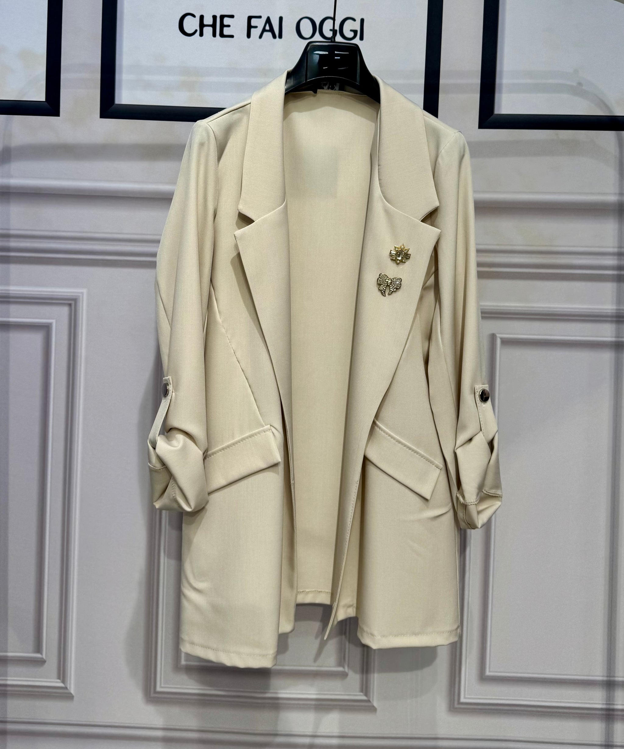 Giacca dal design raffinato, caratterizzata da maniche risvoltabili che permettono di personalizzare lo stile e la vestibilità. Le finte tasche decorative valorizzano la linea del capo, mantenendo un look pulito ed elegante. Completano il design le spille gioiello, dettagli luminosi che donano un tocco sofisticato e distintivo. Ideale per completare outfit sia casual chic che più formali, unisce praticità, stile e ricercatezza. Vestibilità 120cm di giroseno