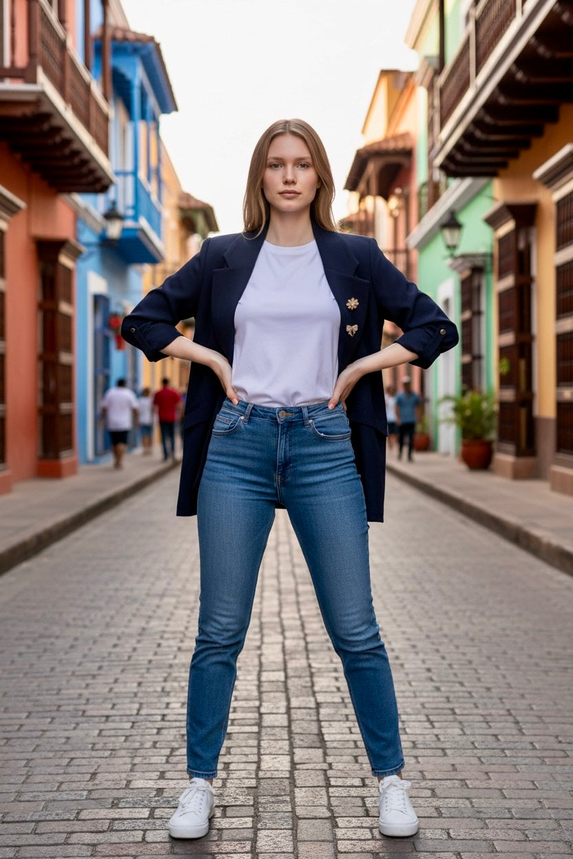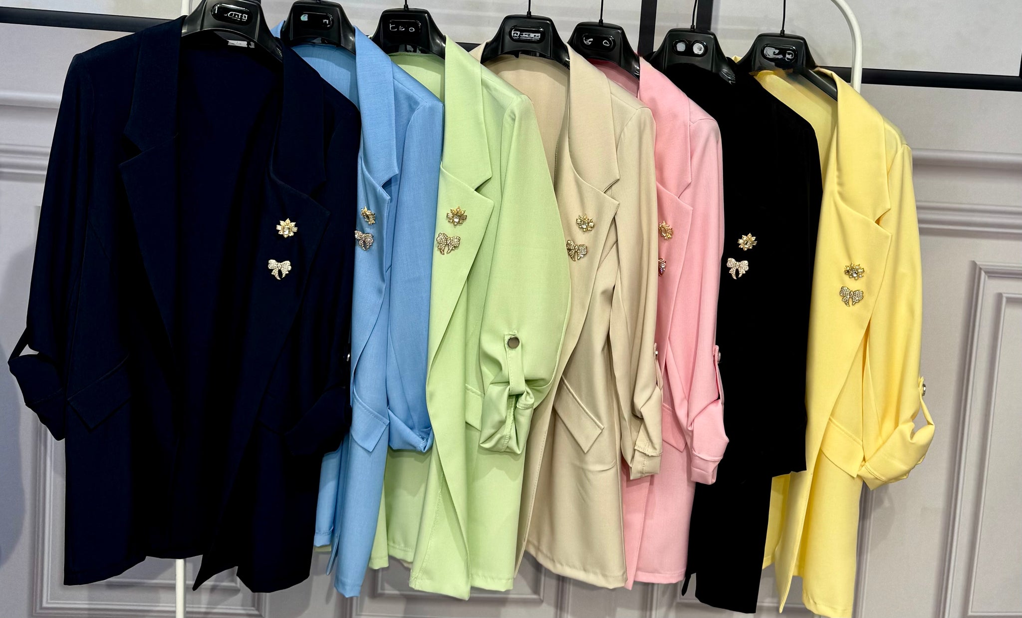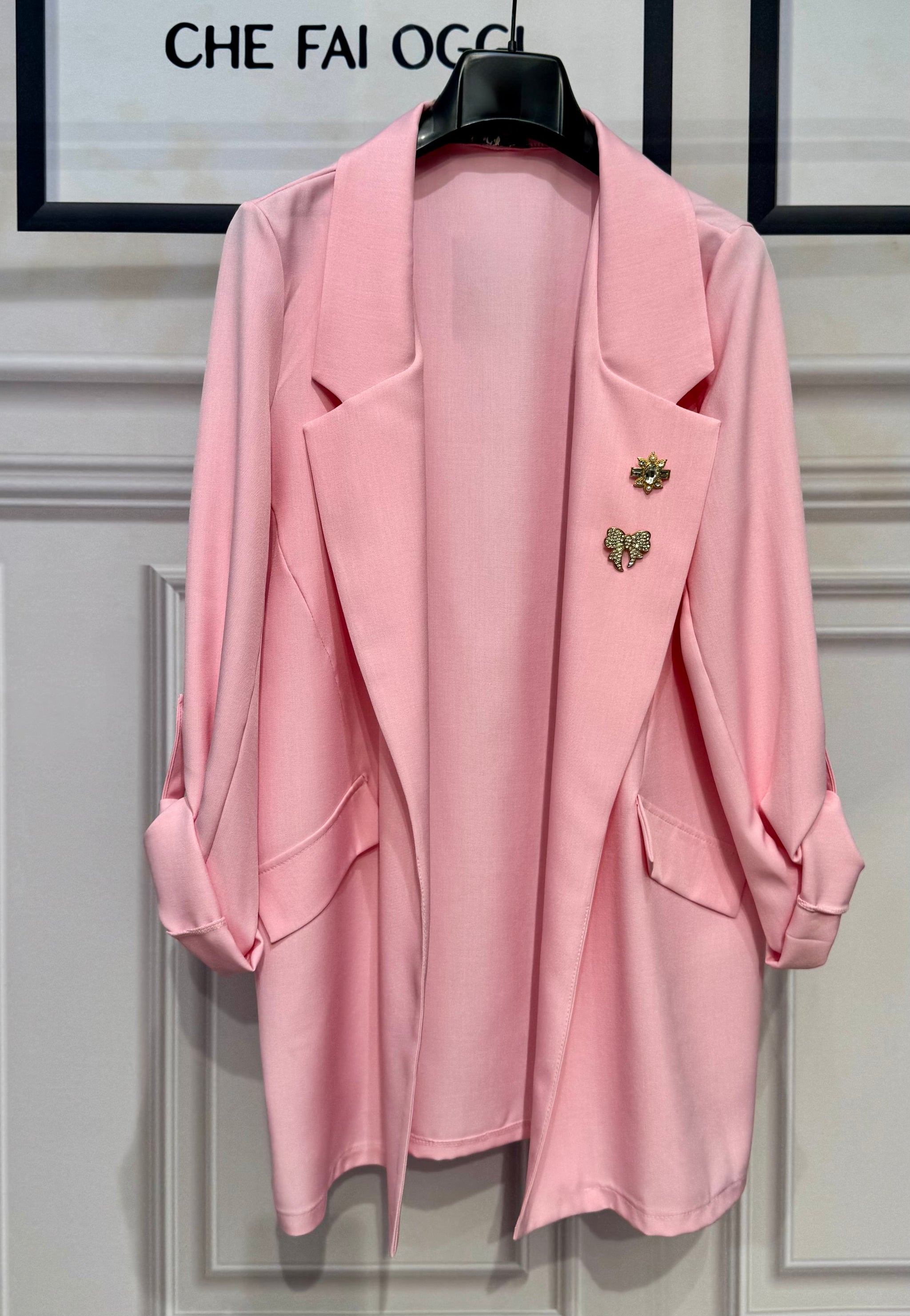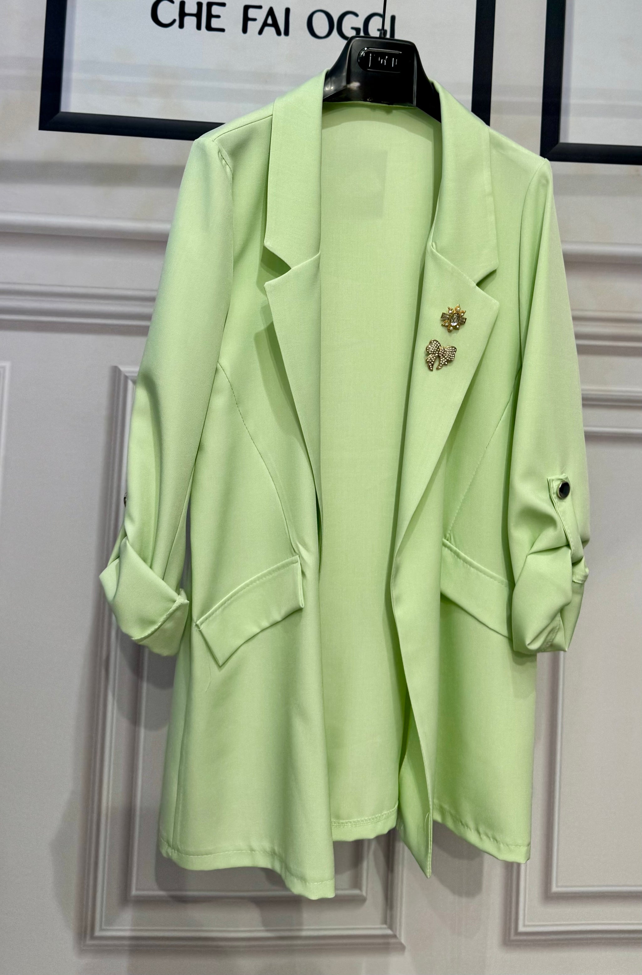 Giacca dal design raffinato, caratterizzata da maniche risvoltabili che permettono di personalizzare lo stile e la vestibilità. Le finte tasche decorative valorizzano la linea del capo, mantenendo un look pulito ed elegante. Completano il design le spille gioiello, dettagli luminosi che donano un tocco sofisticato e distintivo. Ideale per completare outfit sia casual chic che più formali, unisce praticità, stile e ricercatezza. Vestibilità 120cm di giroseno