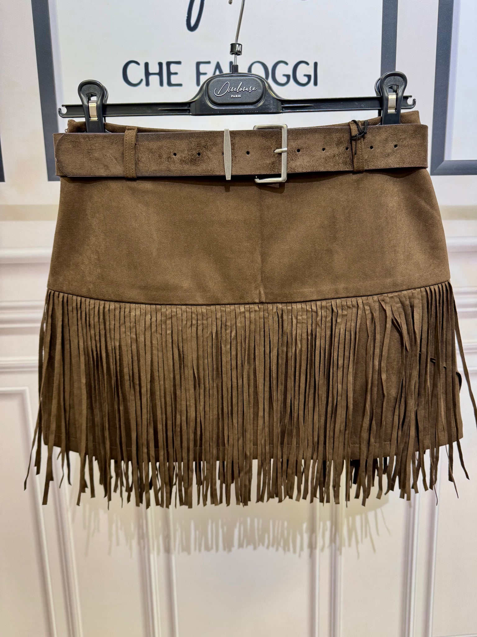 Gonna pantalone con cintura e fascia frange, in eco camoscio con zip laterale