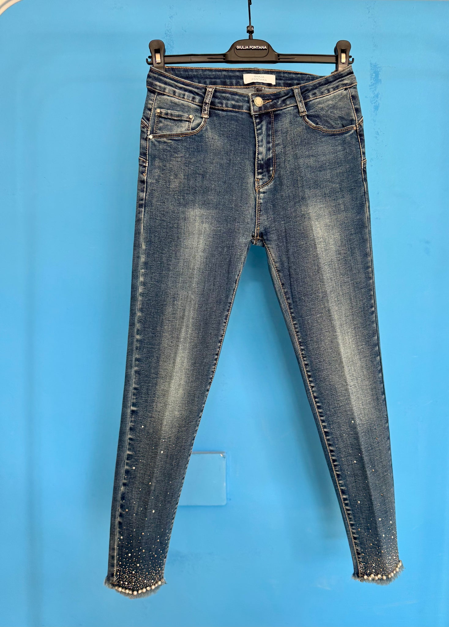 Jeans skinny elasticizzato con strass e perline sul fondo