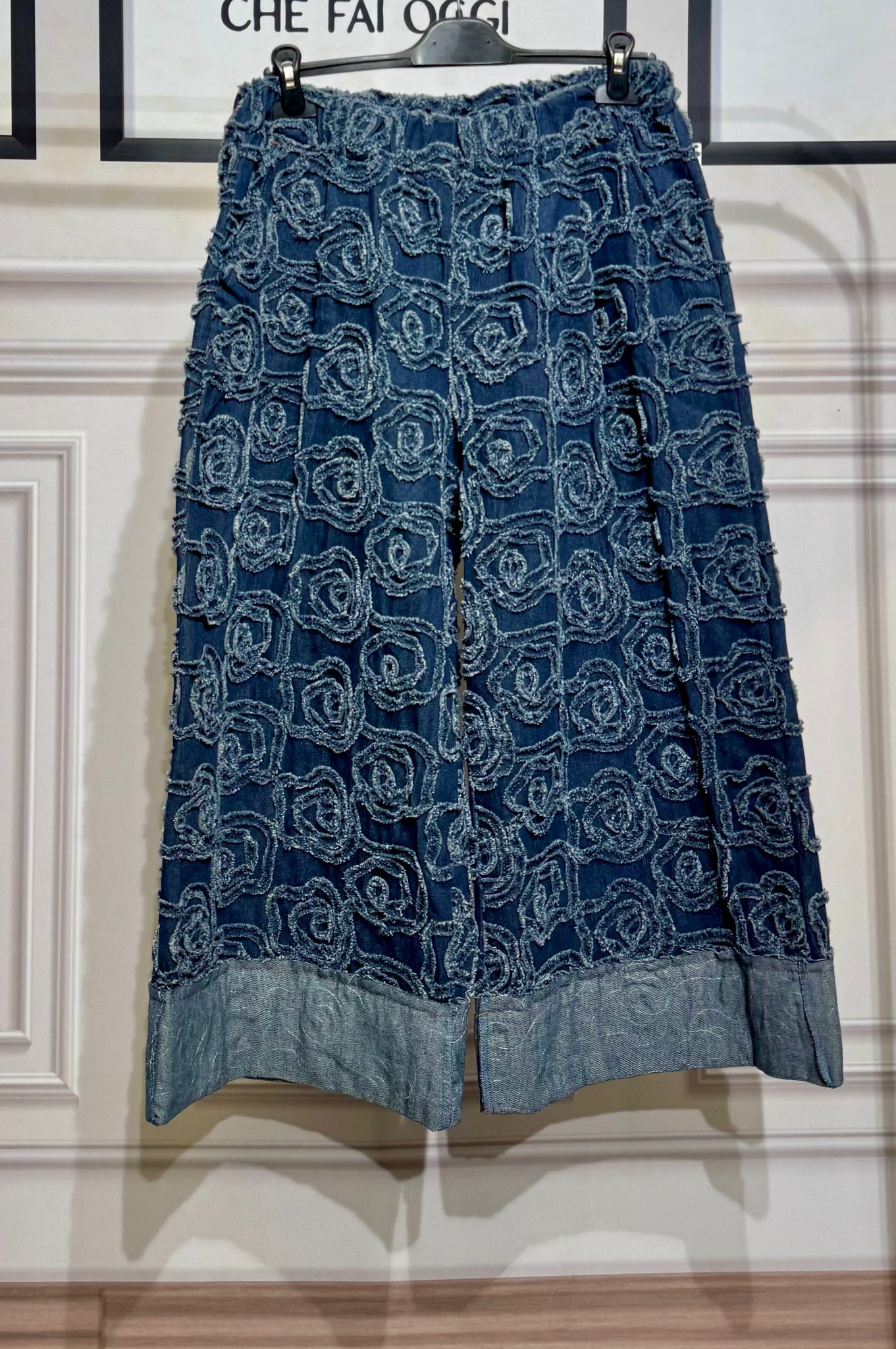 Pantaloni denim palazzo con ricamo e elastico in vita