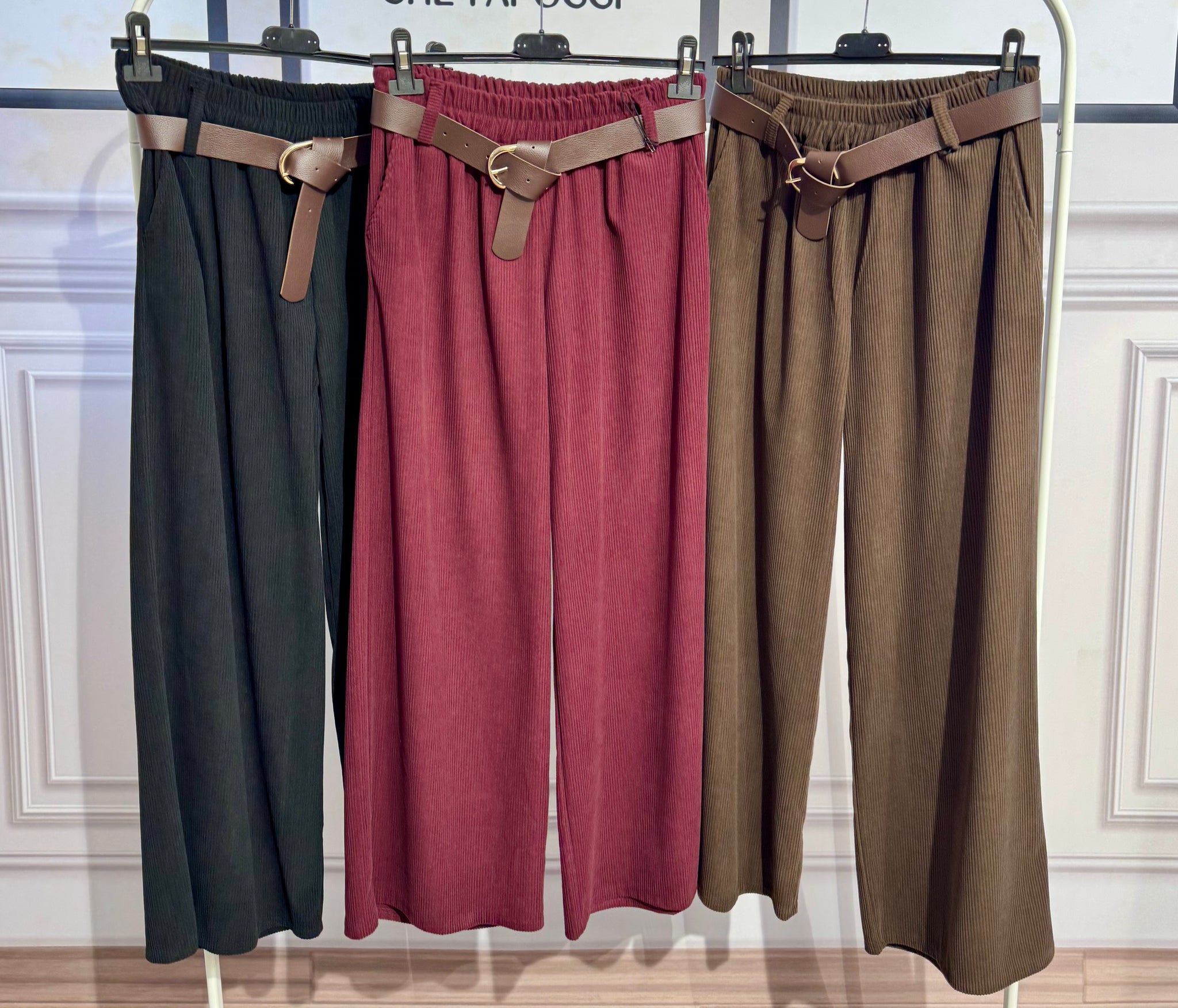 Pantaloni gamba larga tessuto a costine vellutino con elastico in vita e cintura