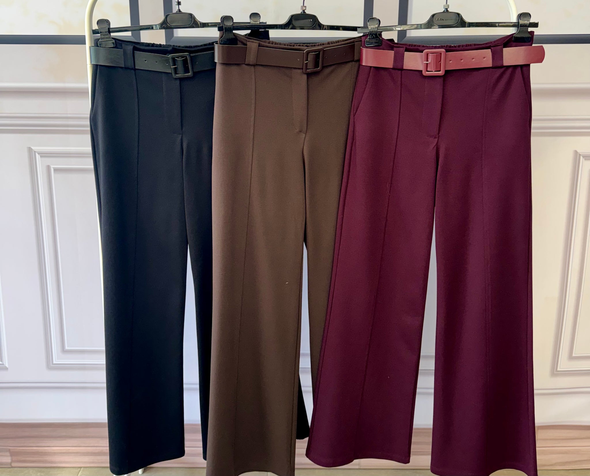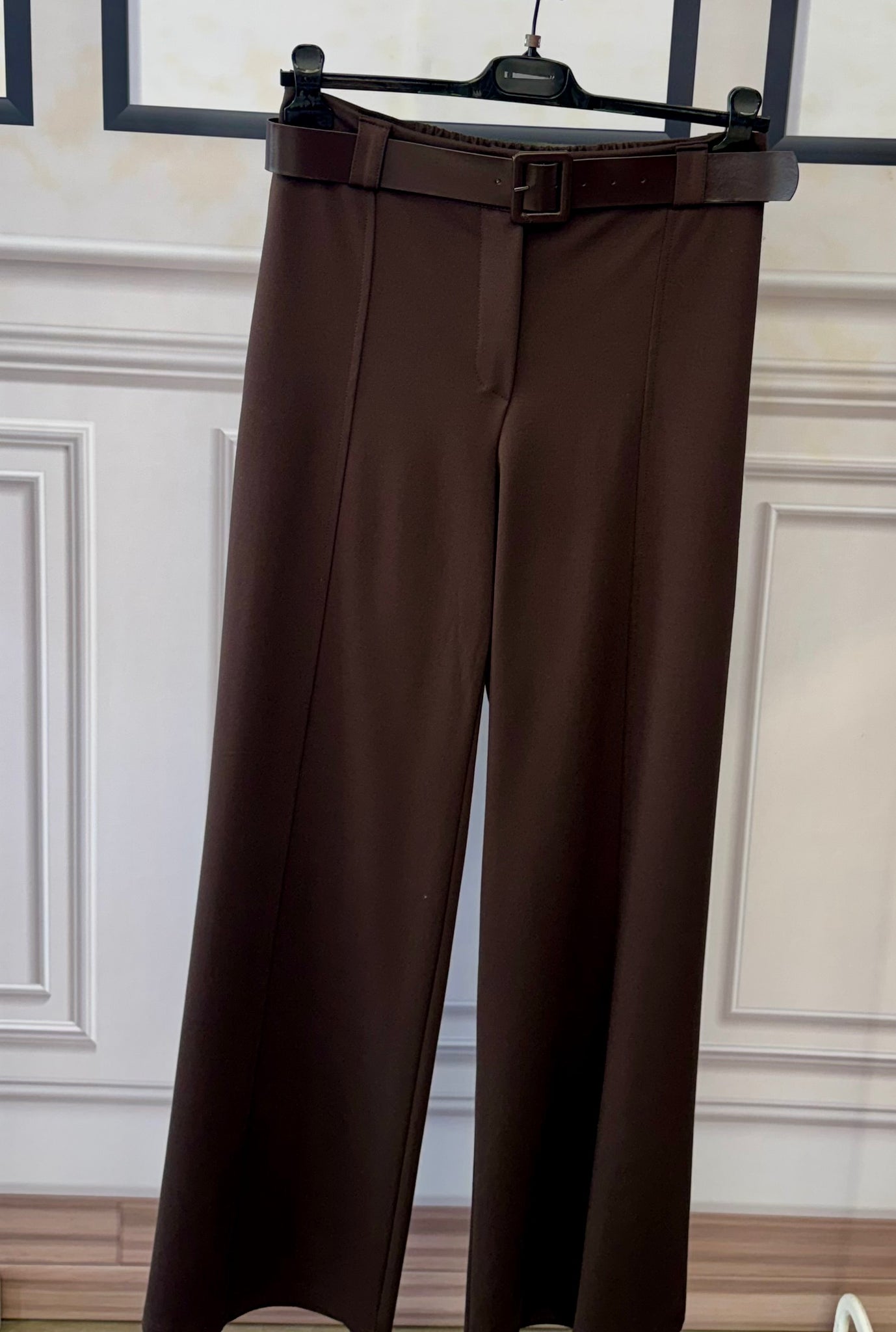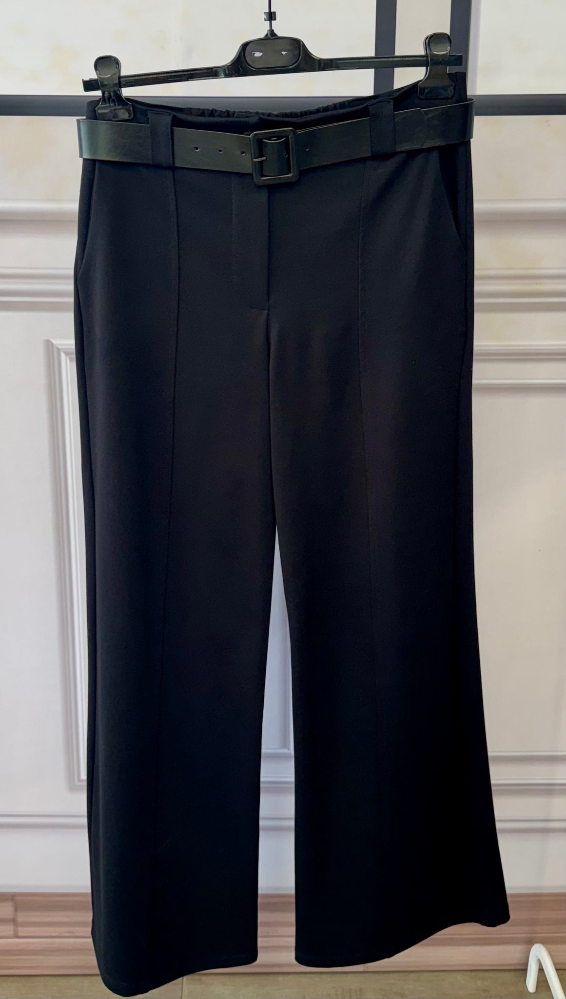 Pantaloni a gamba larga in punto Milano, confortevoli e strutturati.Modello con elastico in vita sul retro per una vestibilità comoda e adattabile, completato da cintura inclusa che valorizza la silhouette.Ideali per un look versatile, dal quotidiano all’ufficio.