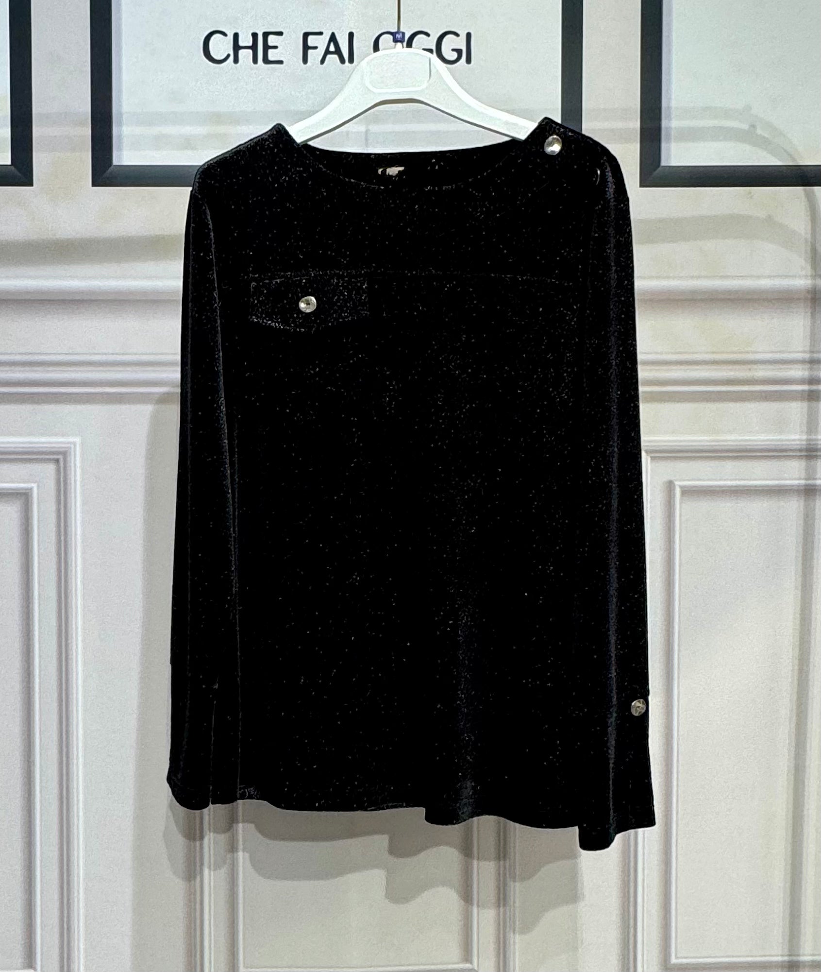 Blusa in ciniglia luminosa, impreziosita da lamé argento che cattura la luce e valorizza lo scollo rotondo. Il design è arricchito da un finto taschino sul davanti e da bottoncini decorativi sulla spalla e sui polsini, per un tocco raffinato e contemporaneo. Morbida al tatto, elegante ma facile da indossare, perfetta per dare luce anche agli outfit più semplici. In varie taglie disponibili: