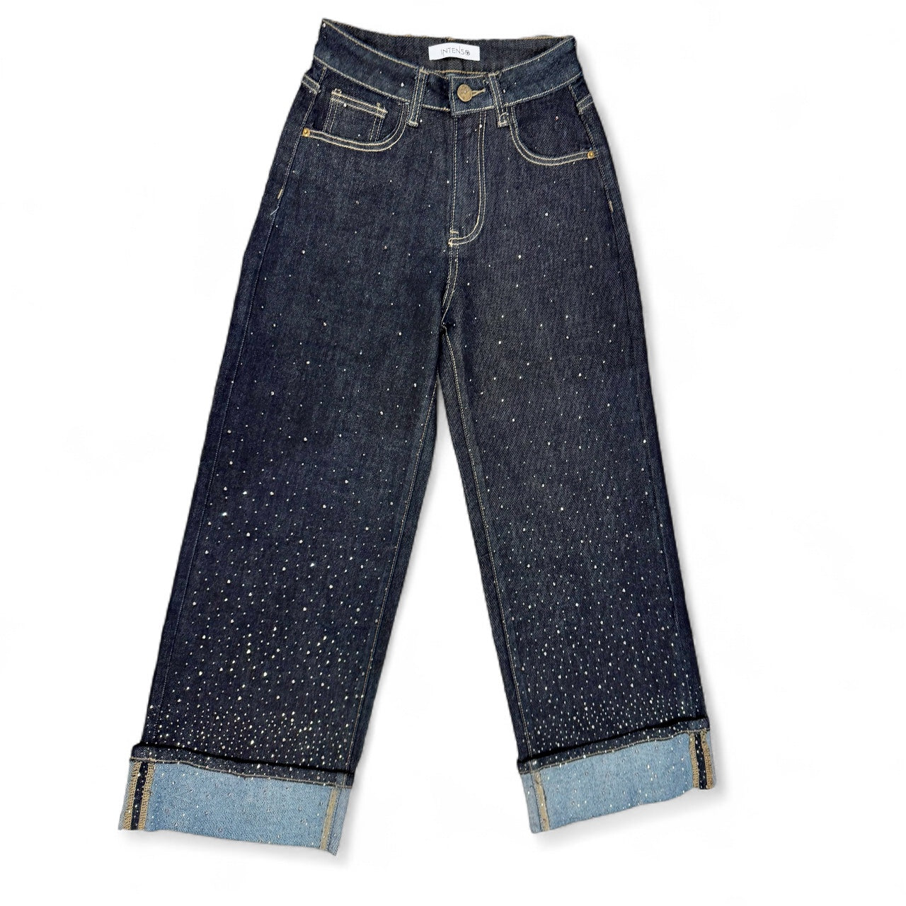 Jeans modello a palazzo 5 tasche con piegone e strass sul davanti
