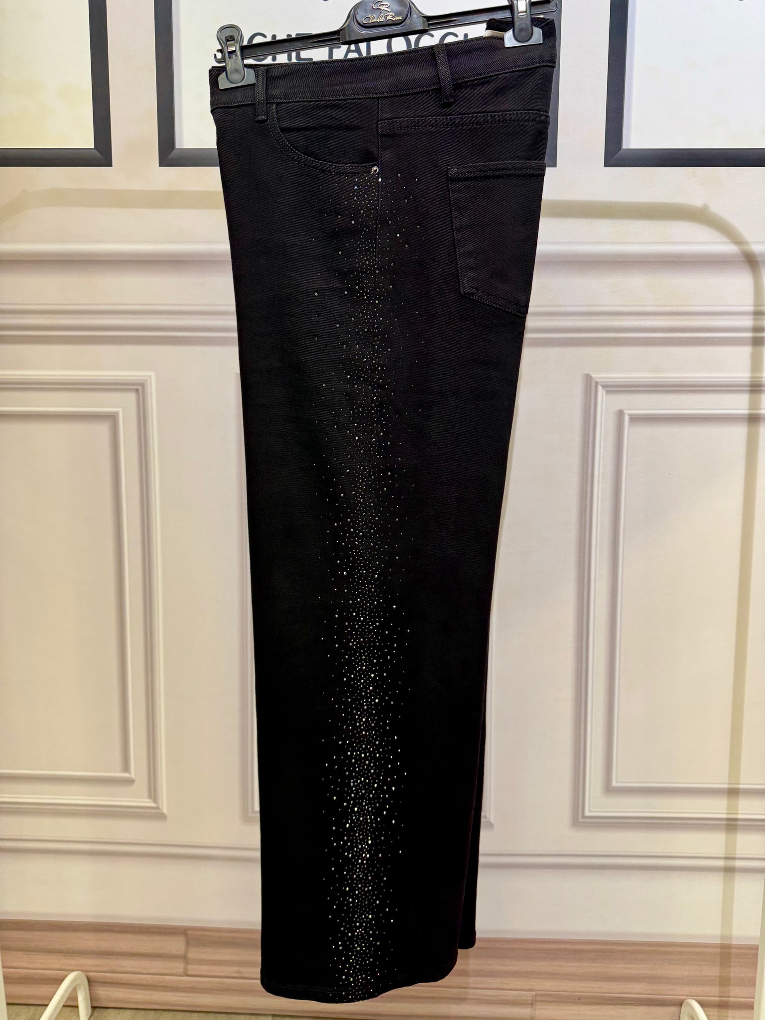 Jeans nero modello a palazzo con strass laterali