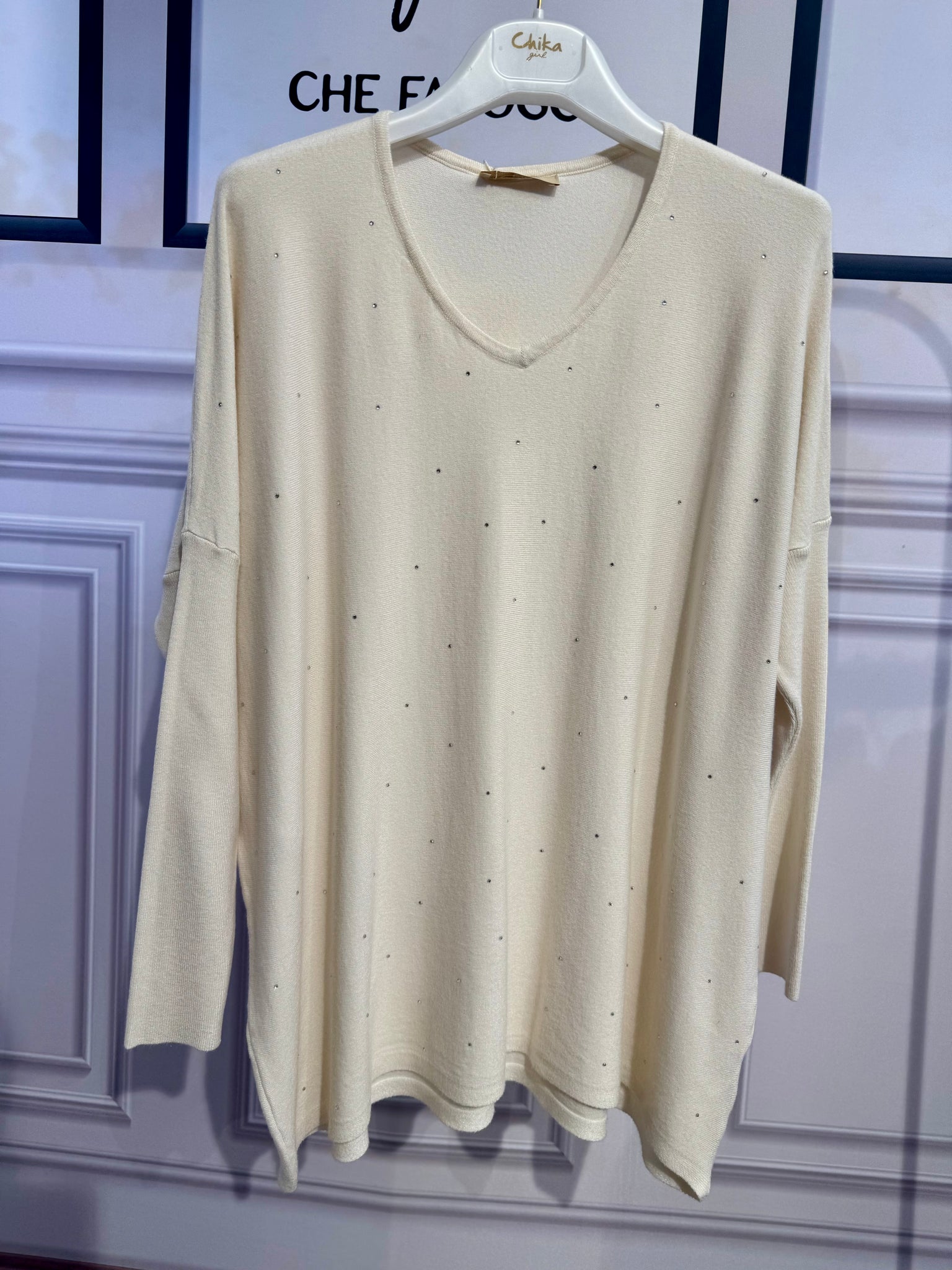 Maglia in lana pettinata scollo a V e strass