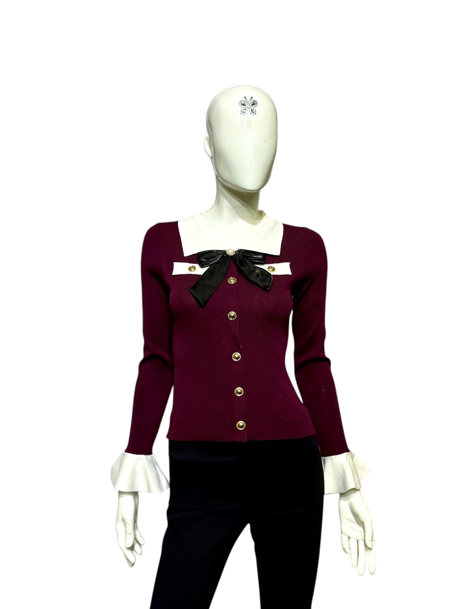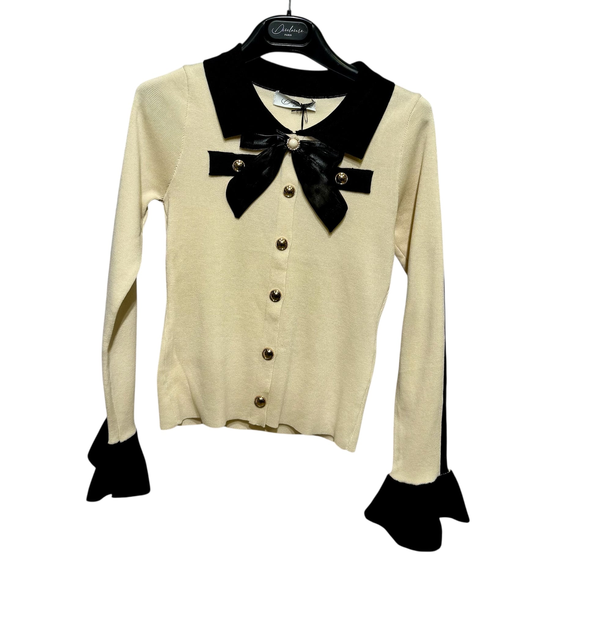 Maglioncino a costine con colletto camicia e dettaglio di fiocco con perla e manica ampia
