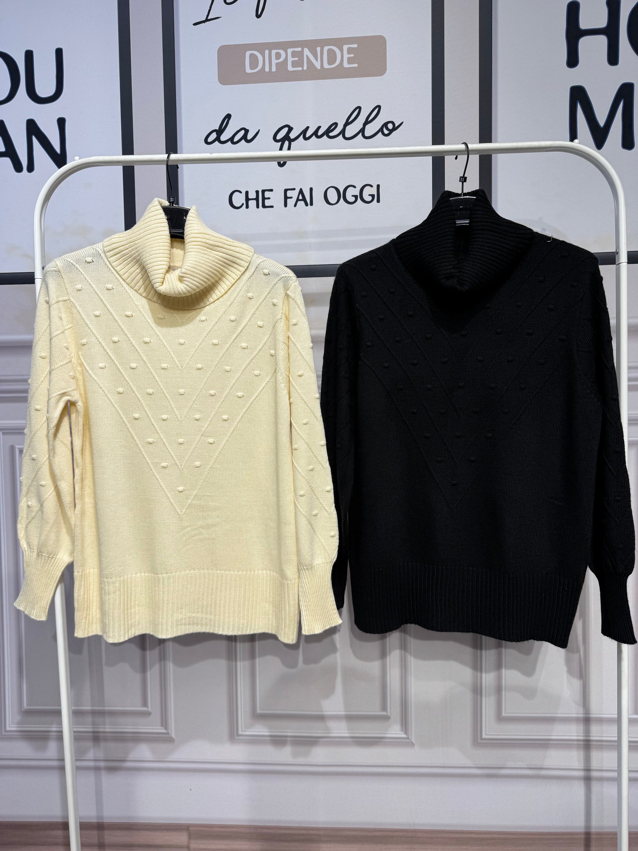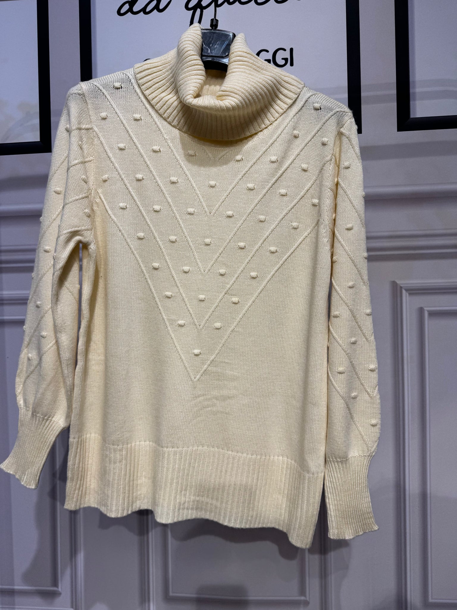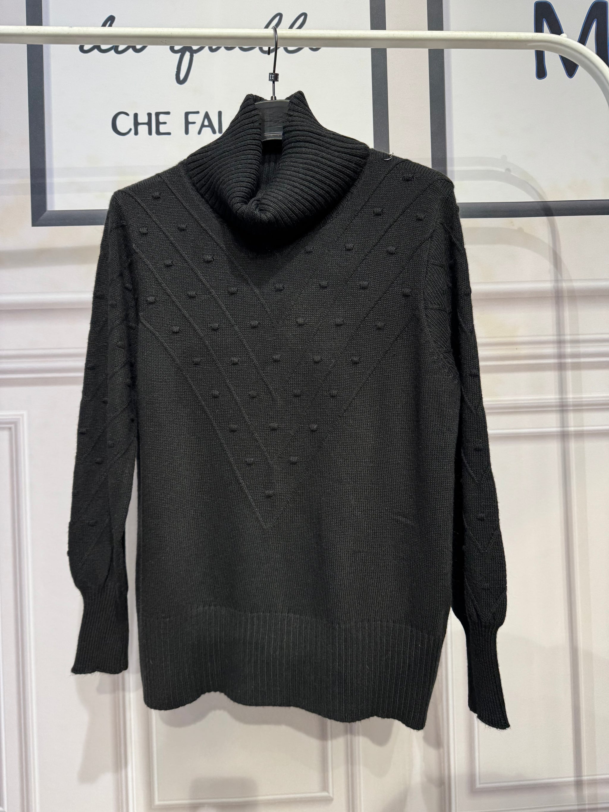 Maglione collo alto a maglia larga, trama a V puntinata