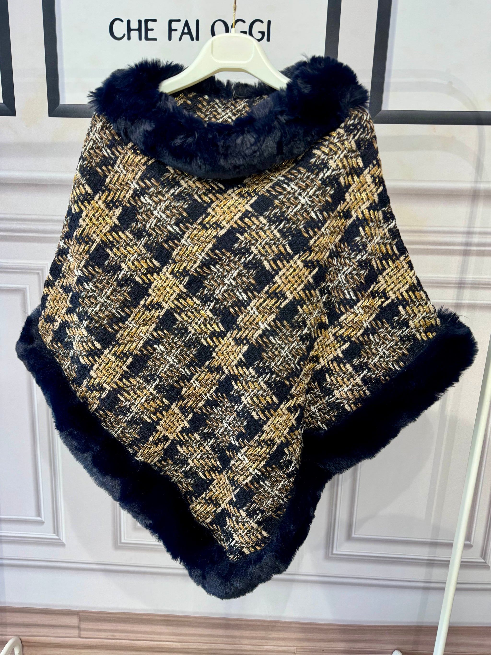 Mantella chiusa in tweed con filo lame e inserti in eco pelliccia