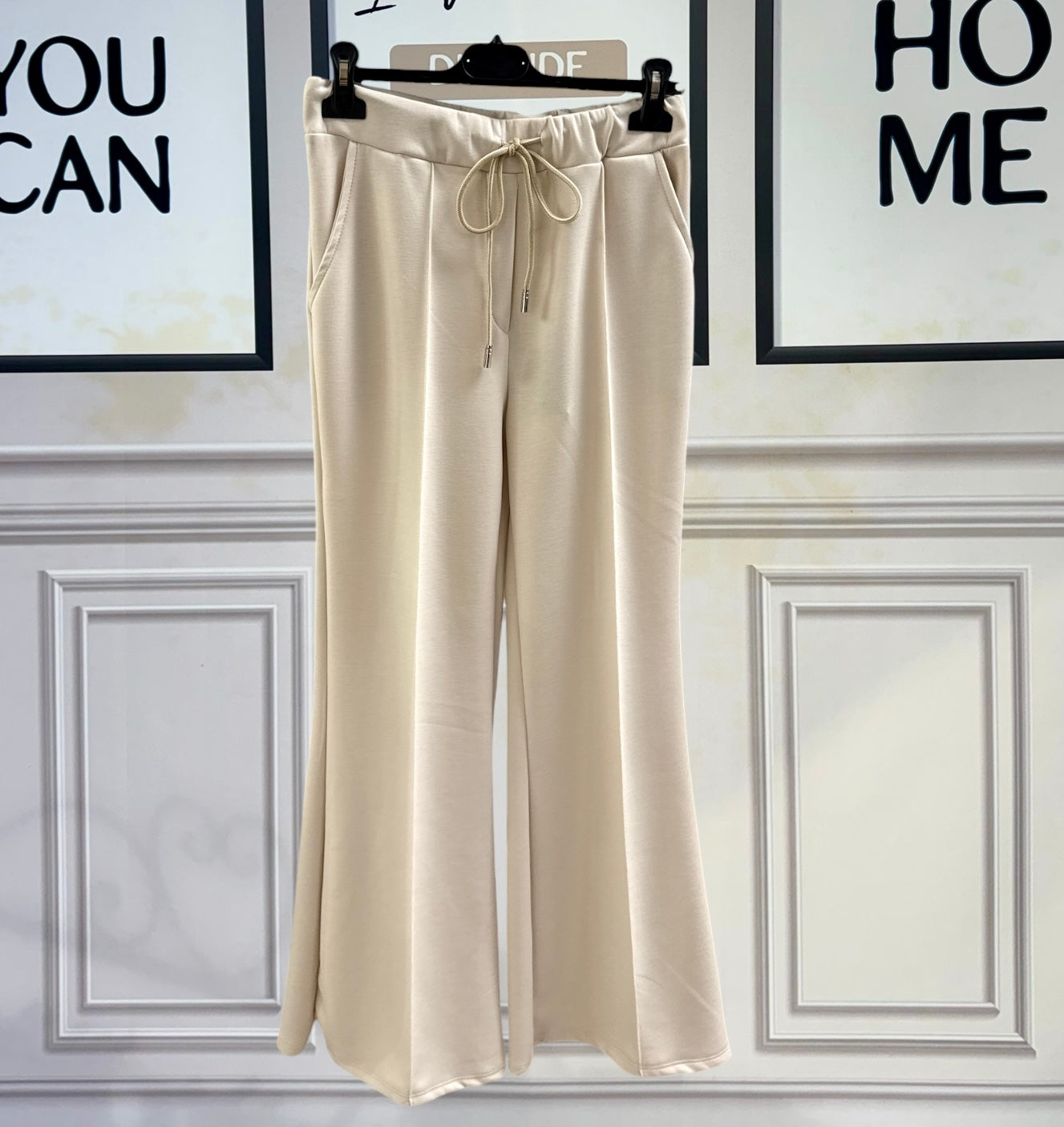 Pantaloni in tessuto nuvola, incredibilmente morbidi e leggeri sulla pelle. La linea scivola fluida lungo la gamba e si apre delicatamente a zampa sul fondo, regalando movimento ed eleganza. Elastico in vita per una vestibilità comoda e versatile, completato da coulisse regolabile che permette di adattarli perfettamente alla silhouette. Ideali per un look rilassato ma curato, perfetti dal giorno alla sera.