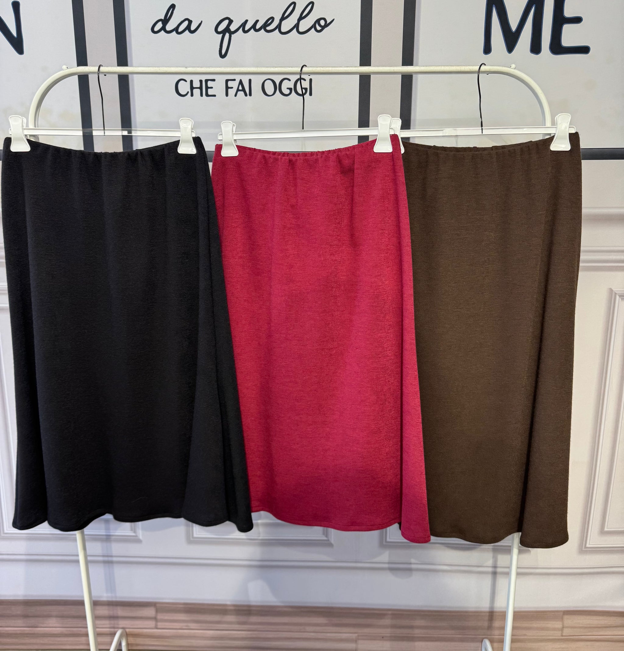 Gonna in lana modello a campana, tessuto elasticizzato con molla in vita, vestibilità comoda, in varie taglie