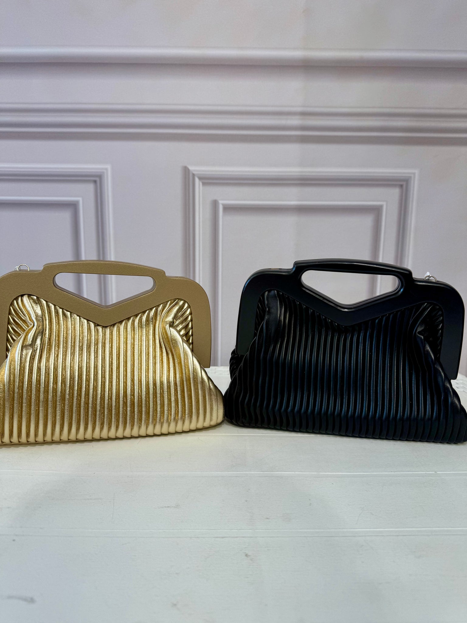 Borsa con manico rigido e tracolla inclusa, tessuto effetto metallizzato in due colori disponibili