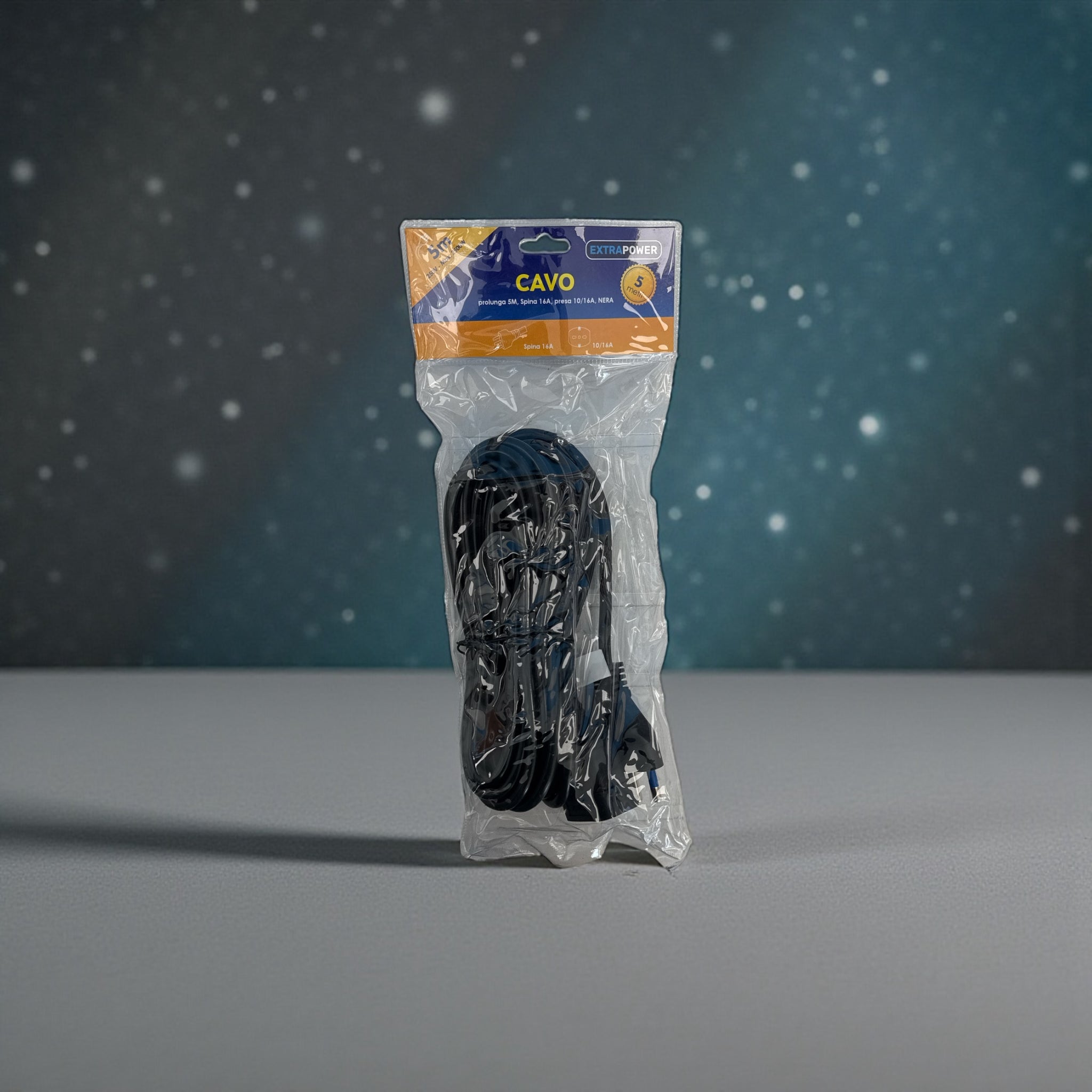 Cavo prolunga elettrico da 5 metri, ideale per alimentare elettrodomestici e utensili ad alta potenza. Dotato di spina italiana 16A e presa bipasso 10/16A, consente il collegamento di dispositivi con diversa assorbenza in totale sicurezza.