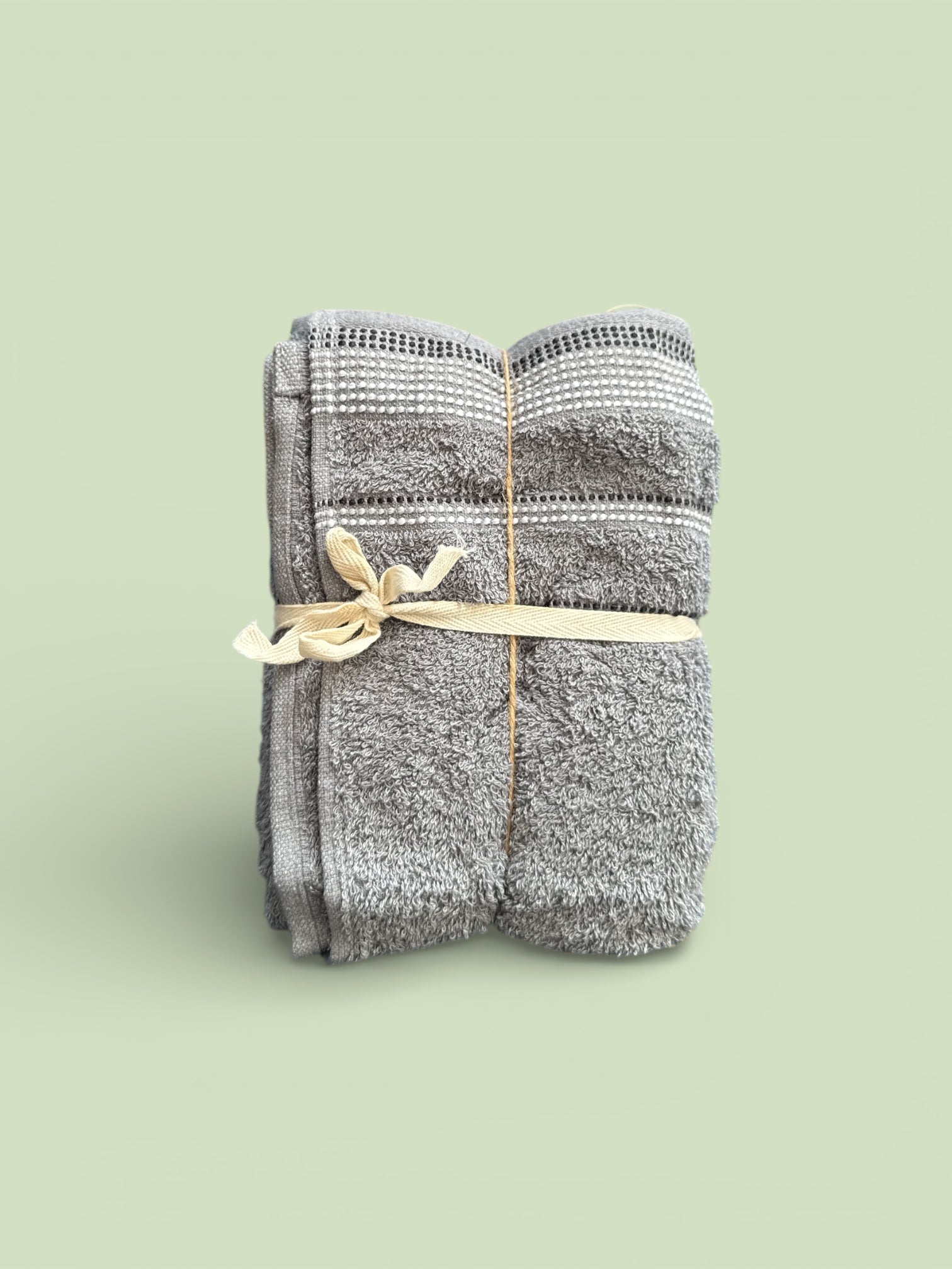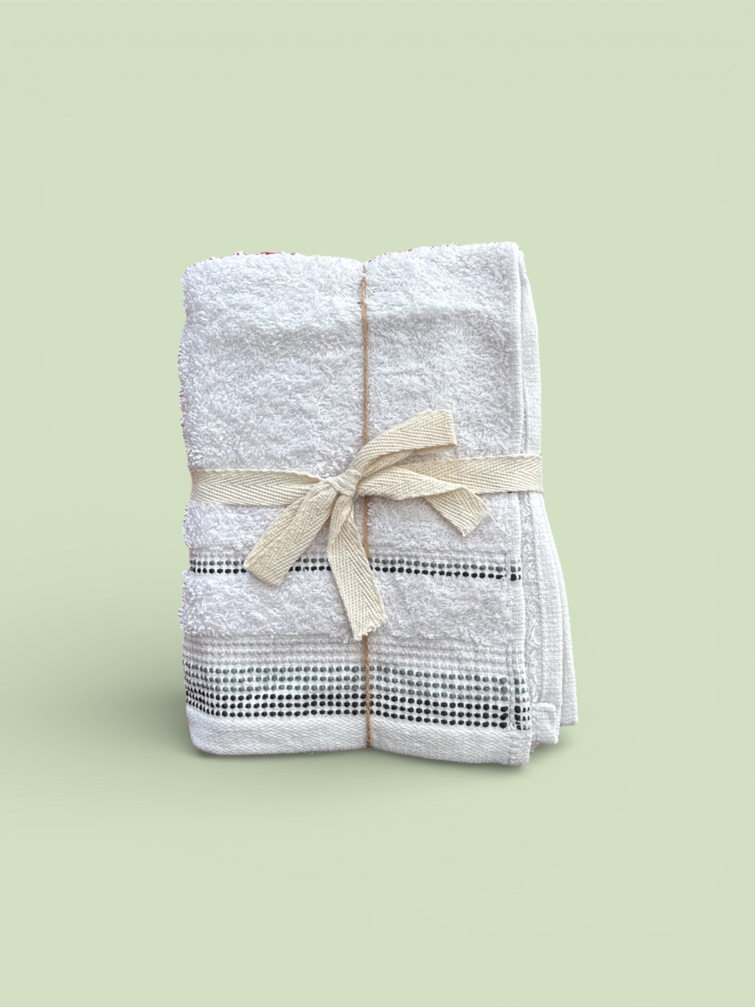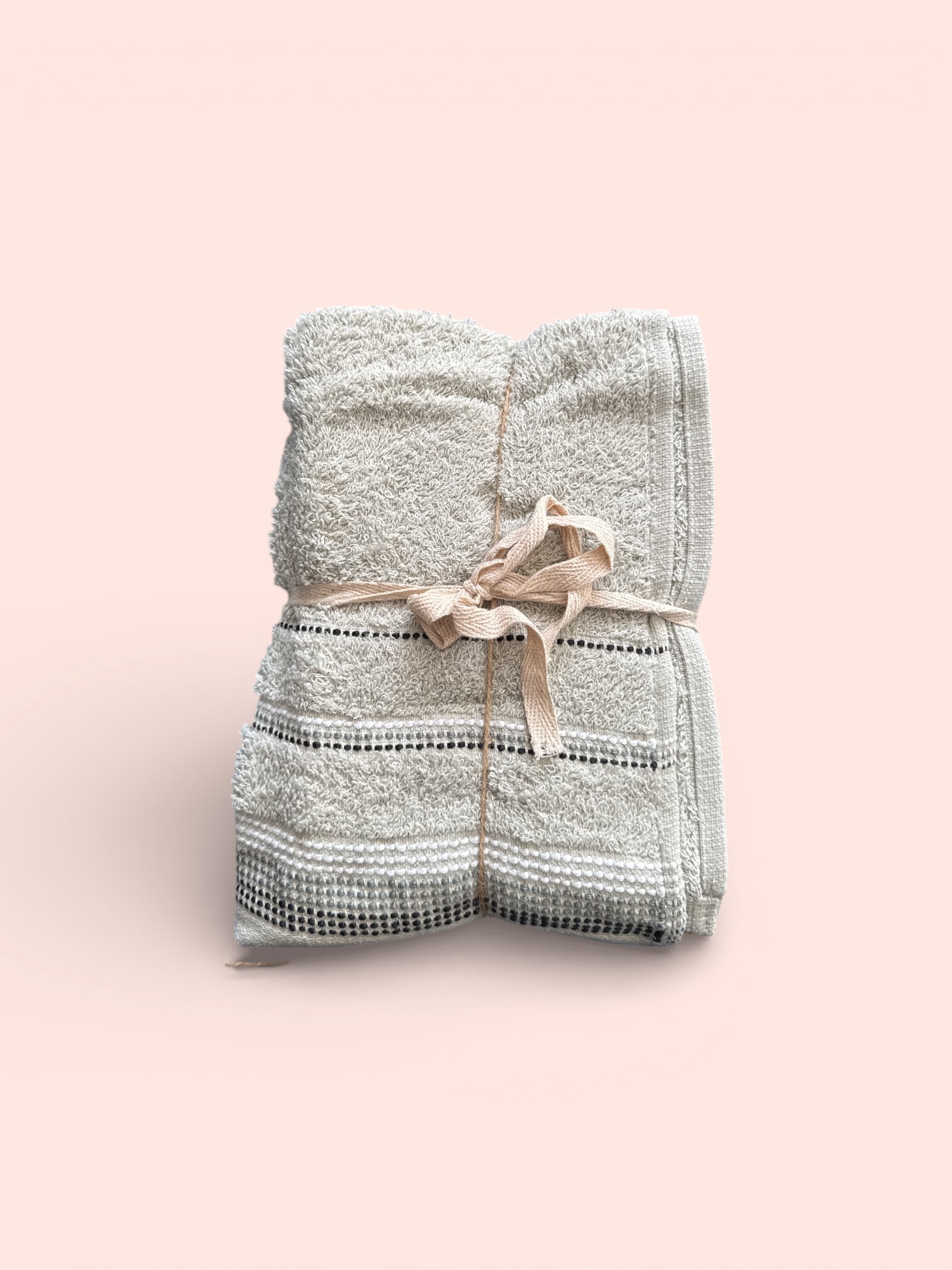 Coppia di asciugamani in morbida spugna, piacevole al tatto e altamente assorbente. Il design è impreziosito da righe di ricami colorati che donano un tocco elegante e vivace, valorizzando il set con stile e personalità. Ideali per l’uso quotidiano, uniscono comfort, qualità e cura dei dettagli, adattandosi facilmente a diversi stili di bagno.