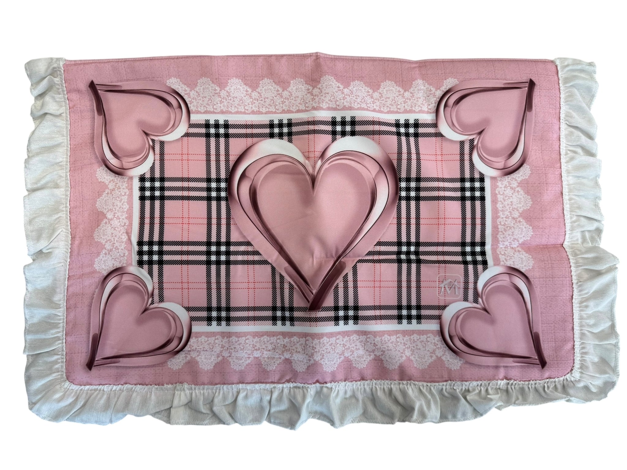 Copri fornello imbottito con rouche, fantasia tartan con cuori rosa, misura 73x46cm