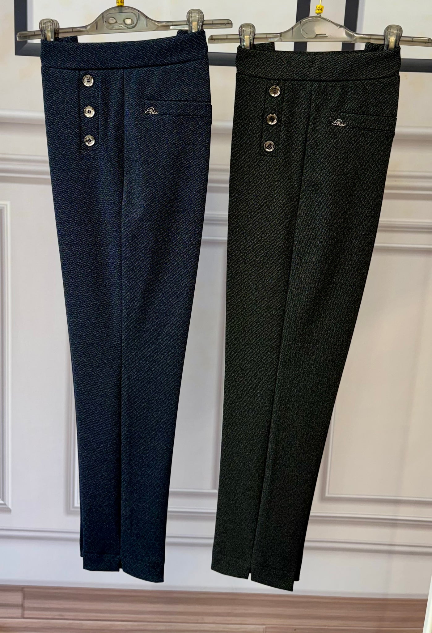 Pantaloni in tessuto elasticizzato, pensati per offrire comfort e una vestibilità impeccabile.Il design è arricchito da finti taschini loggati e da un raffinato filo di bottoncini decorativi, per un tocco distintivo e femminile.Perfetti per completare look sia casual chic che più ricercati.