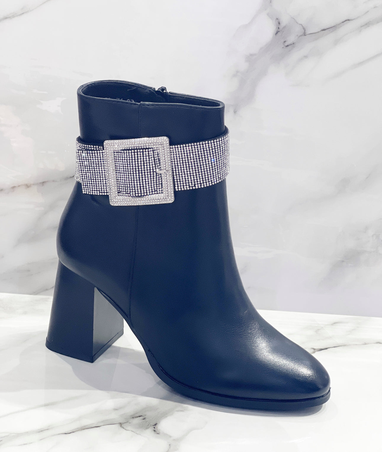 Stivaletto in simil pelle con tacco quadrato e cinturino gioiello