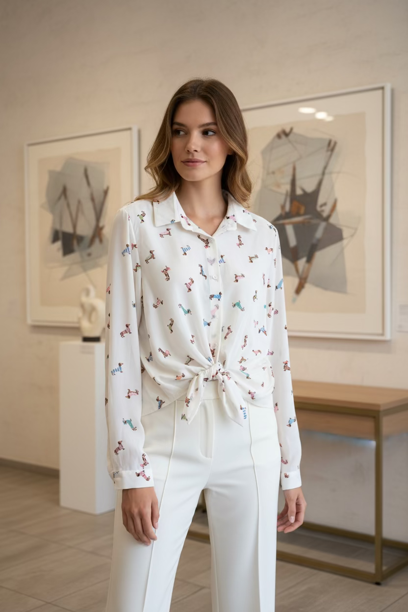 Camicia in tessuto fresco e leggero con fantasia di cagnolini, perfetta per un look casual, originale e confortevole. Vestibilità massimo 104 di giroseno