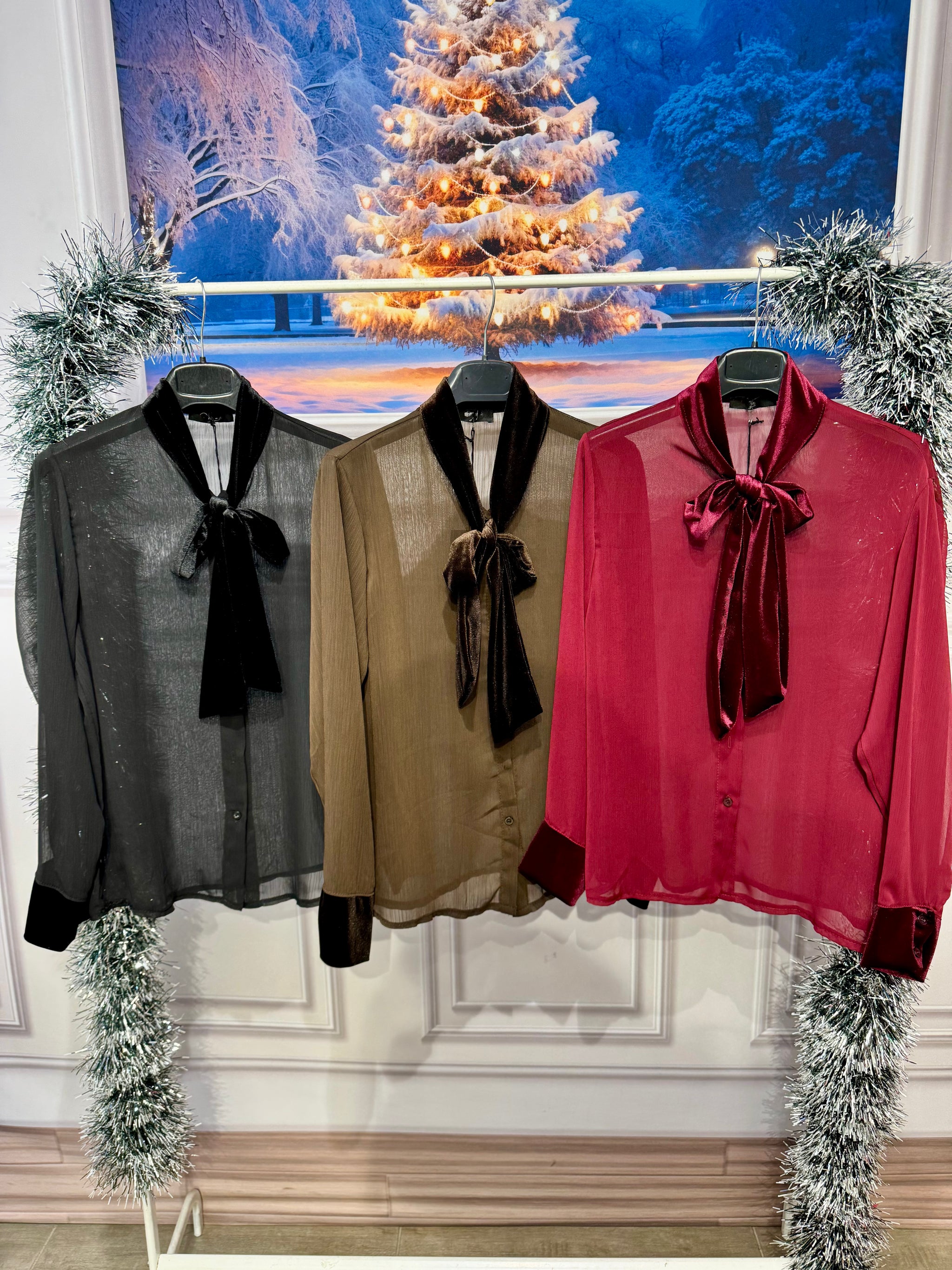 Camicia velata con polsini e collo con fiocco in velluto, massimo 110cm di circonferenza seno