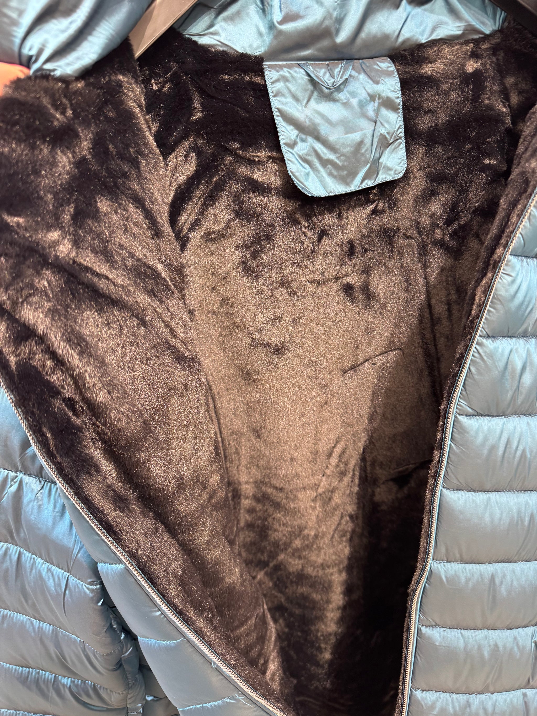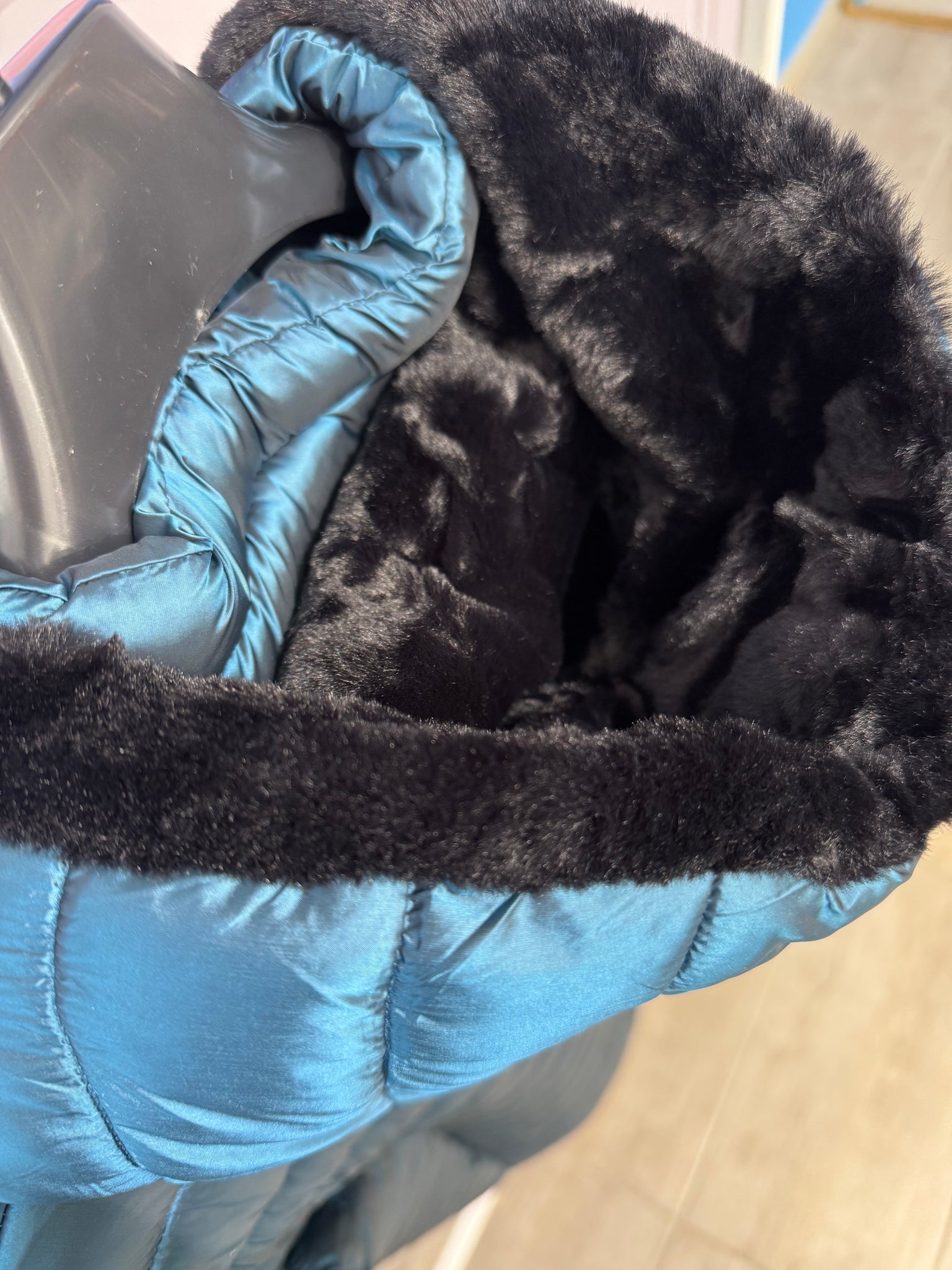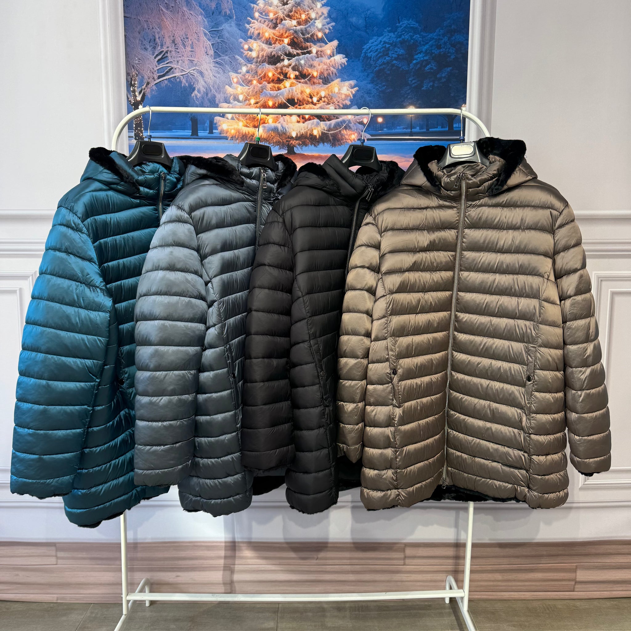 Giubbotto taglie oversize a partire dalla 49 alla 57tessuto cangiante fuori e pelliccia all’interno e nel cappuccio, rimovibile con zip.