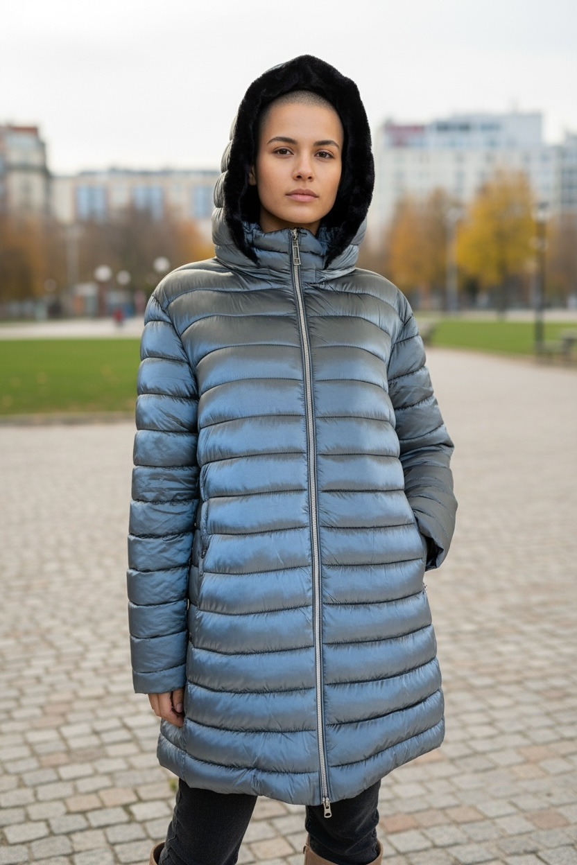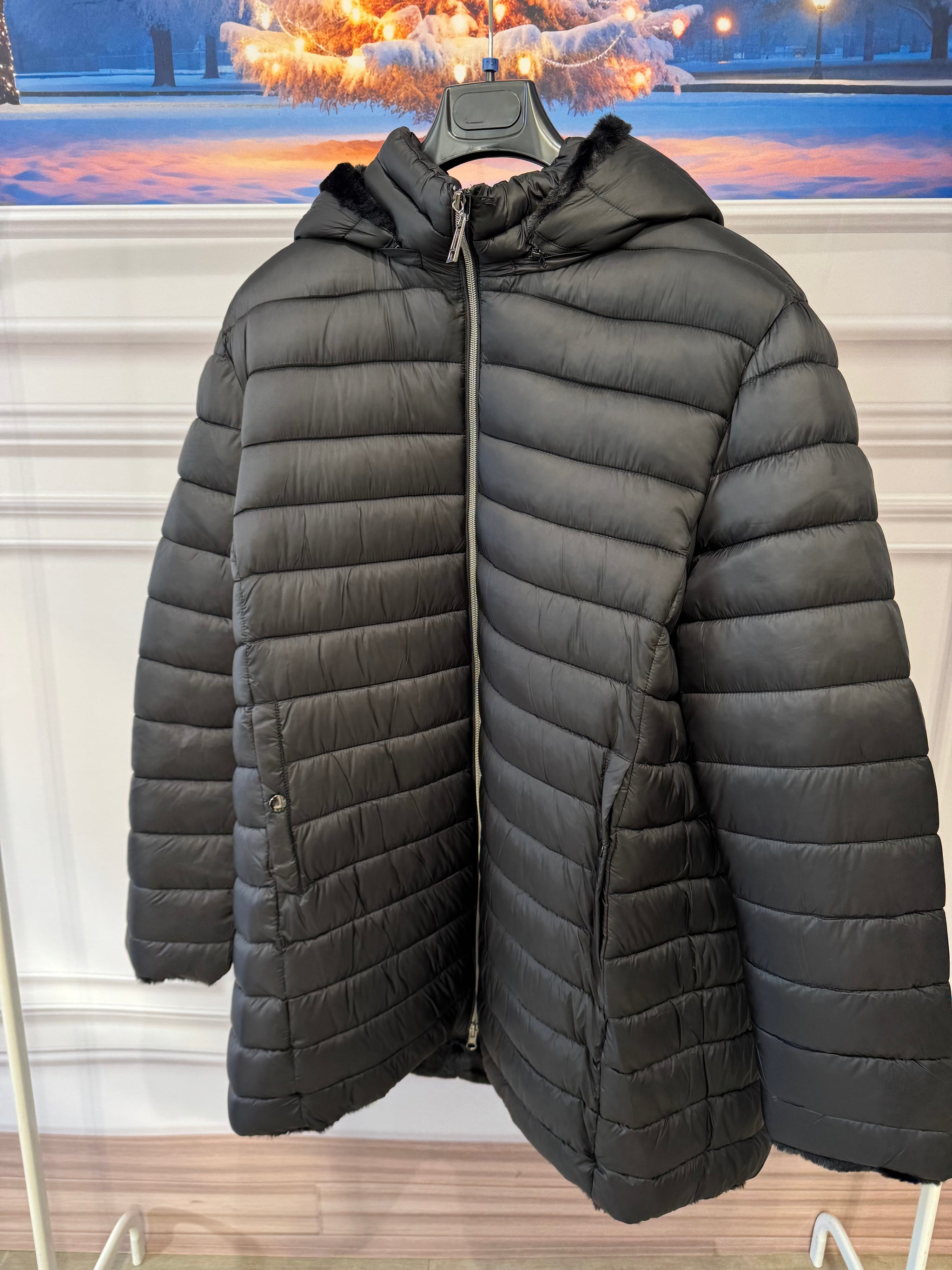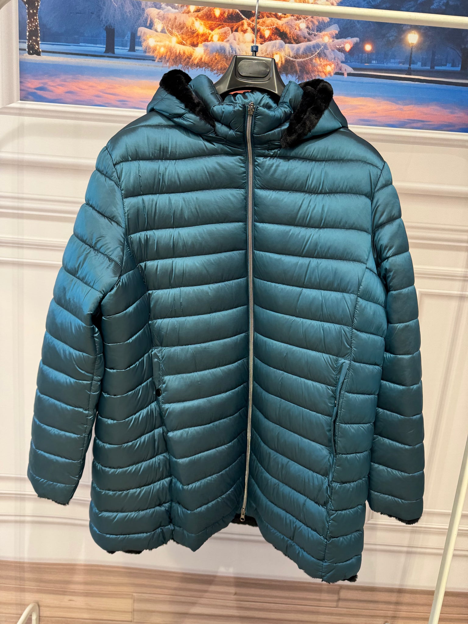 Giubbotto taglie oversize a partire dalla 49 alla 57tessuto cangiante fuori e pelliccia all’interno e nel cappuccio, rimovibile con zip.