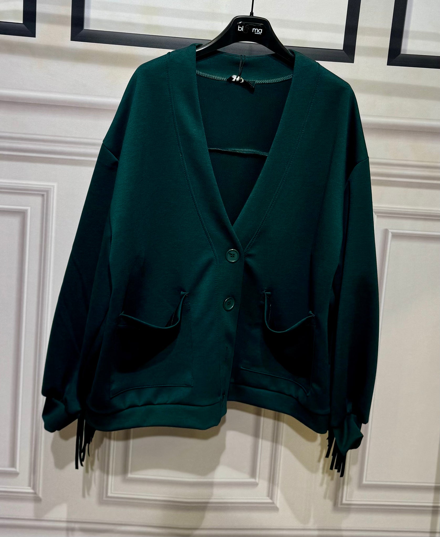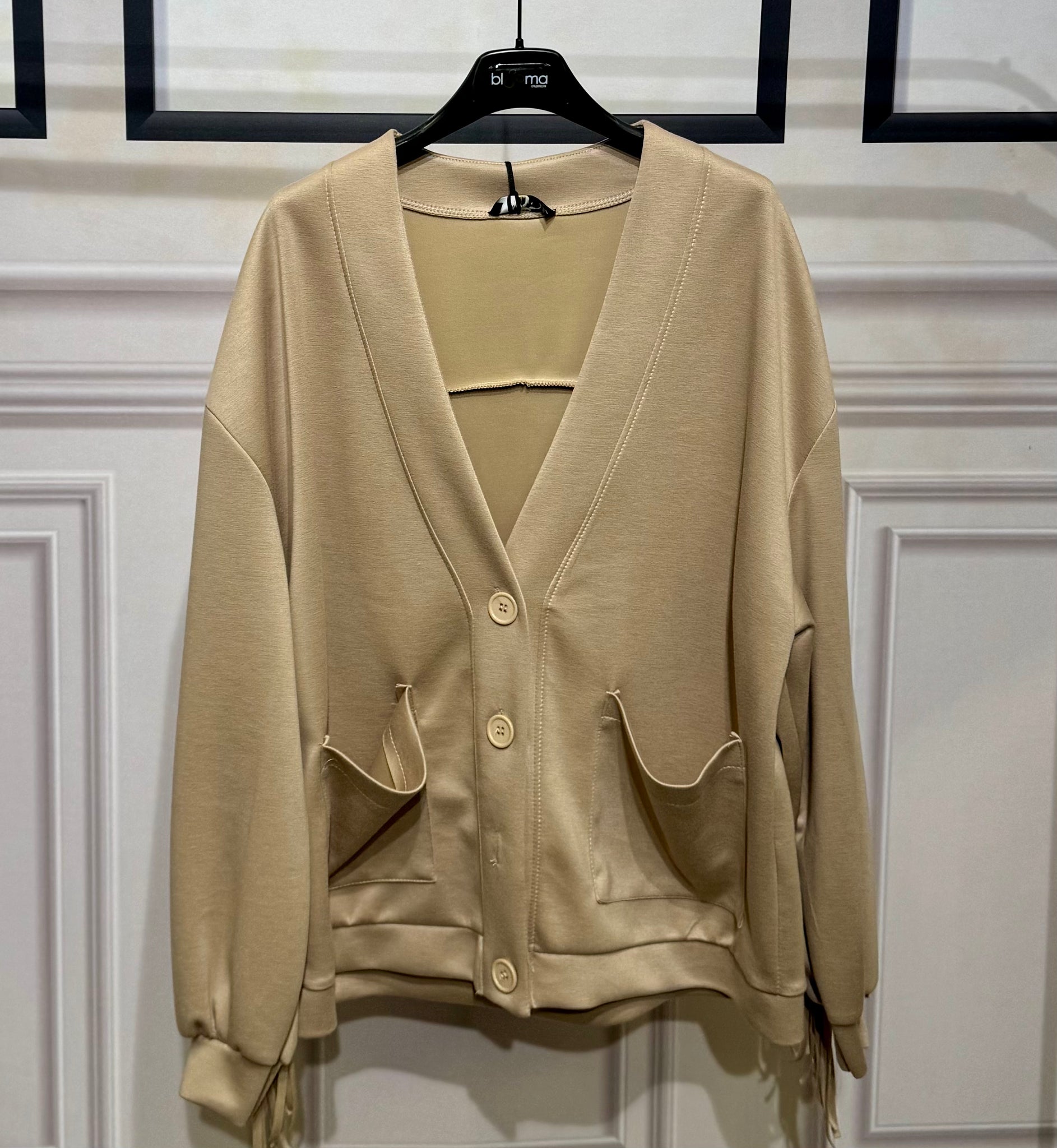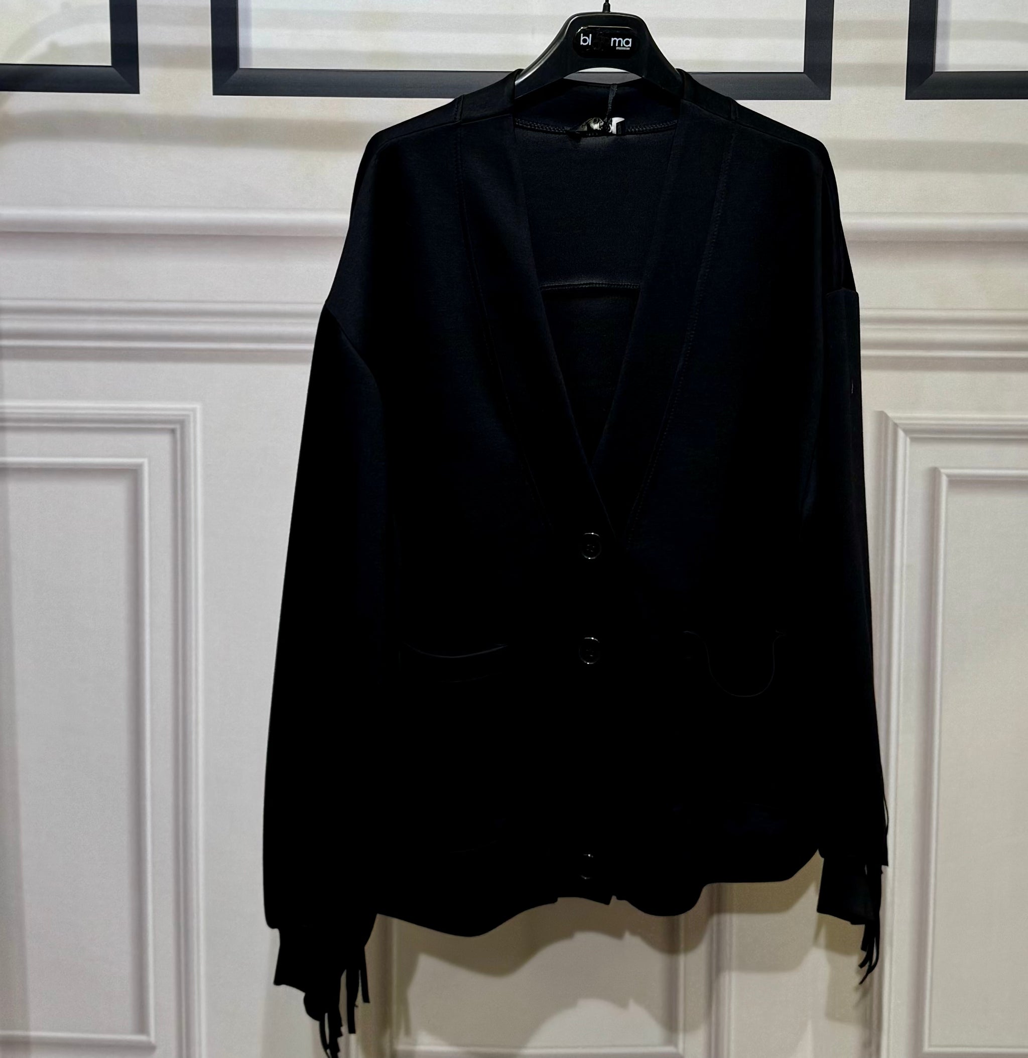 Giacca tessuto nuvola elasticizzata vestibilità fino a 159cm di giroseno e dettaglio frange sulla schiena e sulle maniche