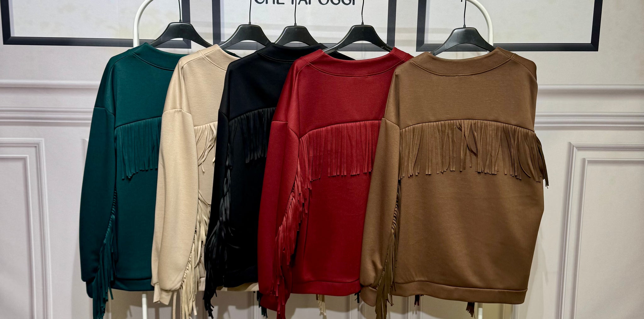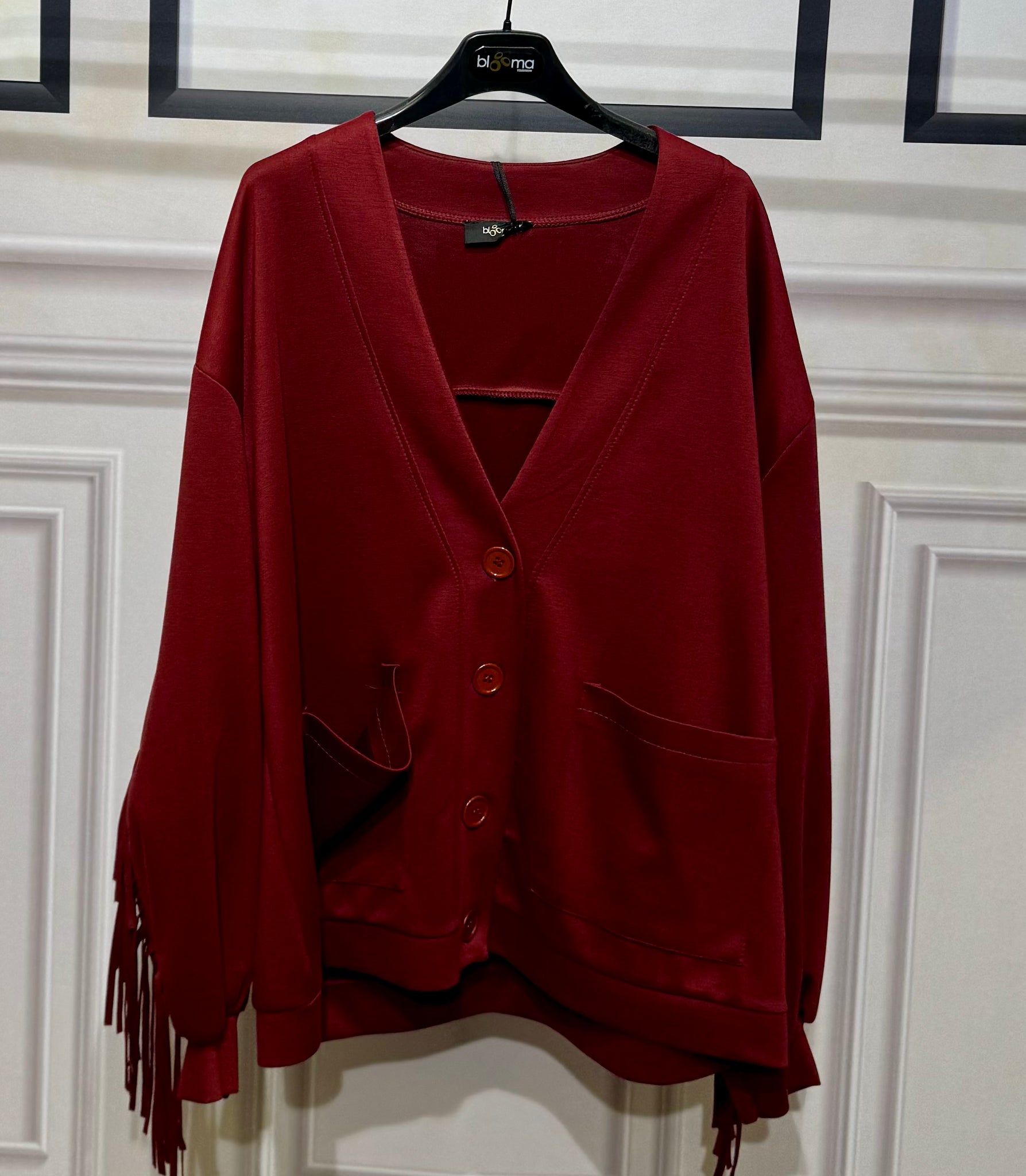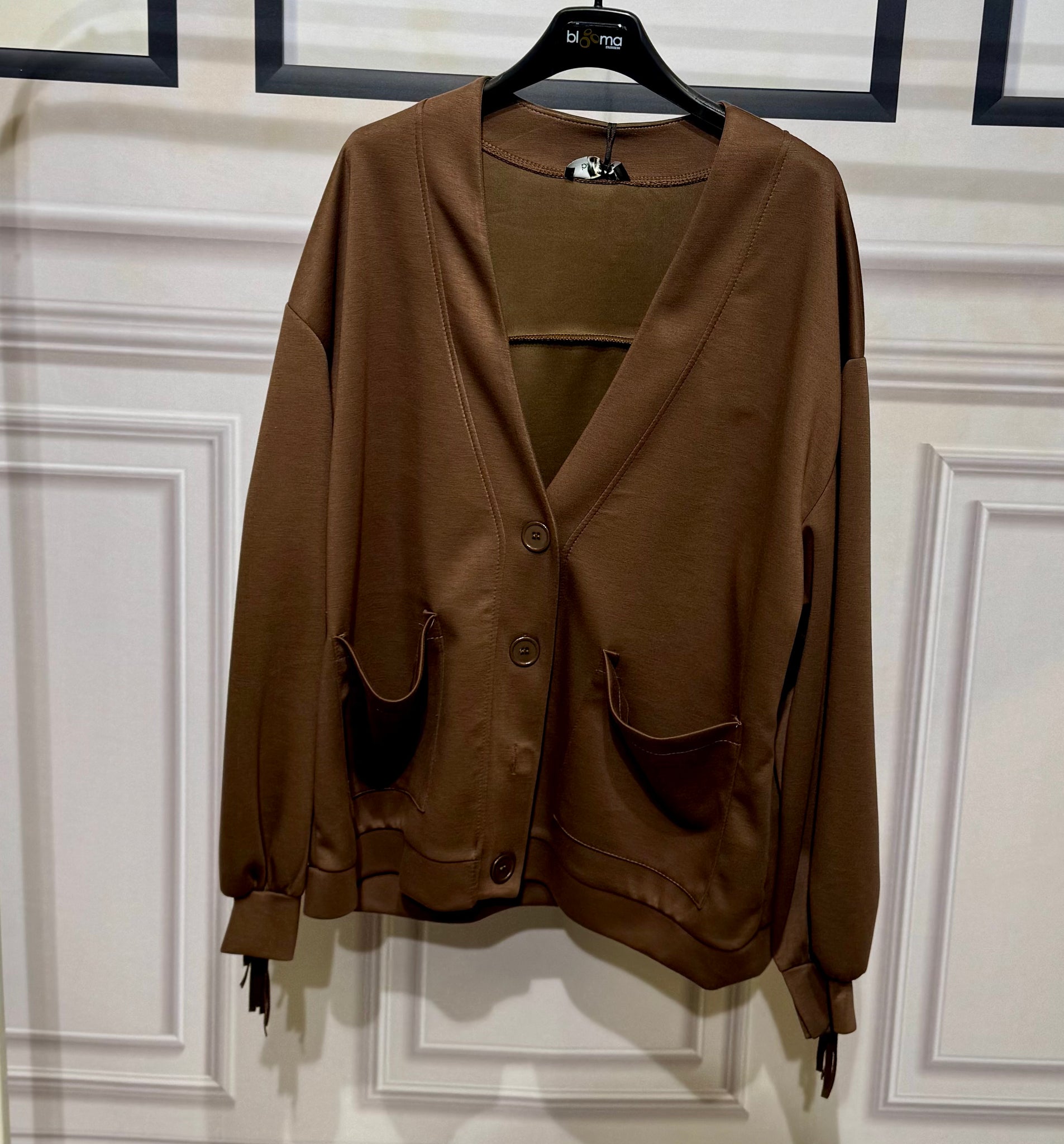 Giacca tessuto nuvola elasticizzata vestibilità fino a 159cm di giroseno e dettaglio frange sulla schiena e sulle maniche