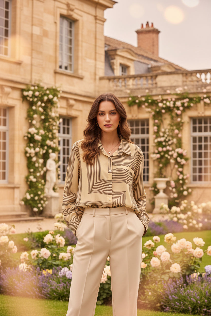 Camicia in tessuto georgette leggera e fluida, con fantasia geometrica a righe in colori a contrasto. Un capo elegante e moderno, perfetto per look versatili e di carattere. Vestibilità da 120cm a 128cm di giroseno