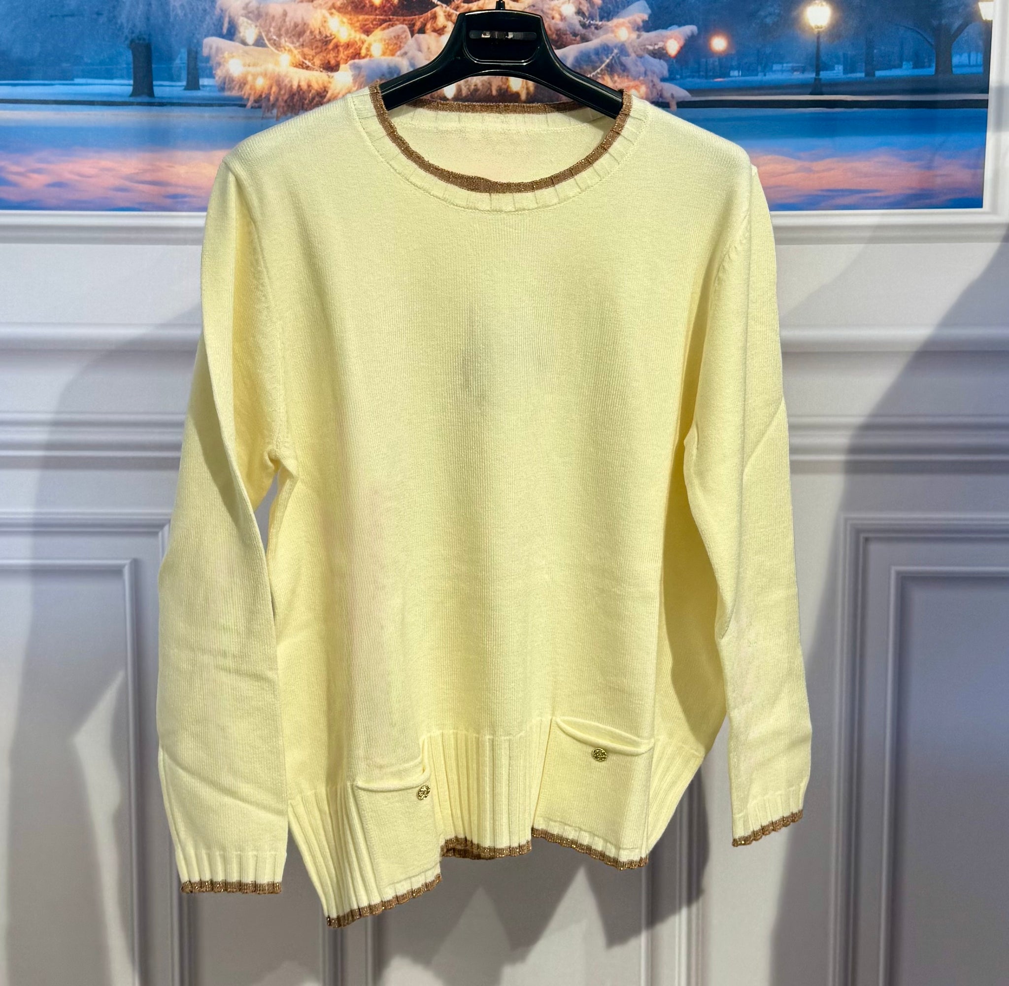 Maglioncino in lana pettinata con tasche e dettaglio cioccolato laminato sul colletto, polsino e orlo del Maglioncino . Vestibilità da 112cm a 150cm di giro seno