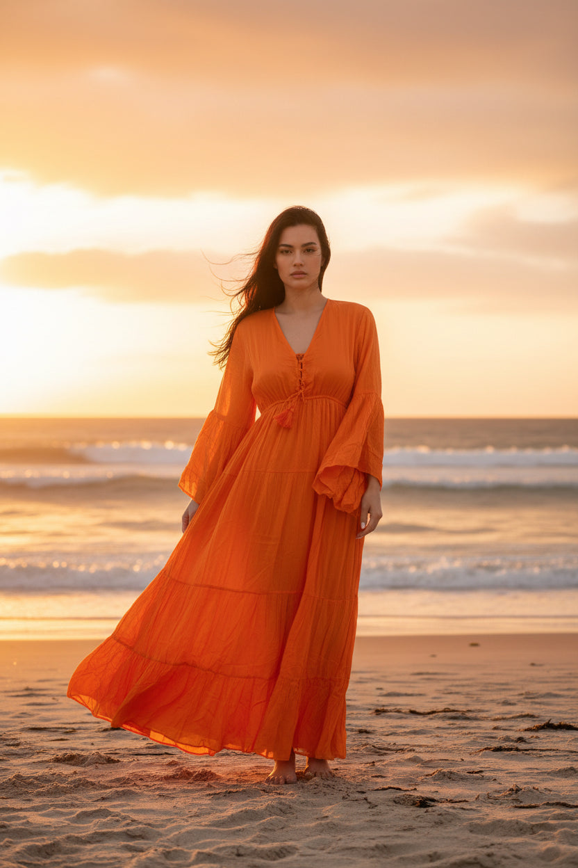 Abito lungo in cotone leggero con scollo effetto corsetto e lacci regolabili sul davanti. Elastico sotto il seno per una vestibilità comoda e femminile. Gonna lunga e fluida con delicato scollo sulla schiena che dona un tocco elegante.