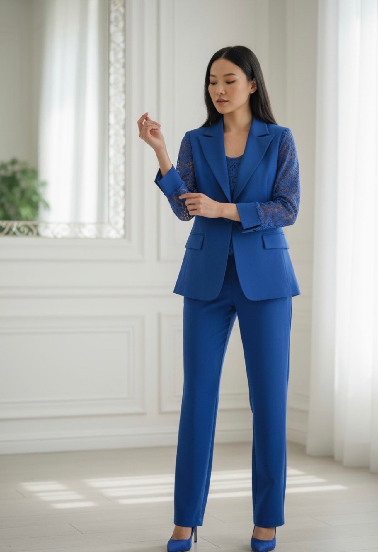 Coordinato tre pezzi elegante e raffinato: sottogiacca in pizzo dal fascino delicato, giacca strutturata con maniche in pizzo trasparente per un tocco femminile e sofisticato, e pantalone sartoriale dal taglio impeccabile che slancia la figura. Perfetto per cerimonie ed eventi speciali.