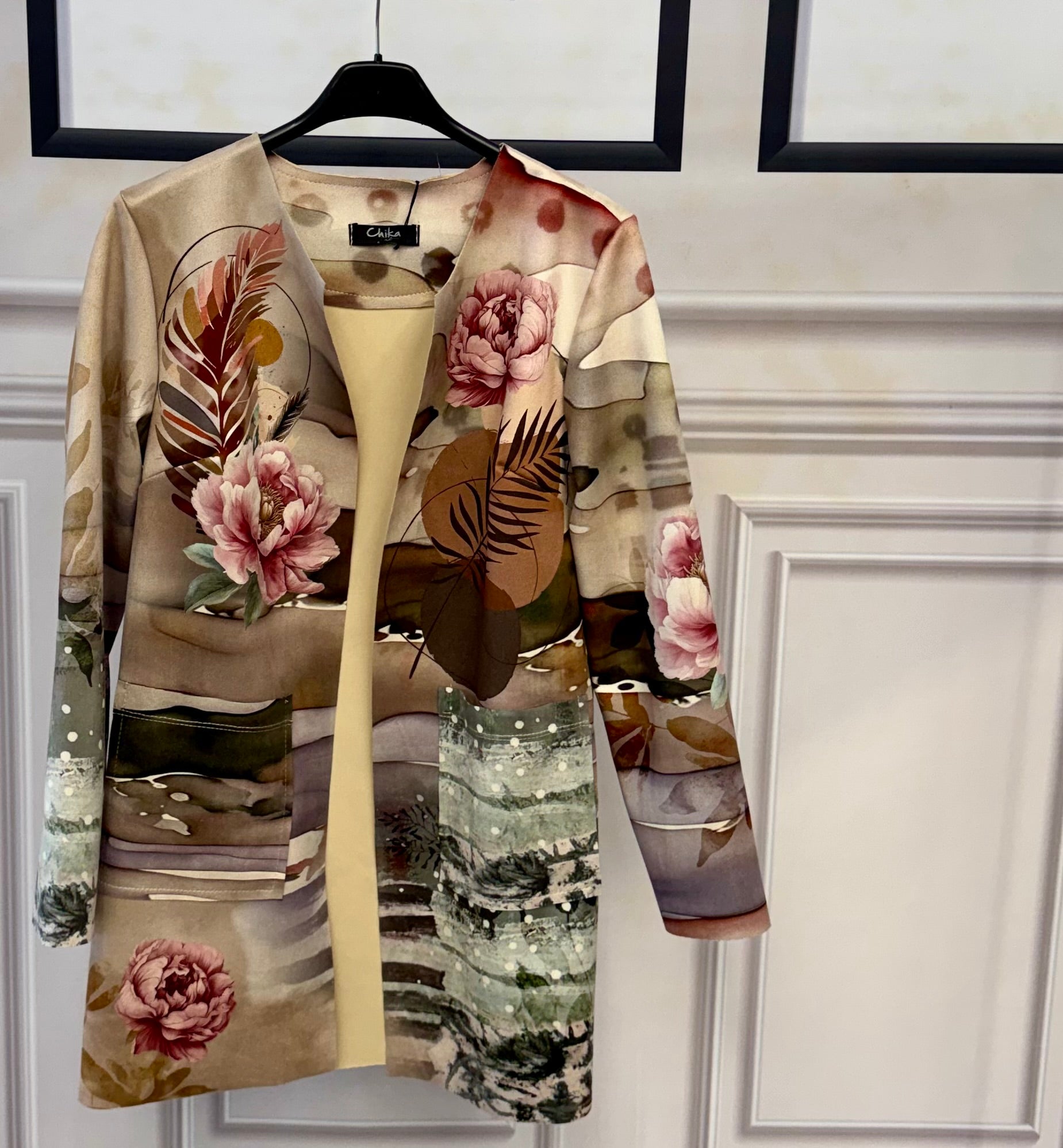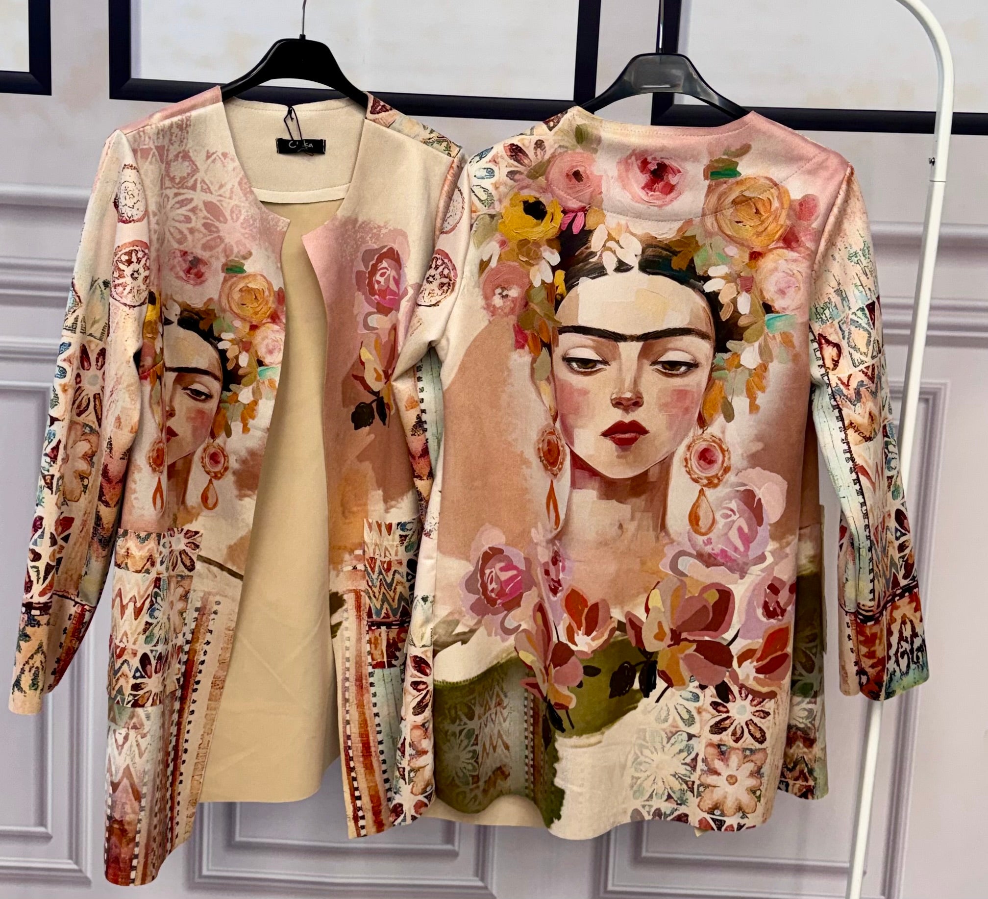 Giacca in morbido dainetto, piacevole al tatto e confortevole da indossare. Il design si distingue per le fantasie stampate sia sul davanti che sulla schiena, che donano carattere e originalità al capo. Modello versatile, perfetto per completare look casual o più ricercati.