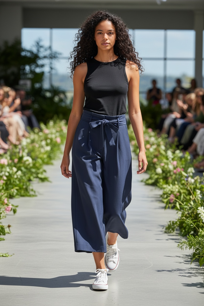 Pantaloni dalla gamba ampissima, con vita alta, elastico solo sulla parte posteriore e cinturino in vita. La vestibilità fluida e le gambe larghe donano un look elegante e comodo, mentre l’elastico posteriore assicura comfort senza rinunciare alla forma. Il cinturino in vita definisce la silhouette, creando un equilibrio perfetto tra stile e praticità. Ideali per un look sofisticato e moderno.