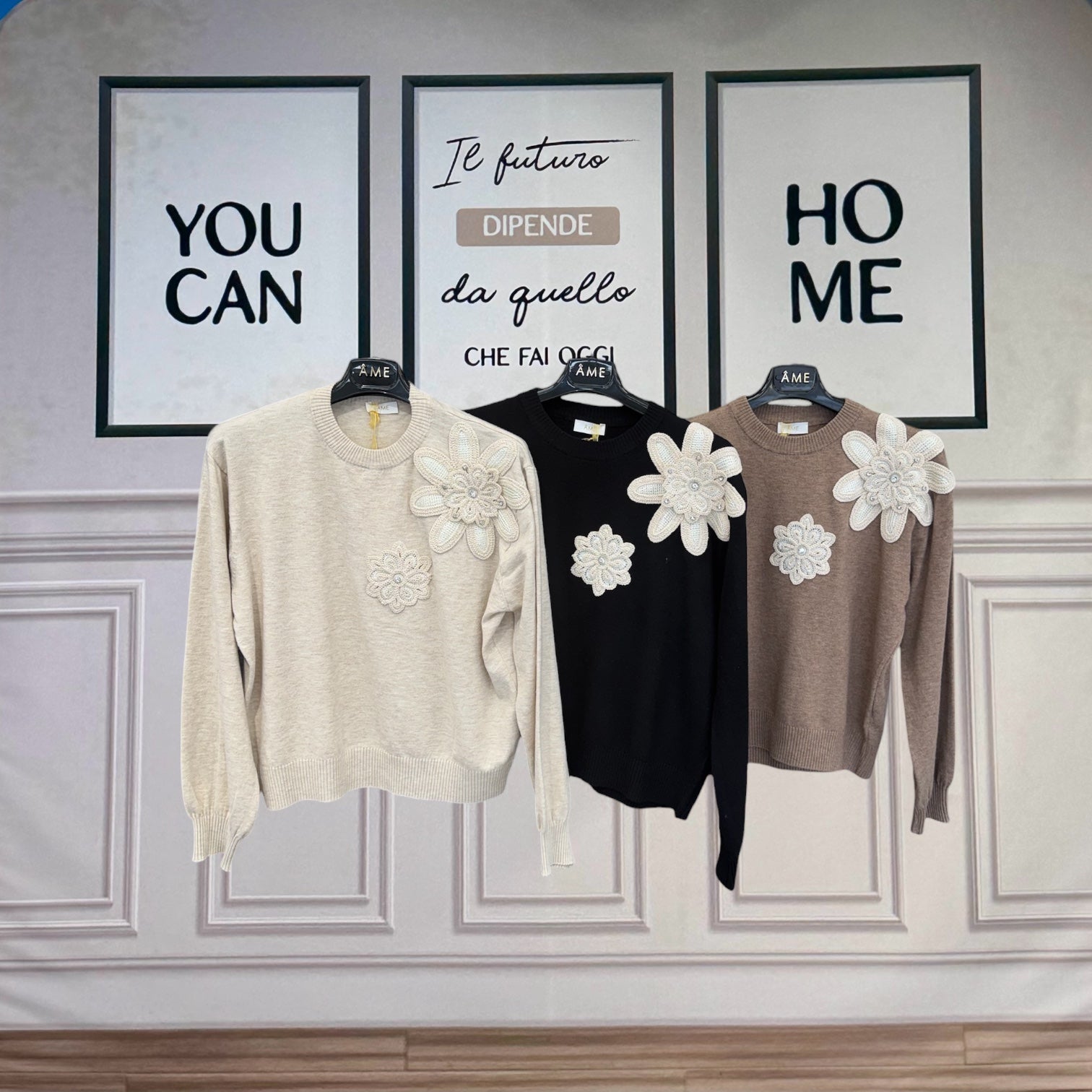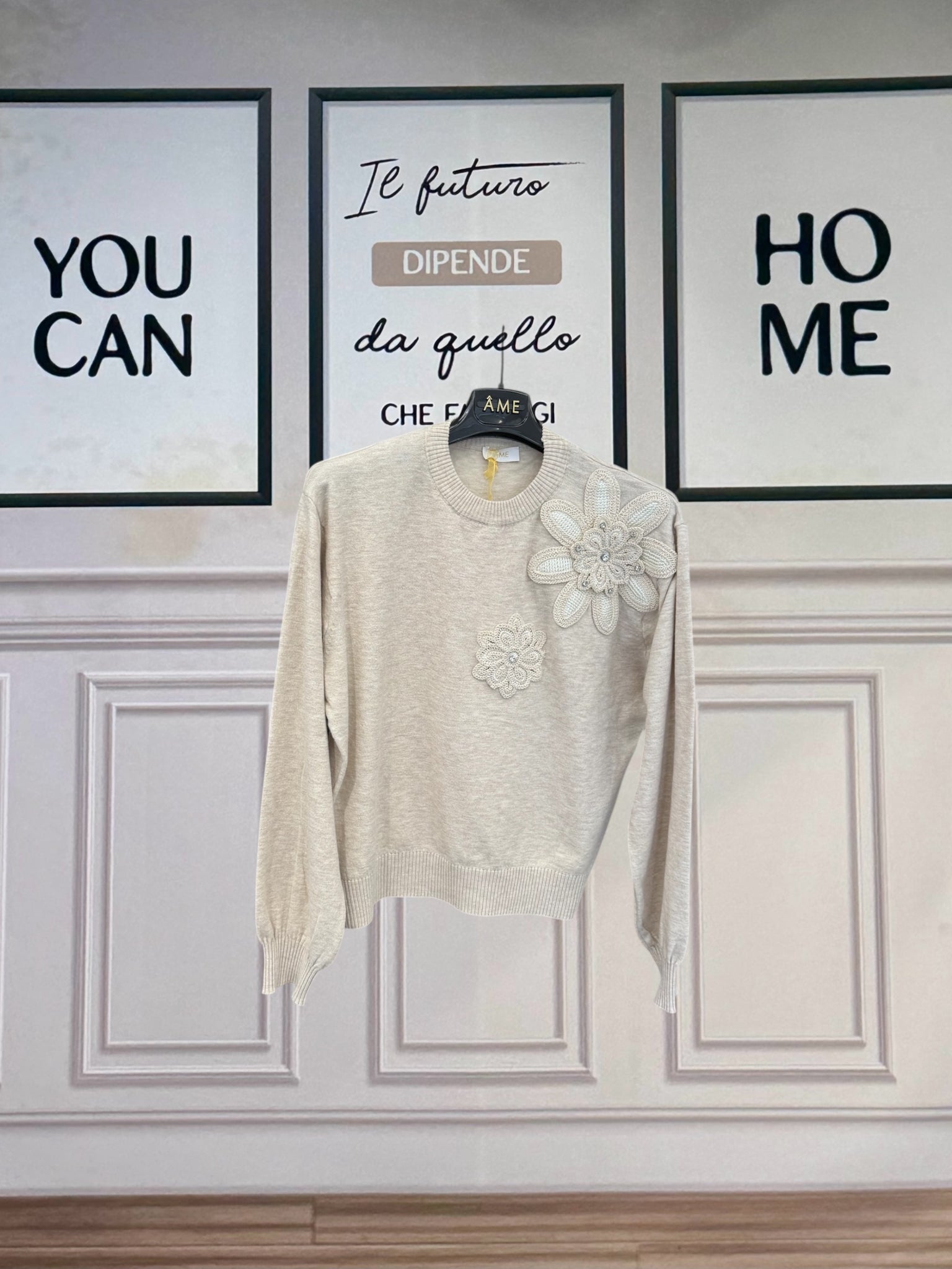 Maglioncino girocollo a costine, realizzato in lana morbida e confortevole. Il design è arricchito da delicati fiori ad uncinetto applicati sulla spalla, impreziositi da strass luminosi che donano un tocco raffinato e femminile. Vestibilità confortevole, ideale per valorizzare look casual chic o outfit più ricercati. Vestibilità da 120cm a 170cm di giroseno