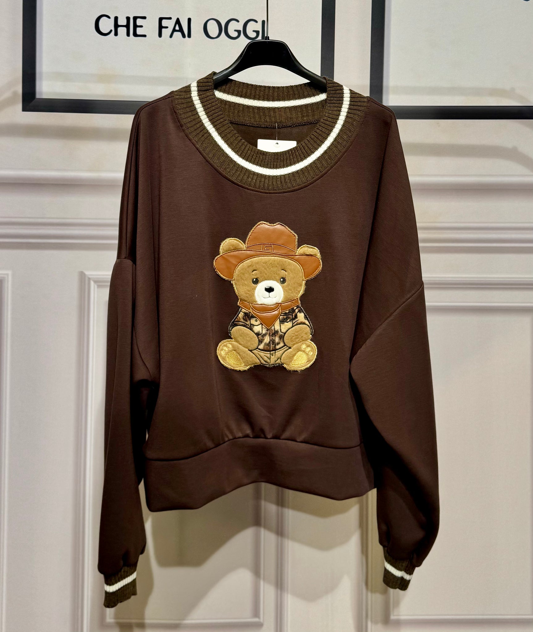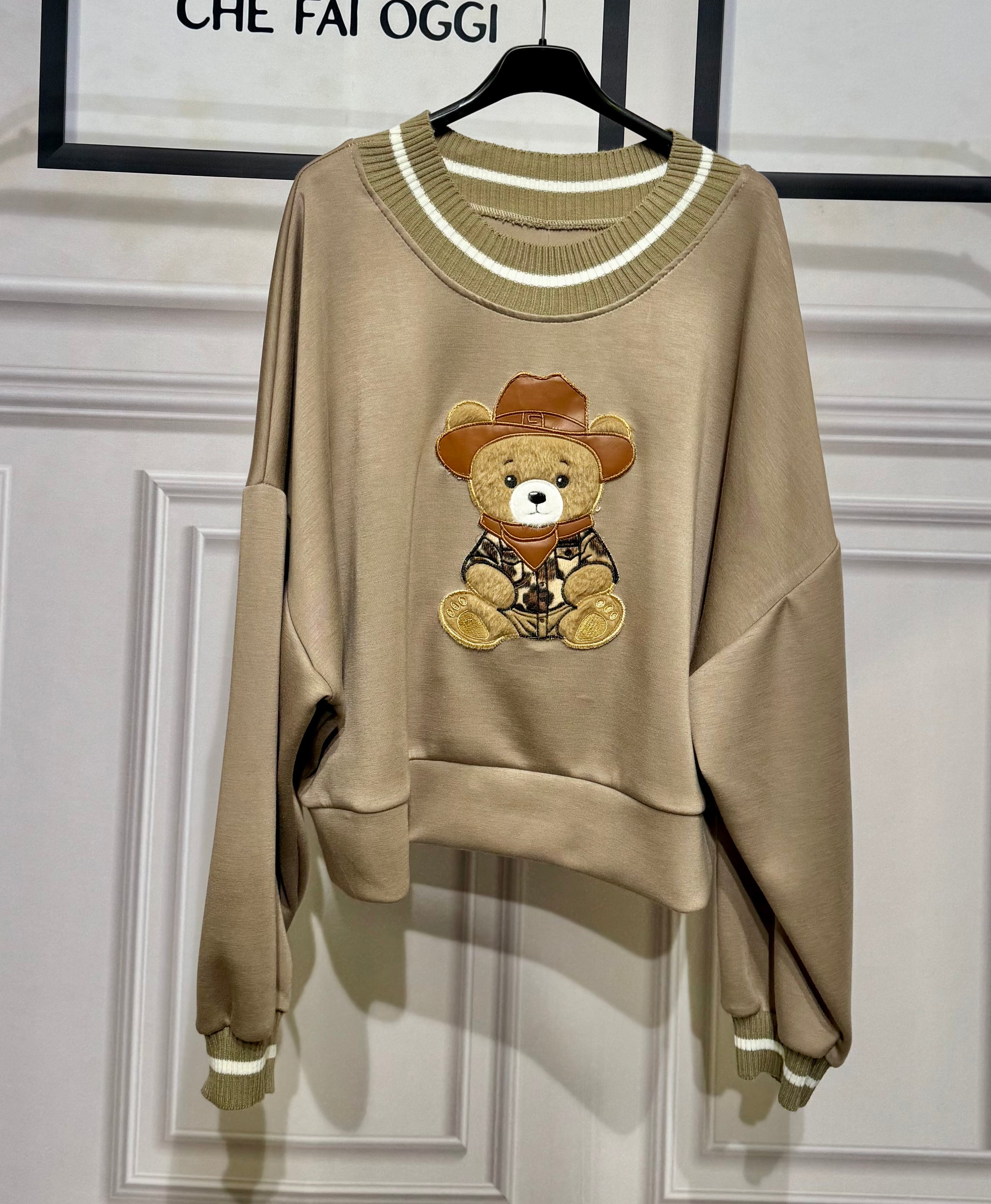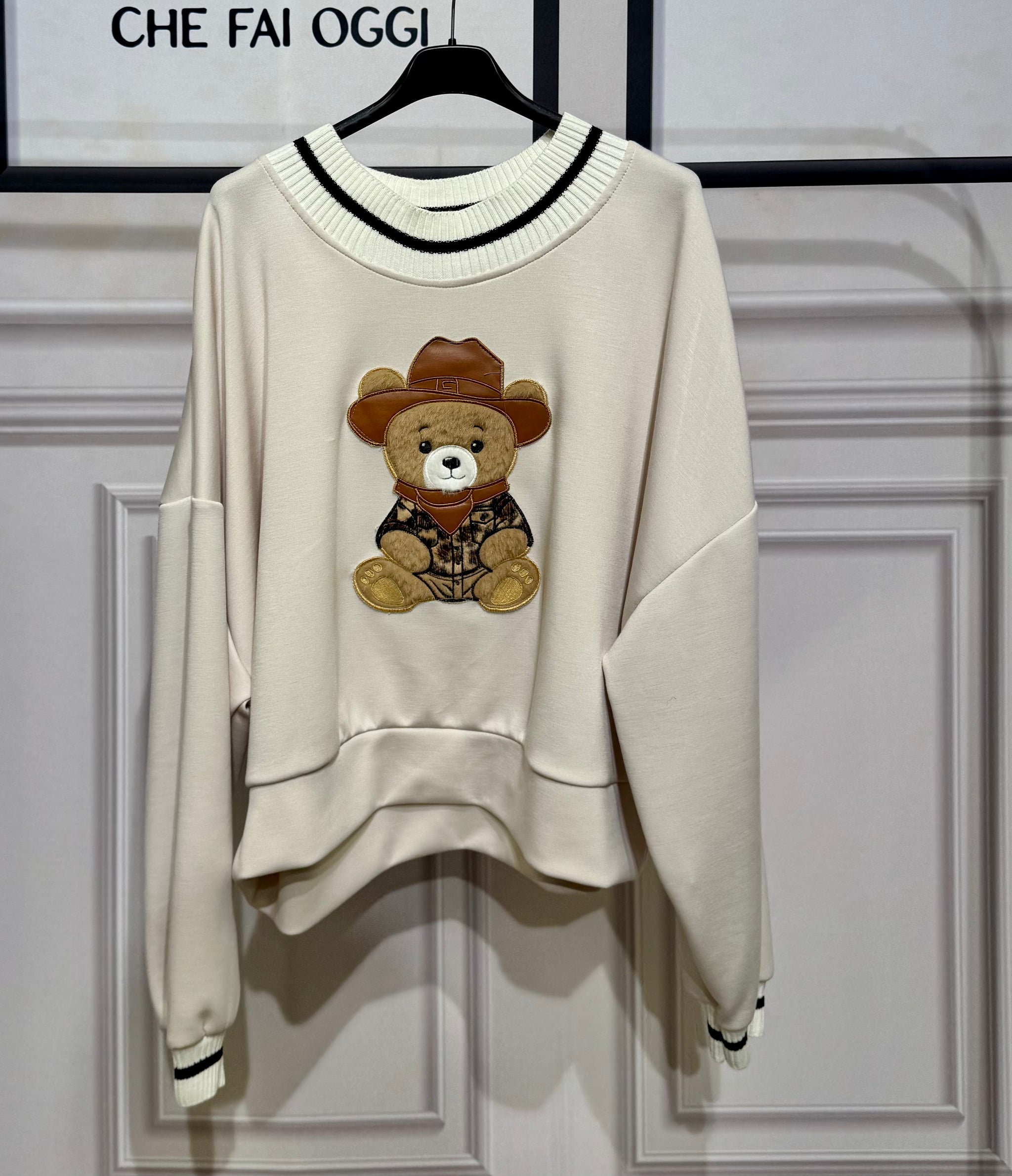 Felpa oversize tessuto nuvola con orsetto in rilievo ,collo e polsino a costine