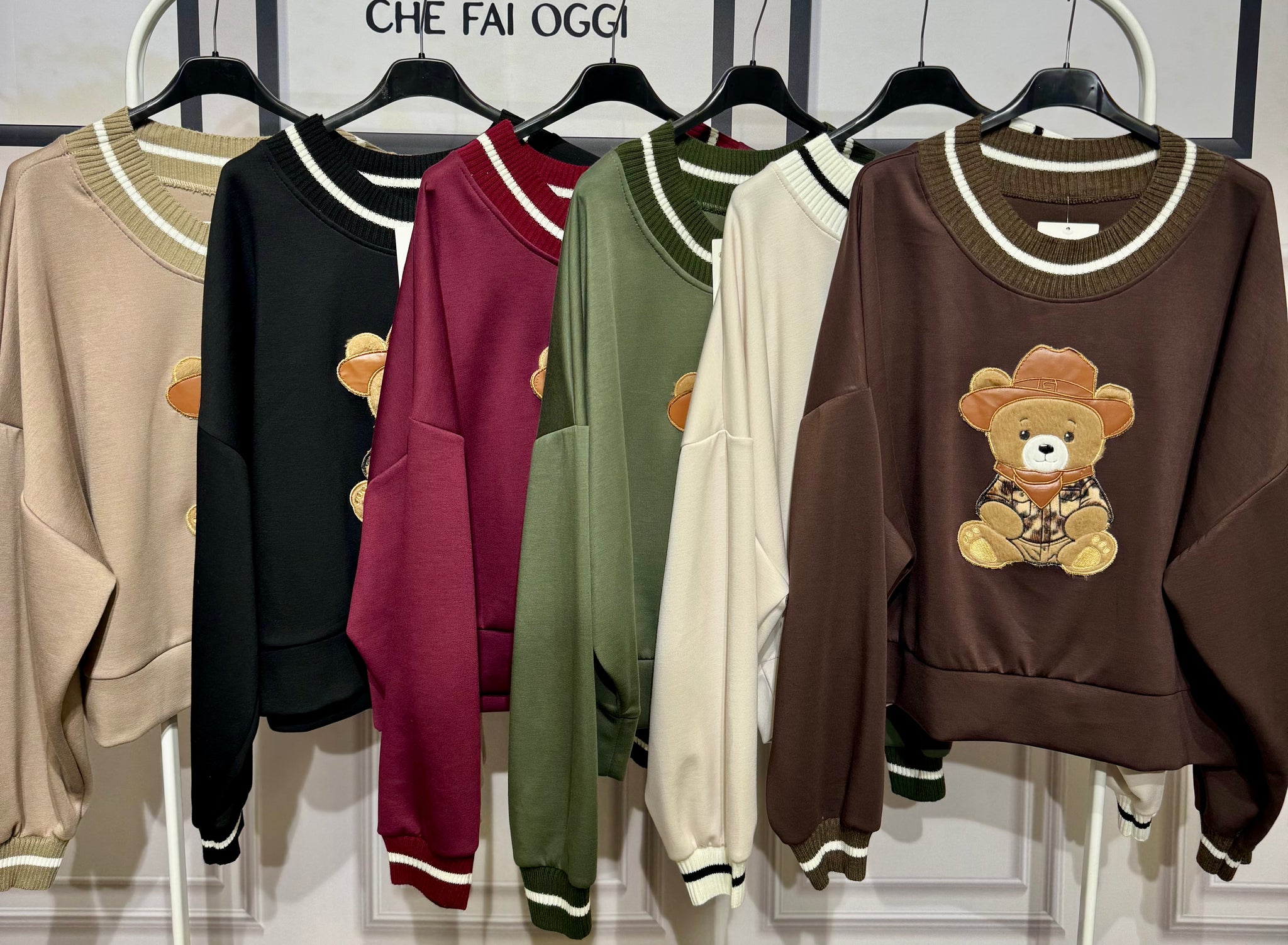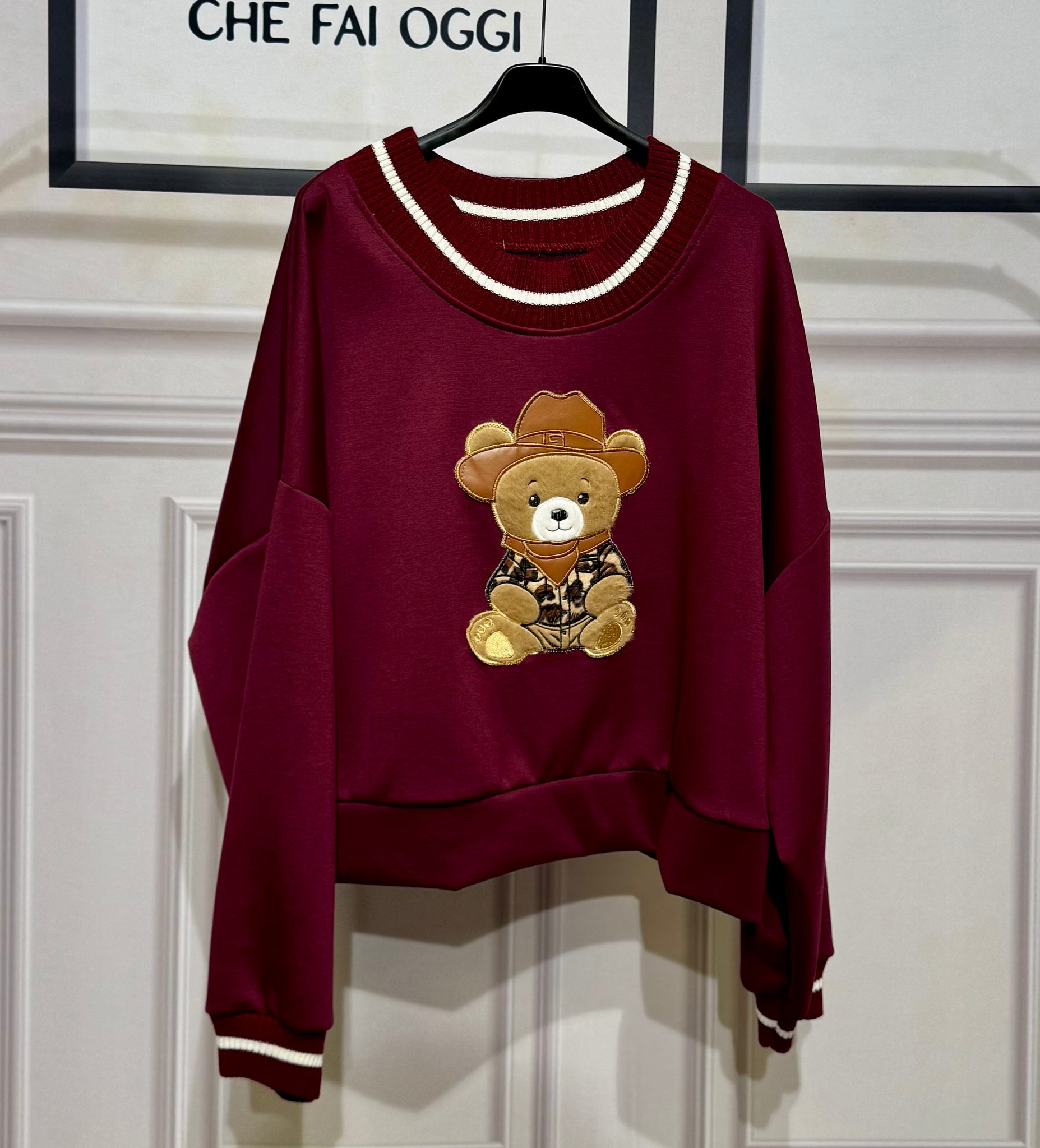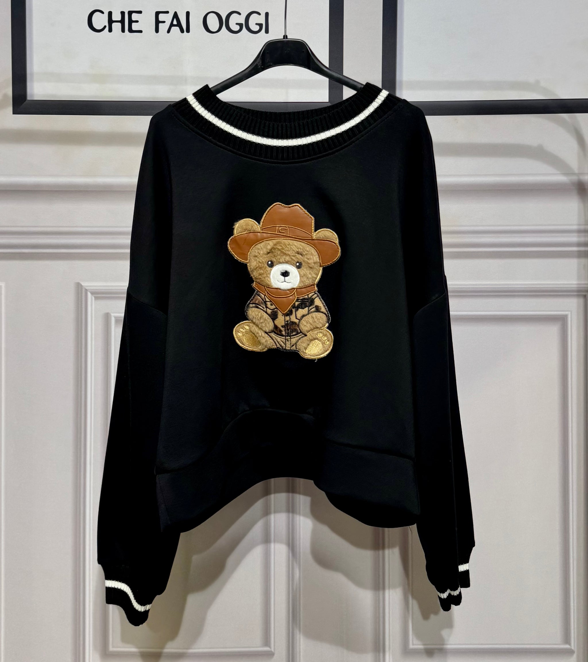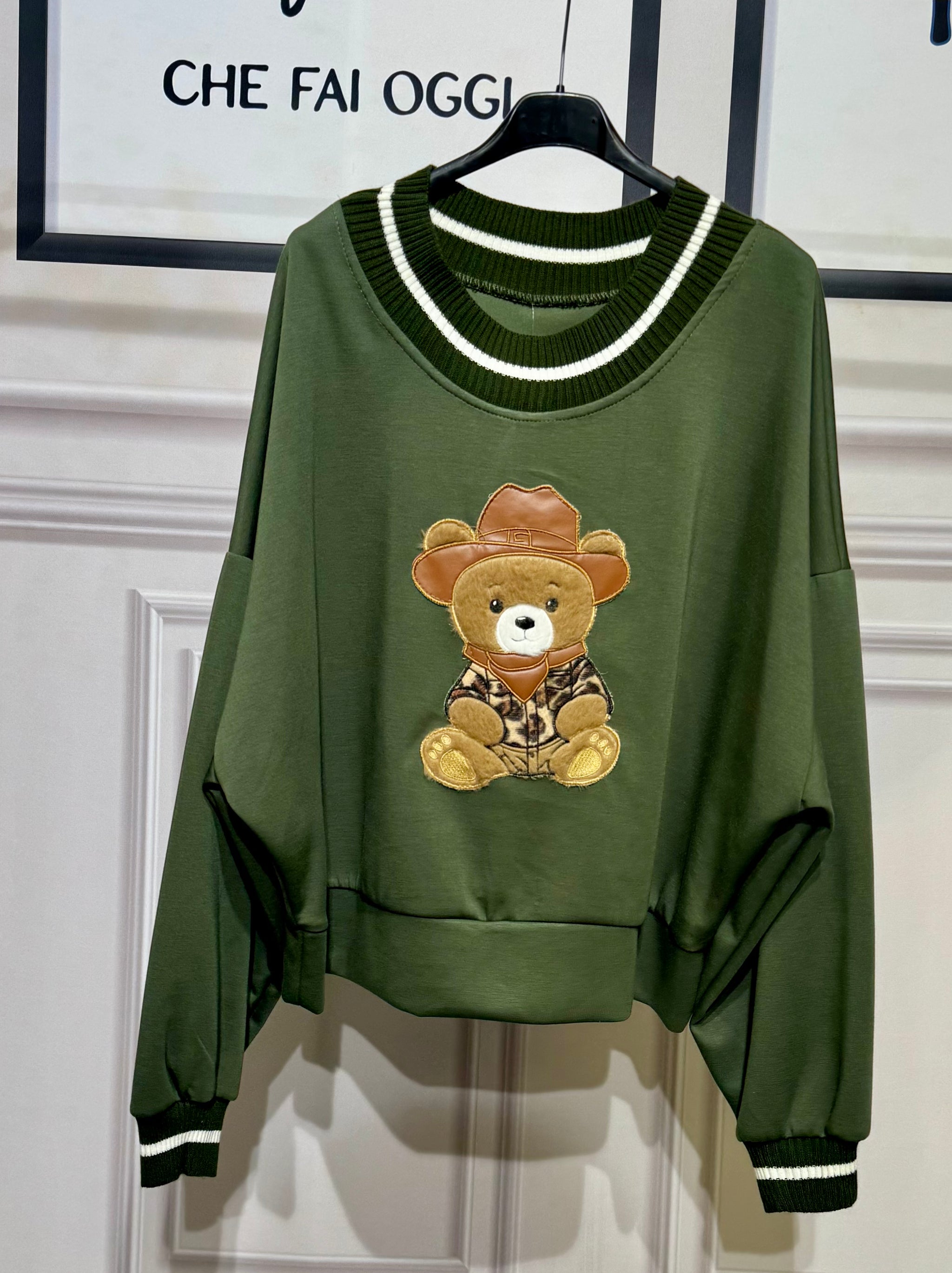 Felpa oversize tessuto nuvola con orsetto in rilievo ,collo e polsino a costine