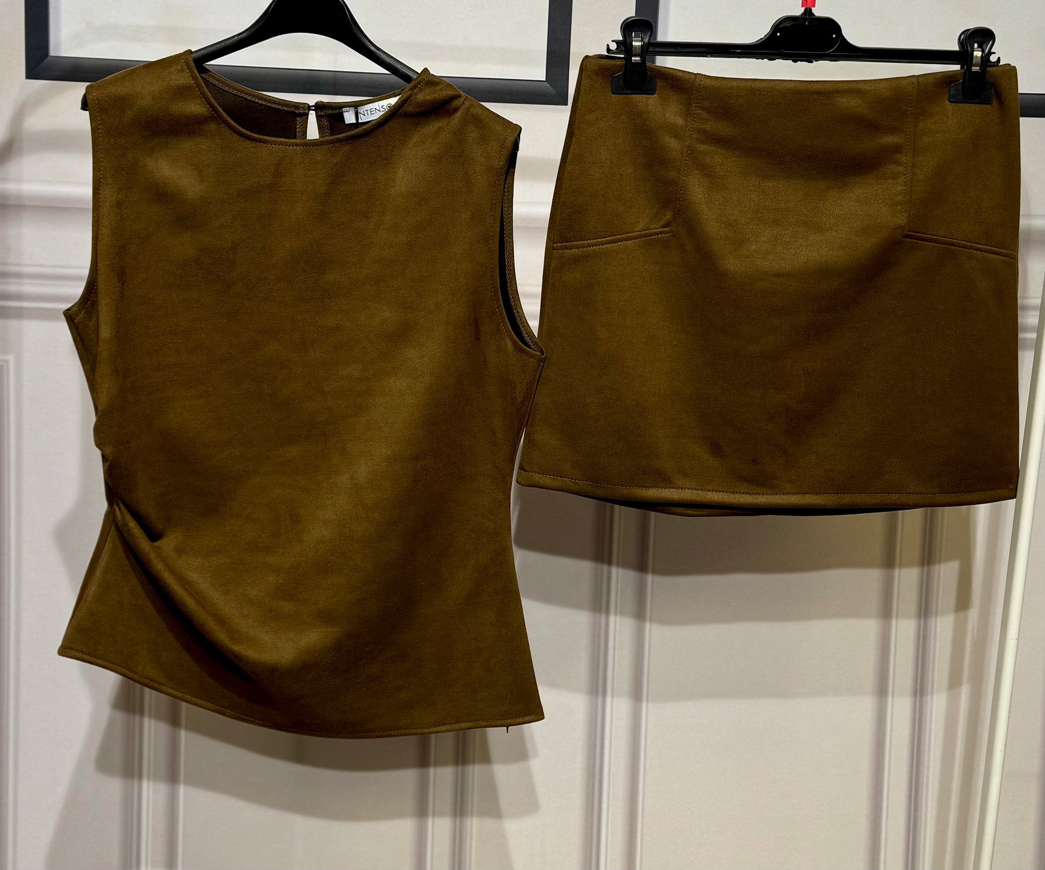 Coordinato in eco camoscio . Top con aggrappo laterale giro manica vestibilità fino a 110cm di giroseno. Mini gonna con zip posteriore vestibilità fino a 100cm di giro seno