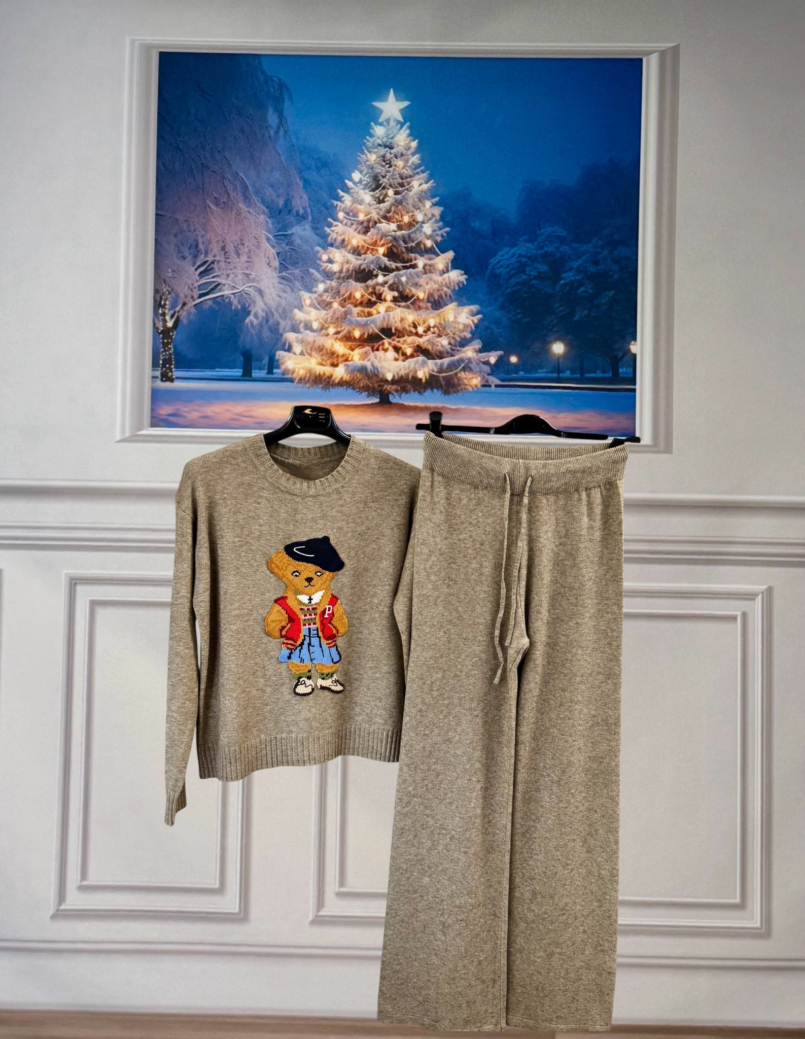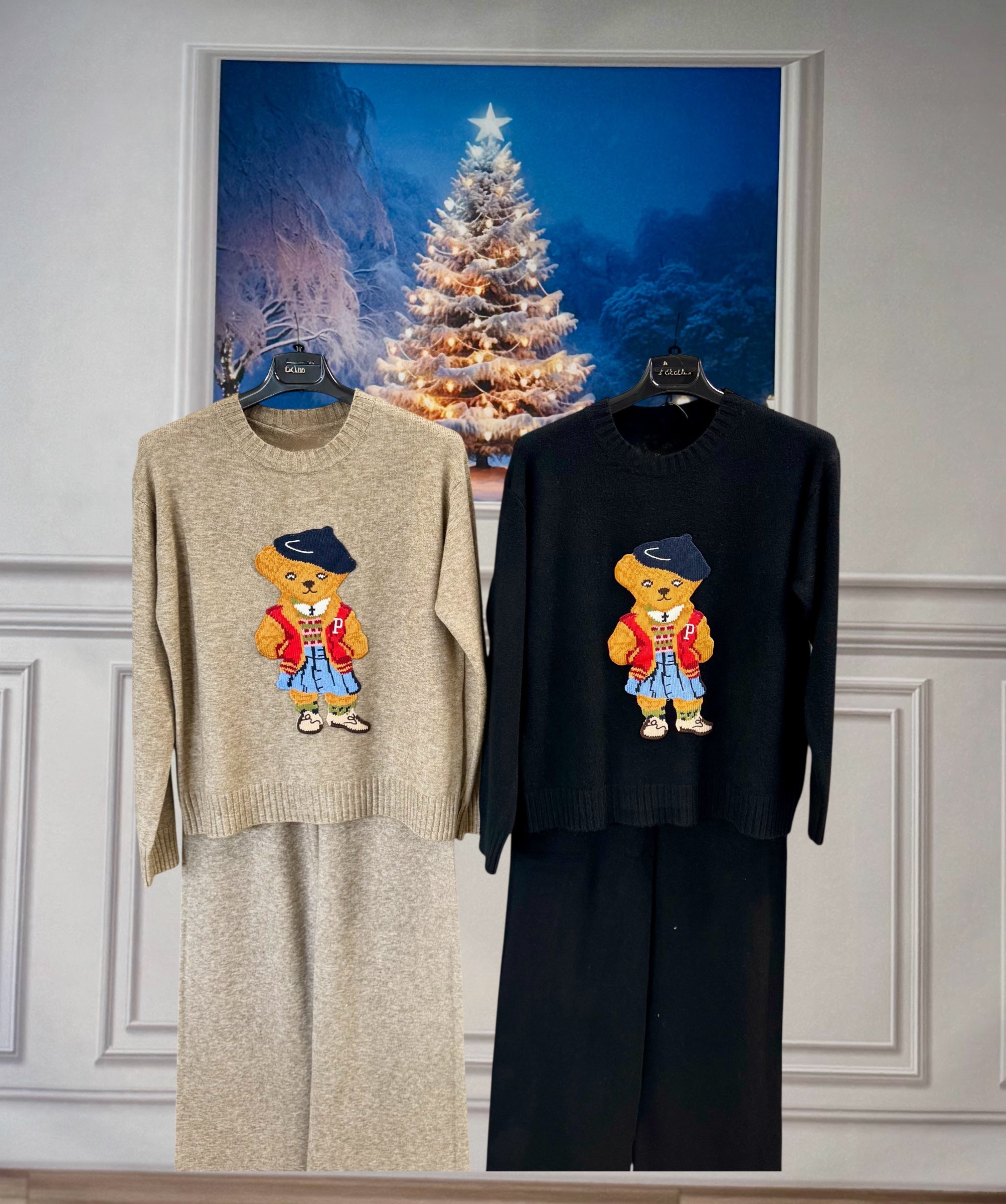 Coordinato in lana pettinata. Magkia cin orsetto a rilievo vestibilità da 112cm a 150cm di giroseno. Pantaloni gamba morbida molla in vita regolabile vestibilità da 80cm a 130 cm di giro vita e 100cm a 140cm di giro fianchi