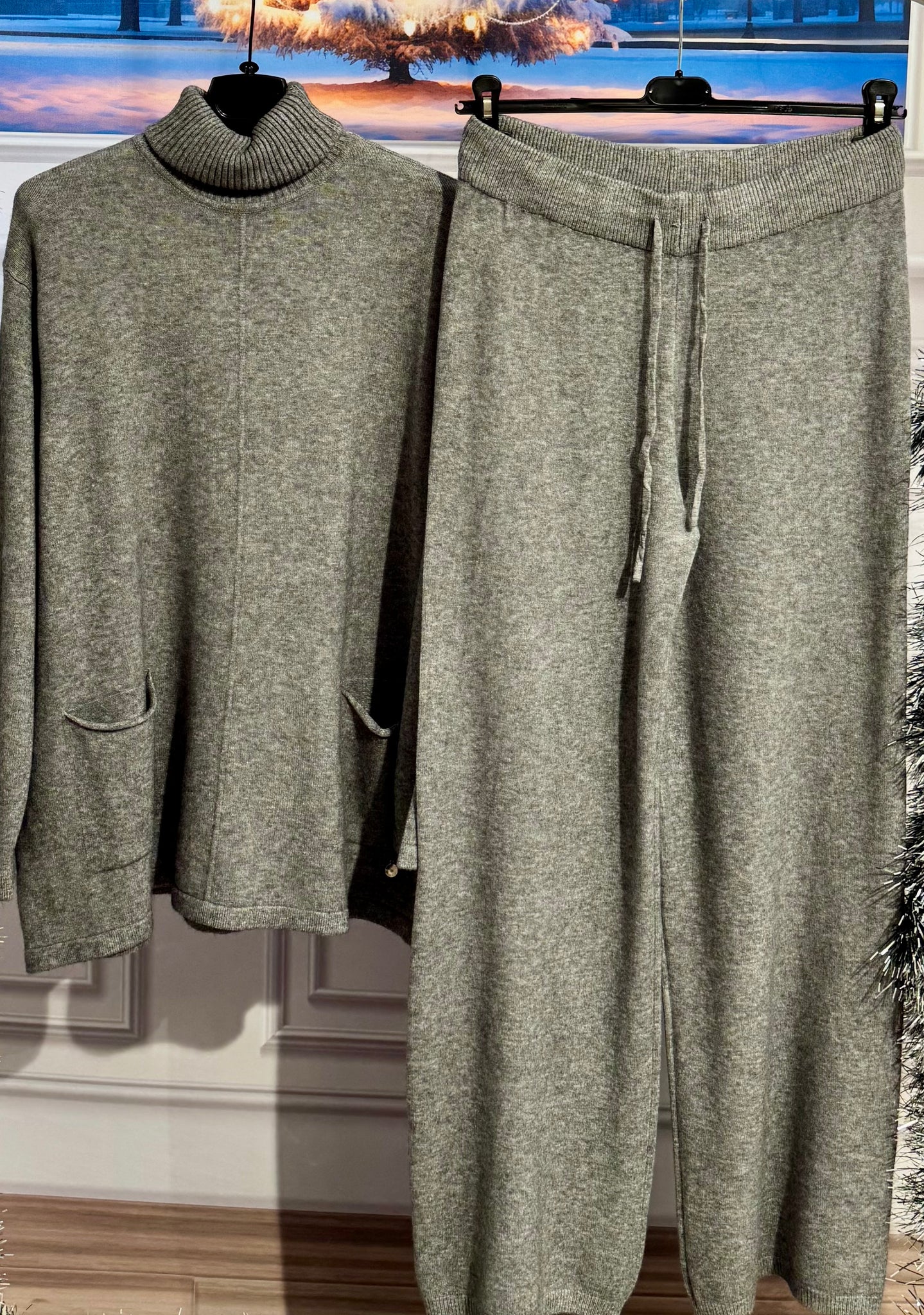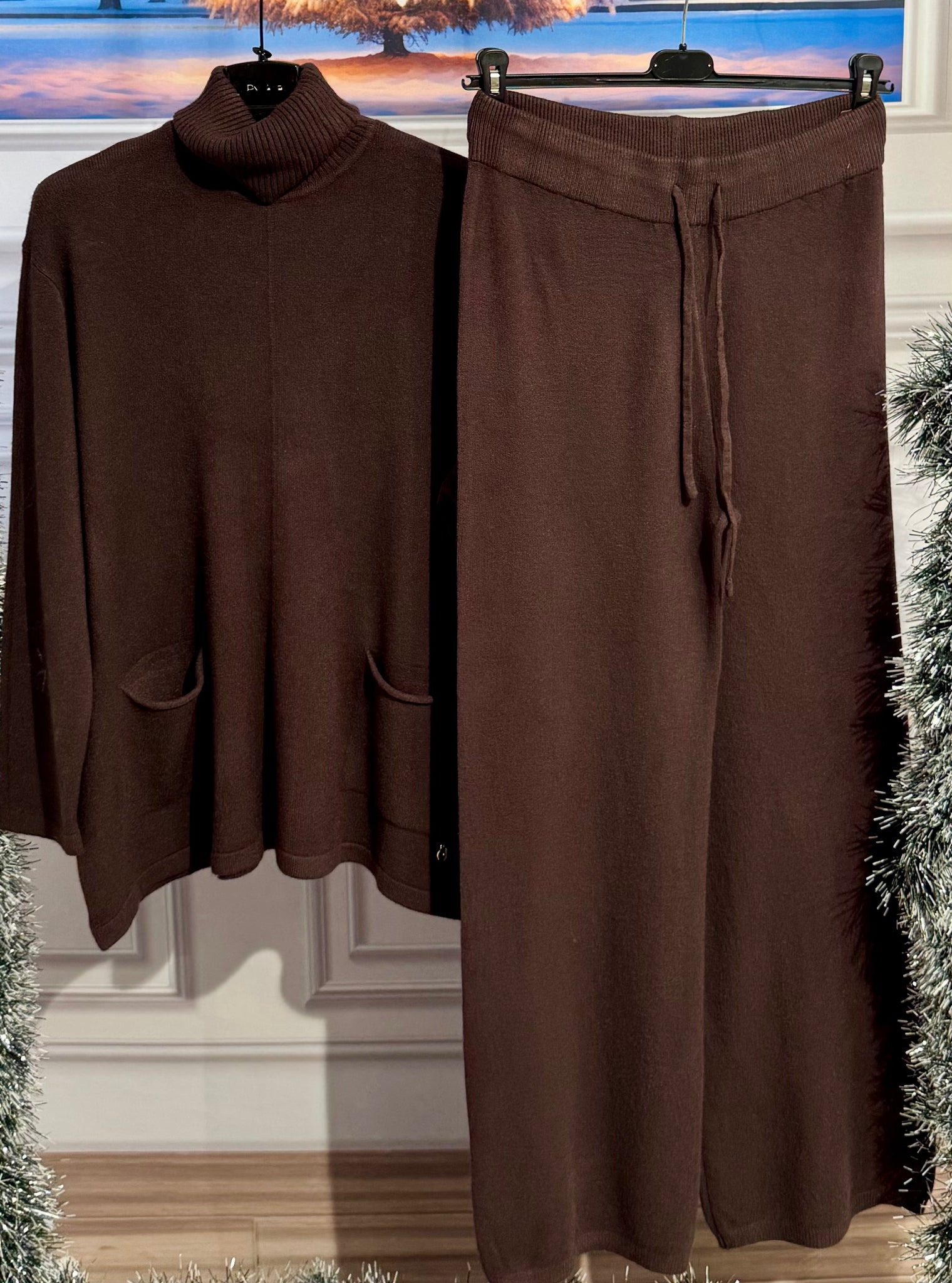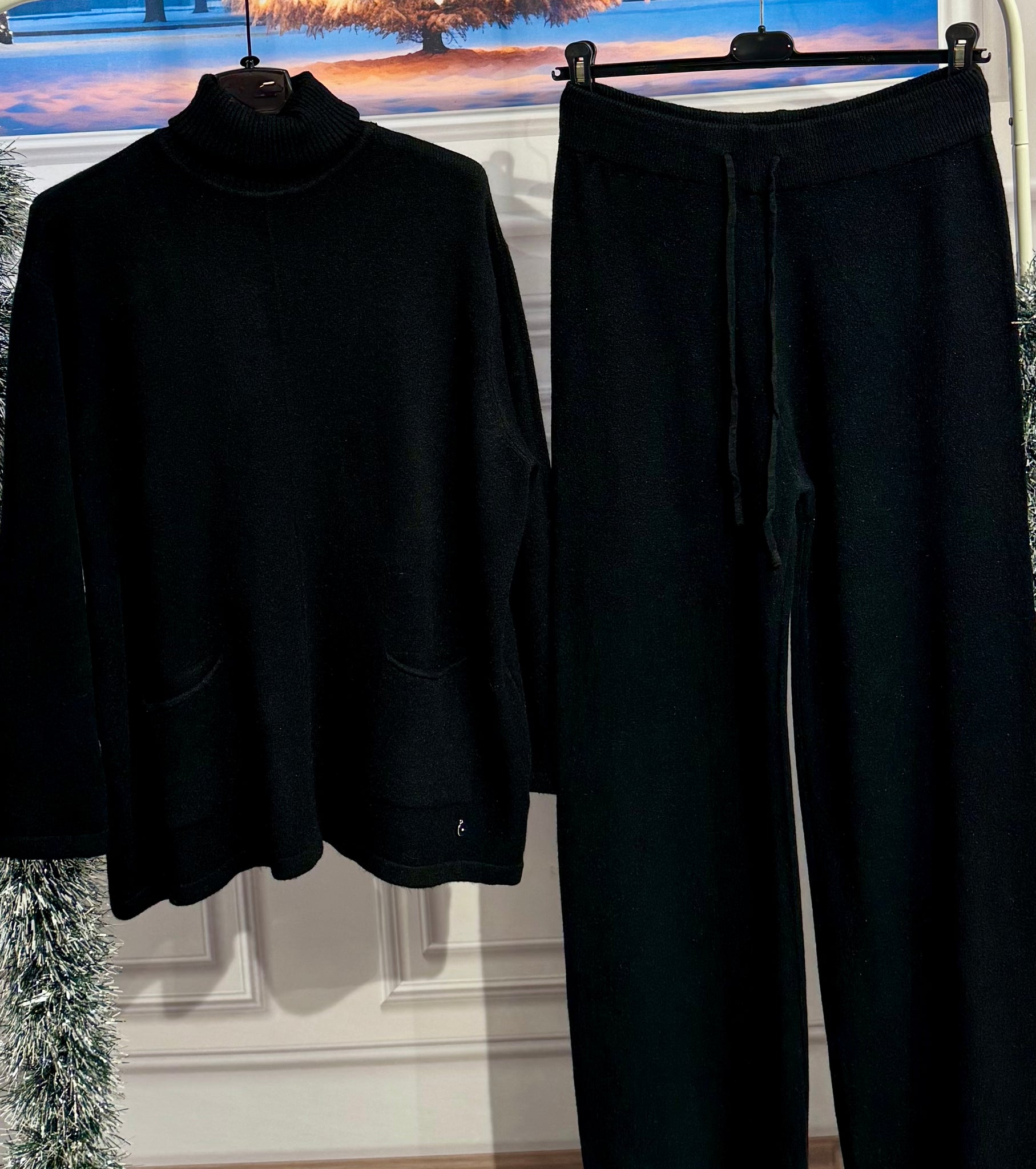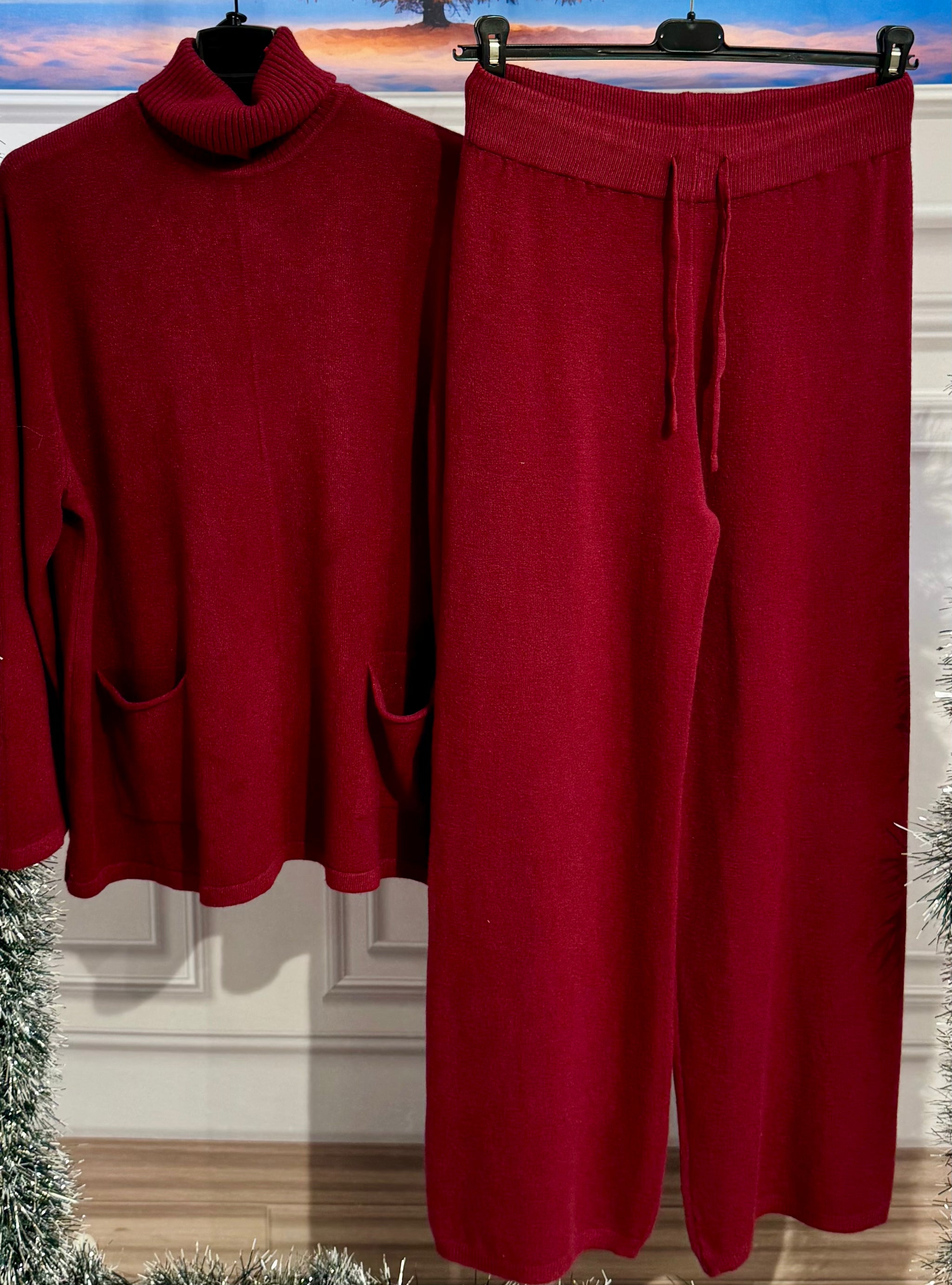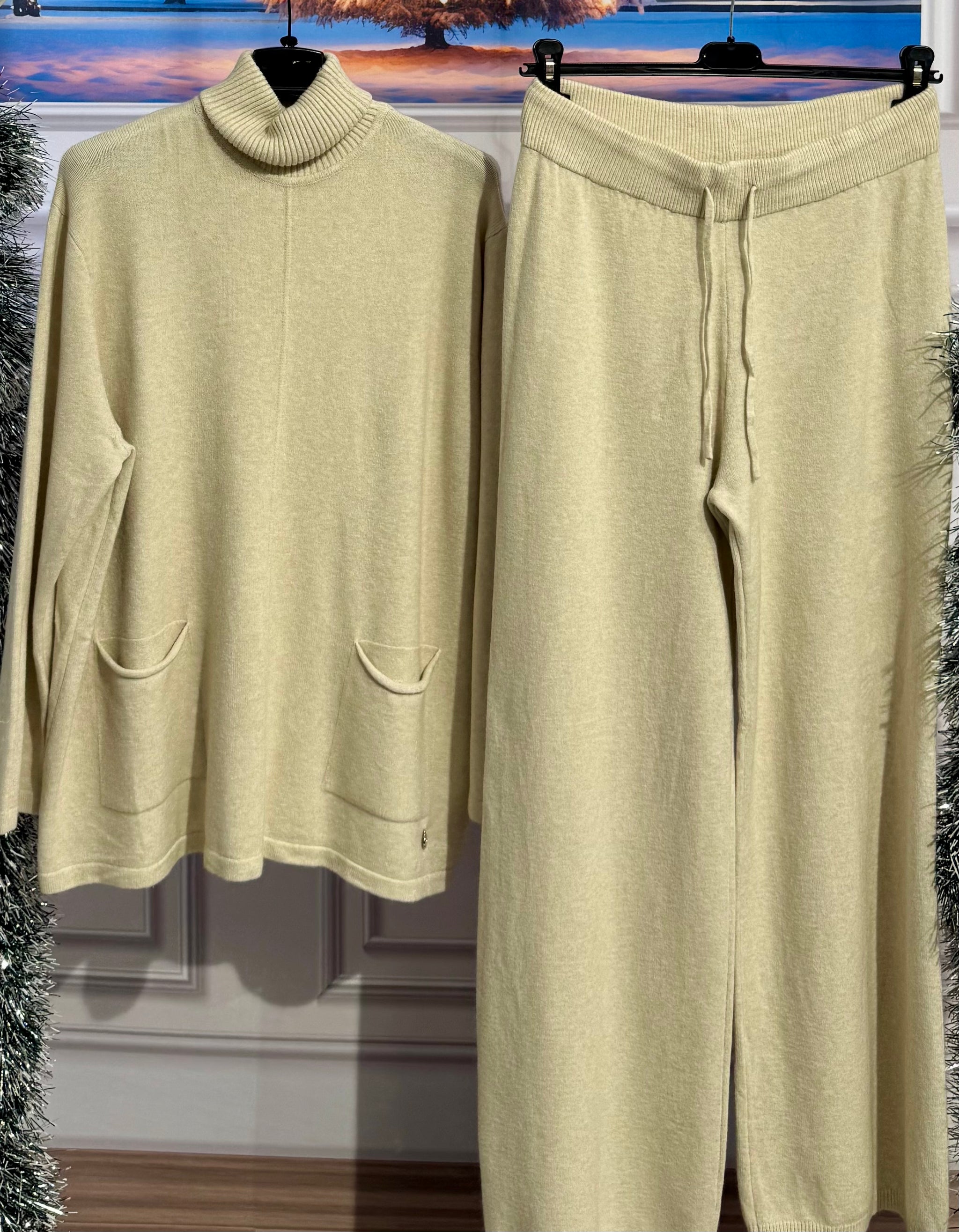 Coordinato in lana  pettinata . Maglia con collo a costine altro e morbido, tasche vestibilità da 140cm a 2m di giro seno . pantaloni gamba larga elastico in vita e laccetto regolabile vestibilità da 84cm a 160cm di giro vita