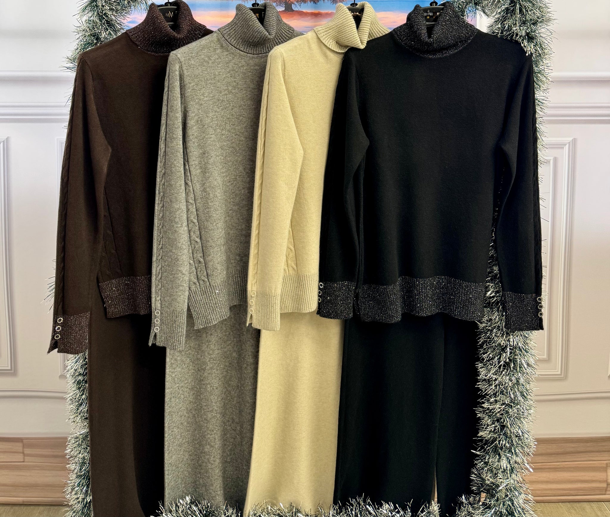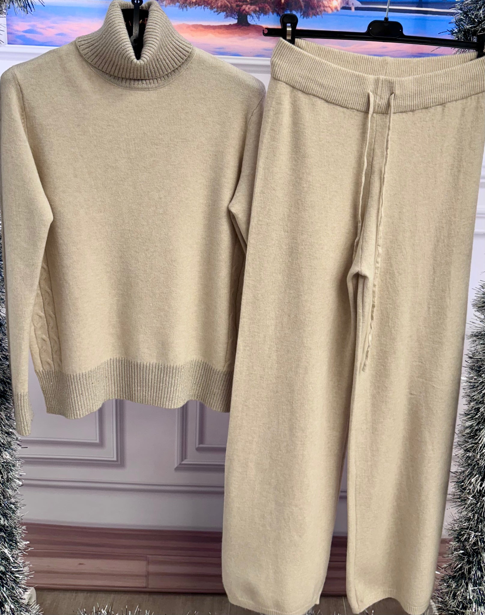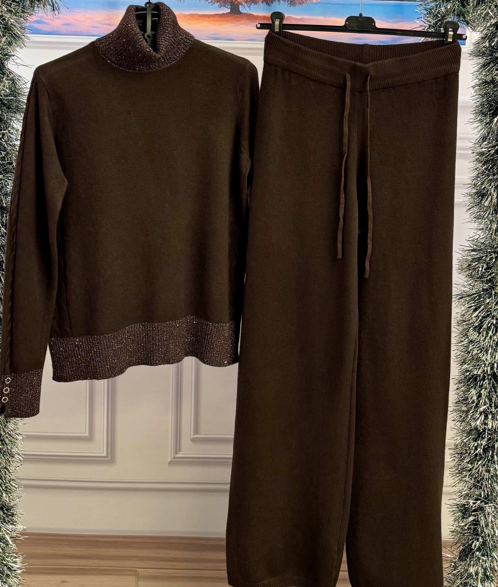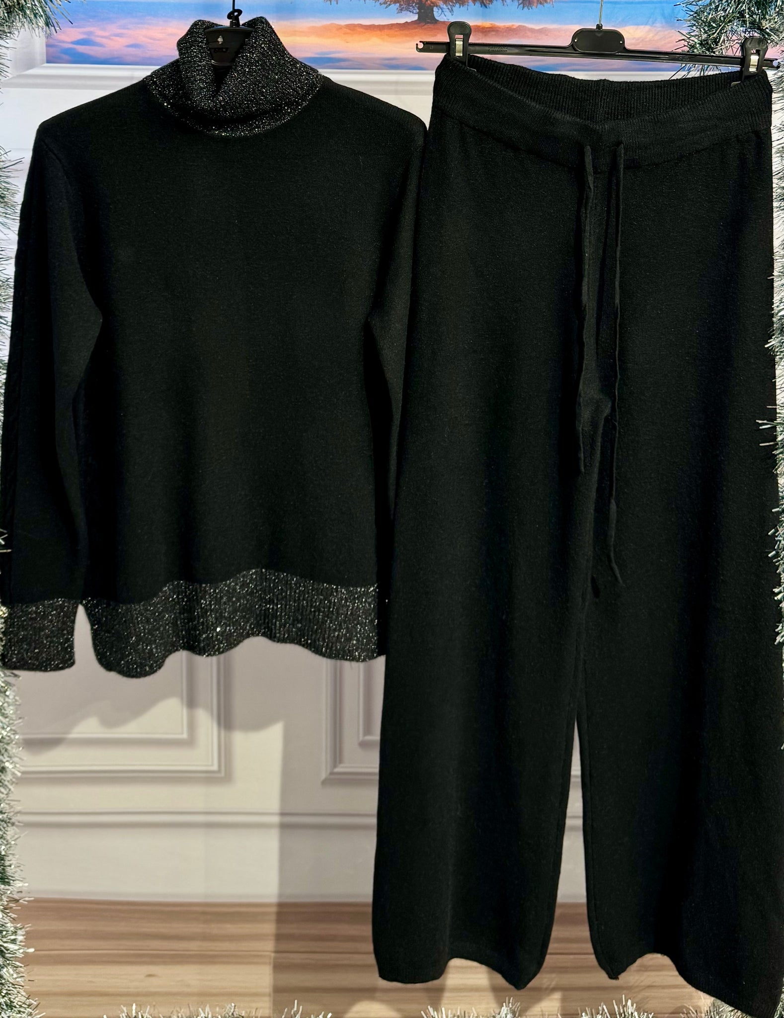 Coordinato in lana trama treccia . Maglia con collo alto e morbido e dettaglio brillantinato sul colletto, sul polsino e sull’orlo con soacchetti laterali e bottoncini gioiello, vestibilità da 114cm a 170cm di giro seno . Pantaloni gamba larga elastico in vita e coulisse , vestibilità da 80cm a 150cm di giro vita