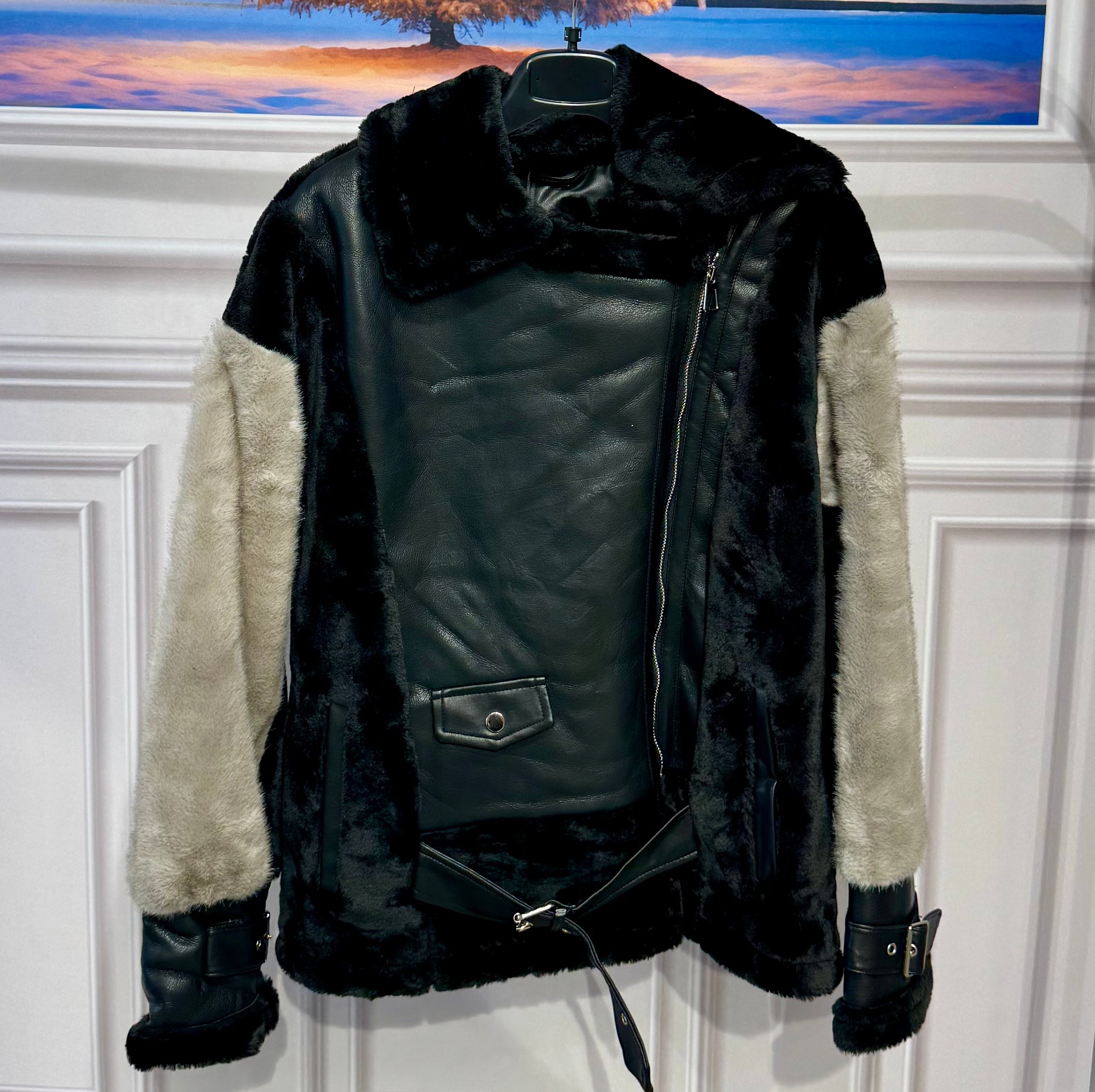 Giubbino doppiopetto in ecopelle e eco pelliccia in doppio colore con contirini regolabili vestibilità da 114cm a 120cm di giroseno