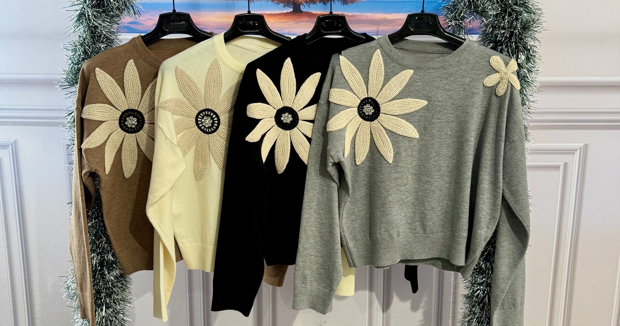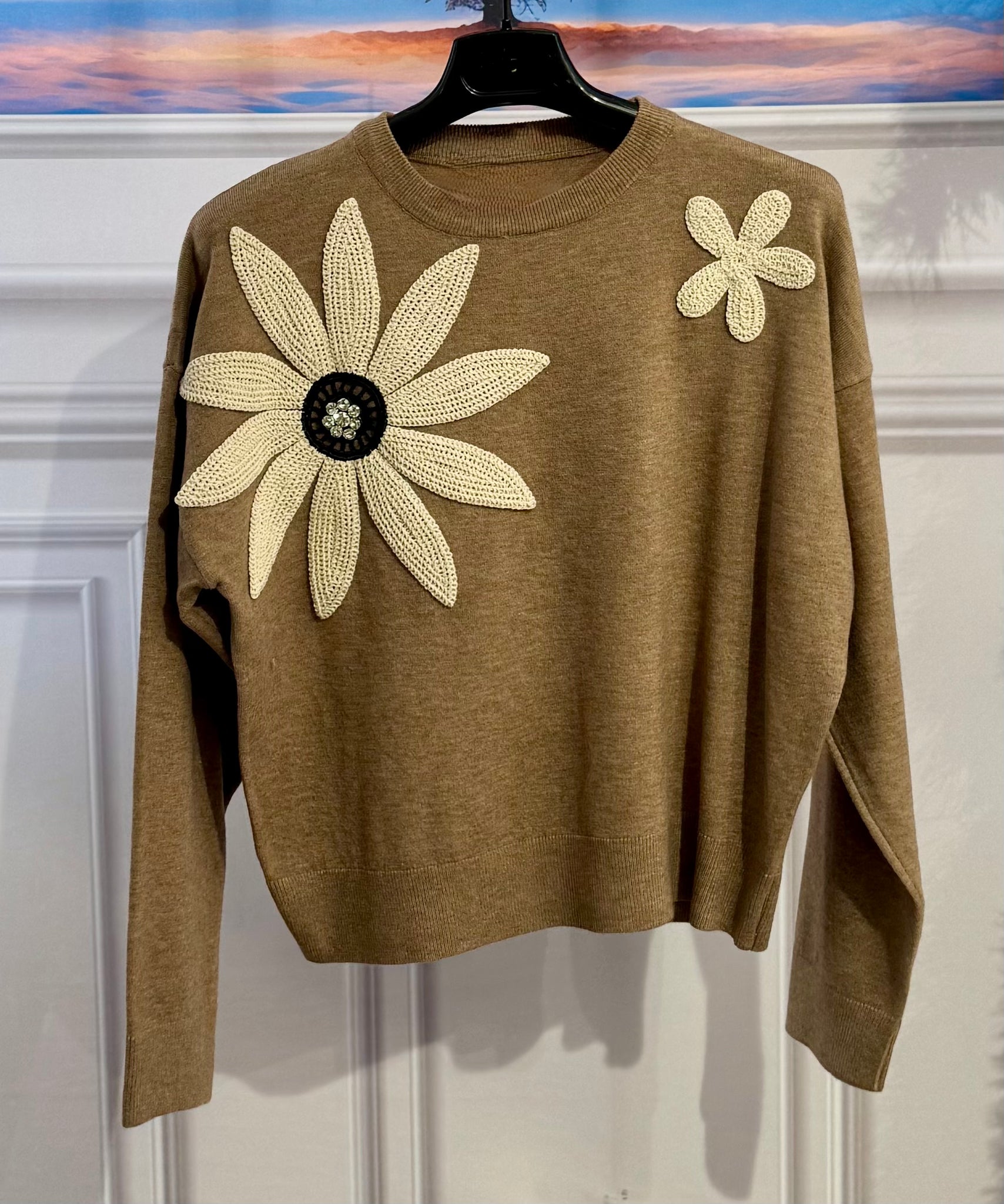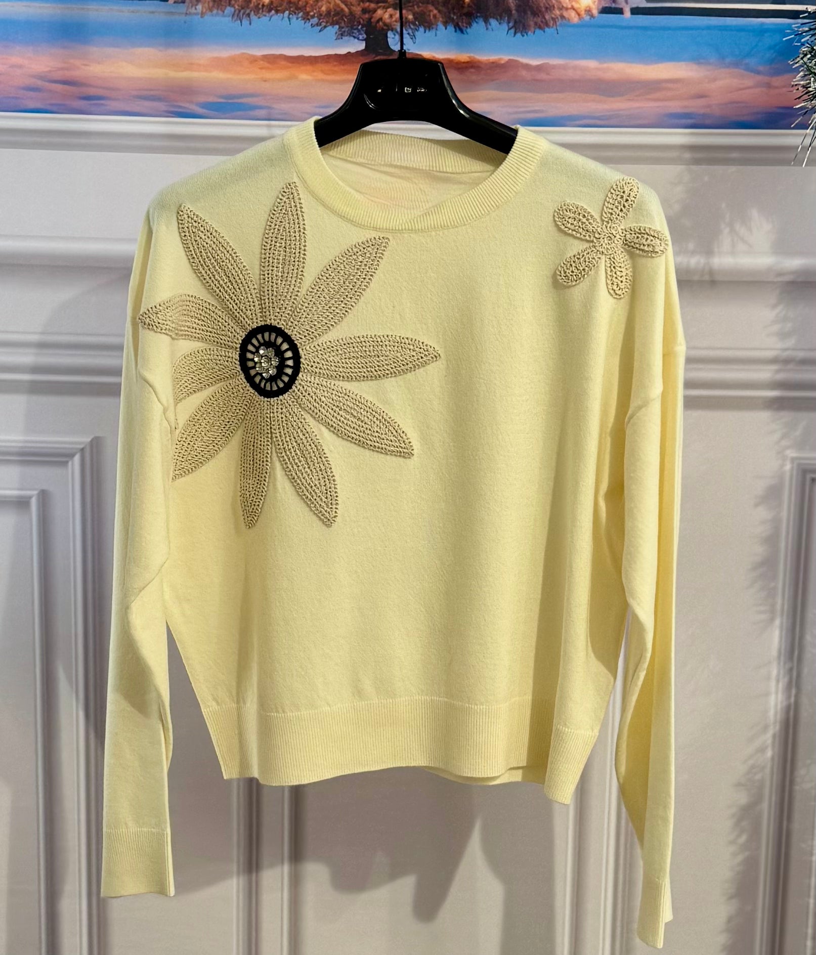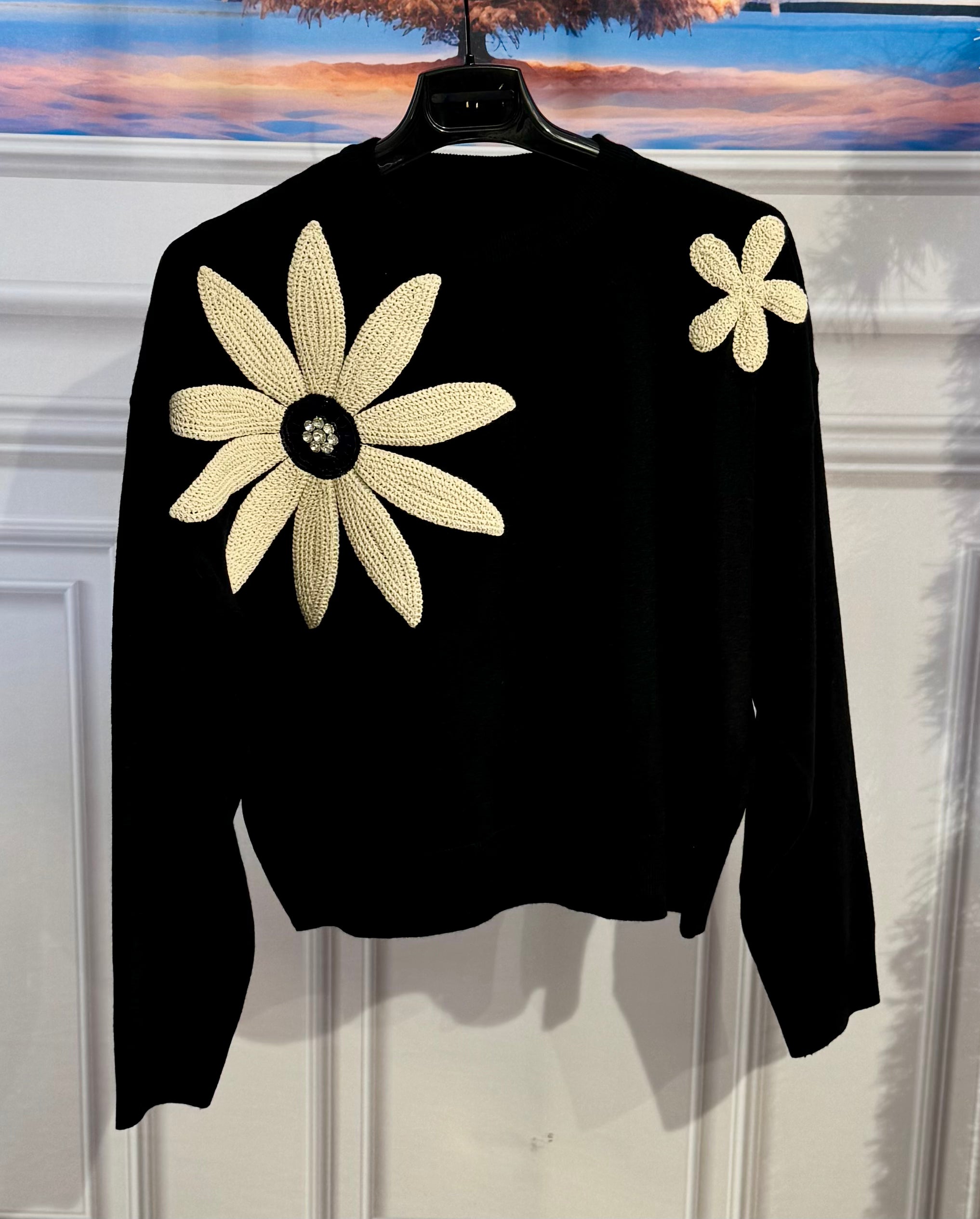 Maglioncino in lana pettinata giro collo con fiori a uncinetto a rilievo e strass vestibilità da 120cm a 160cm di giro seno