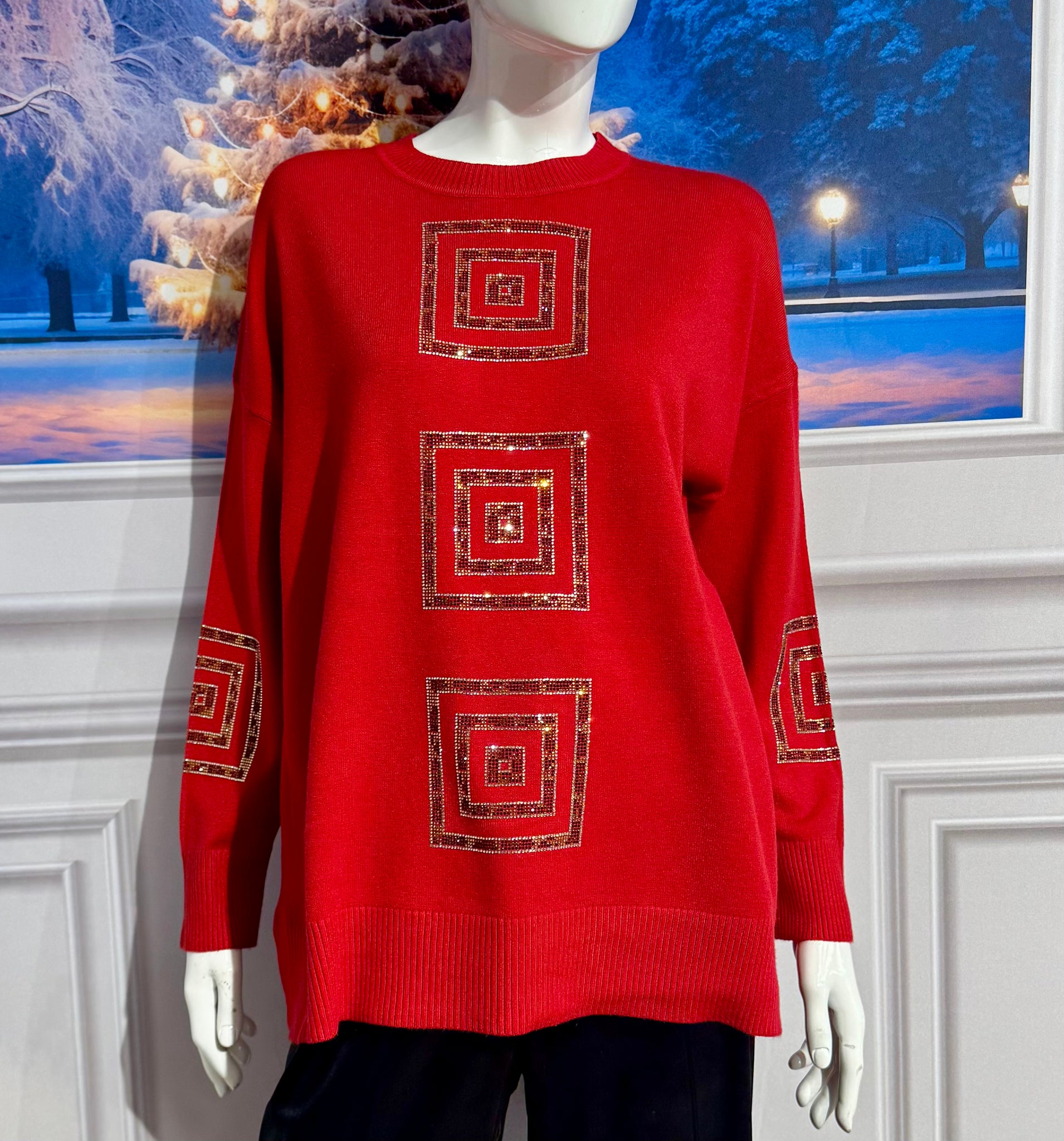 Maglioncino in lana girocollo con fantasia quadrati strassati anche sulla manica, vestibilità da 132cm a 180cm di giro seno