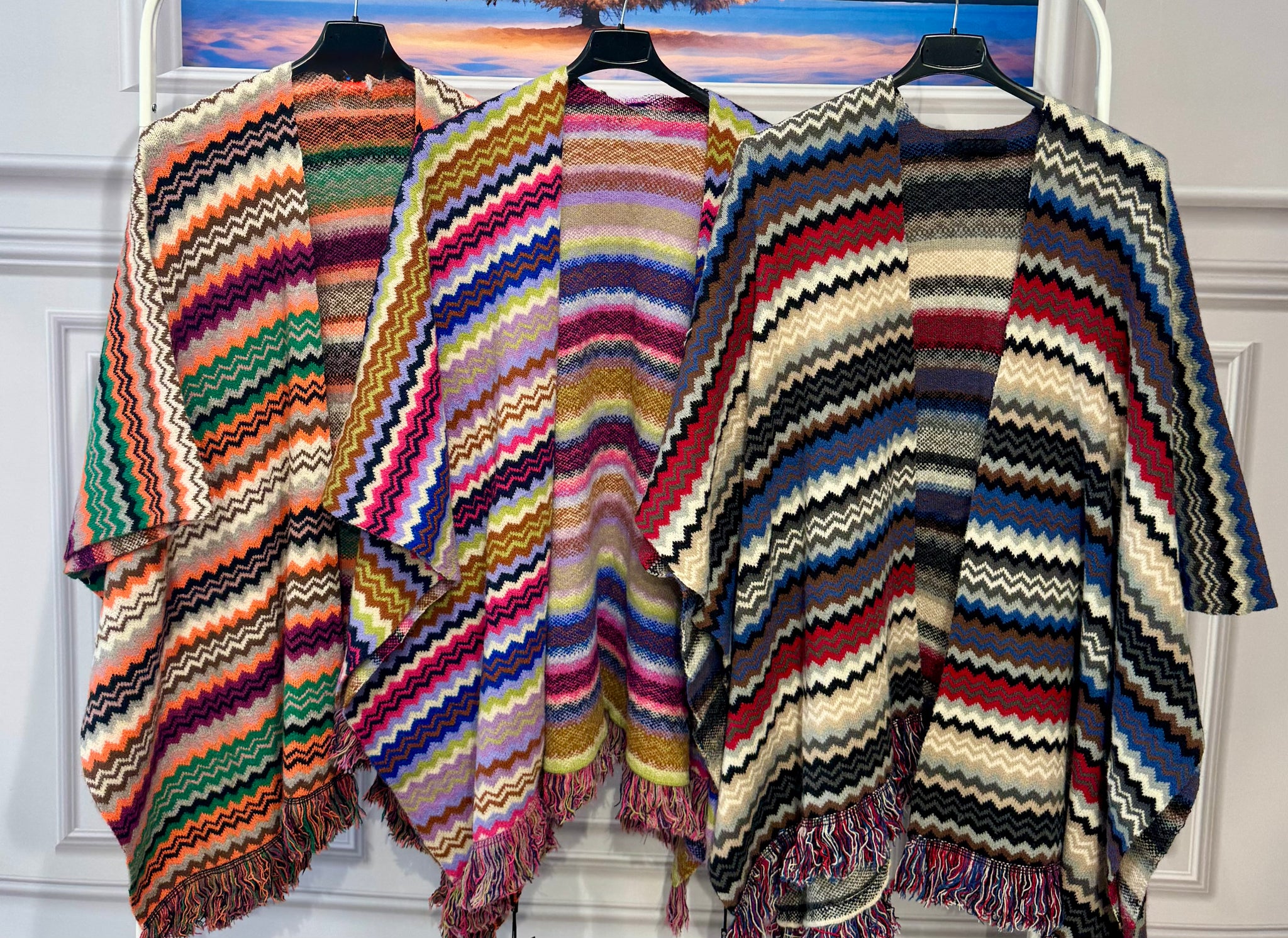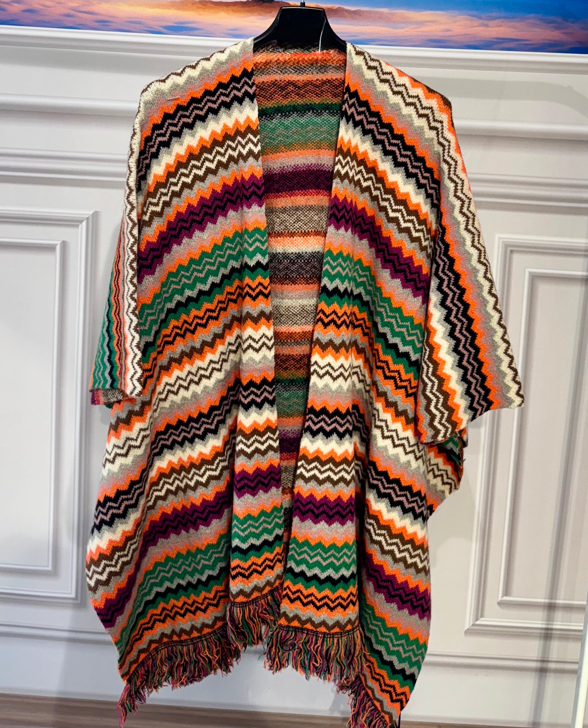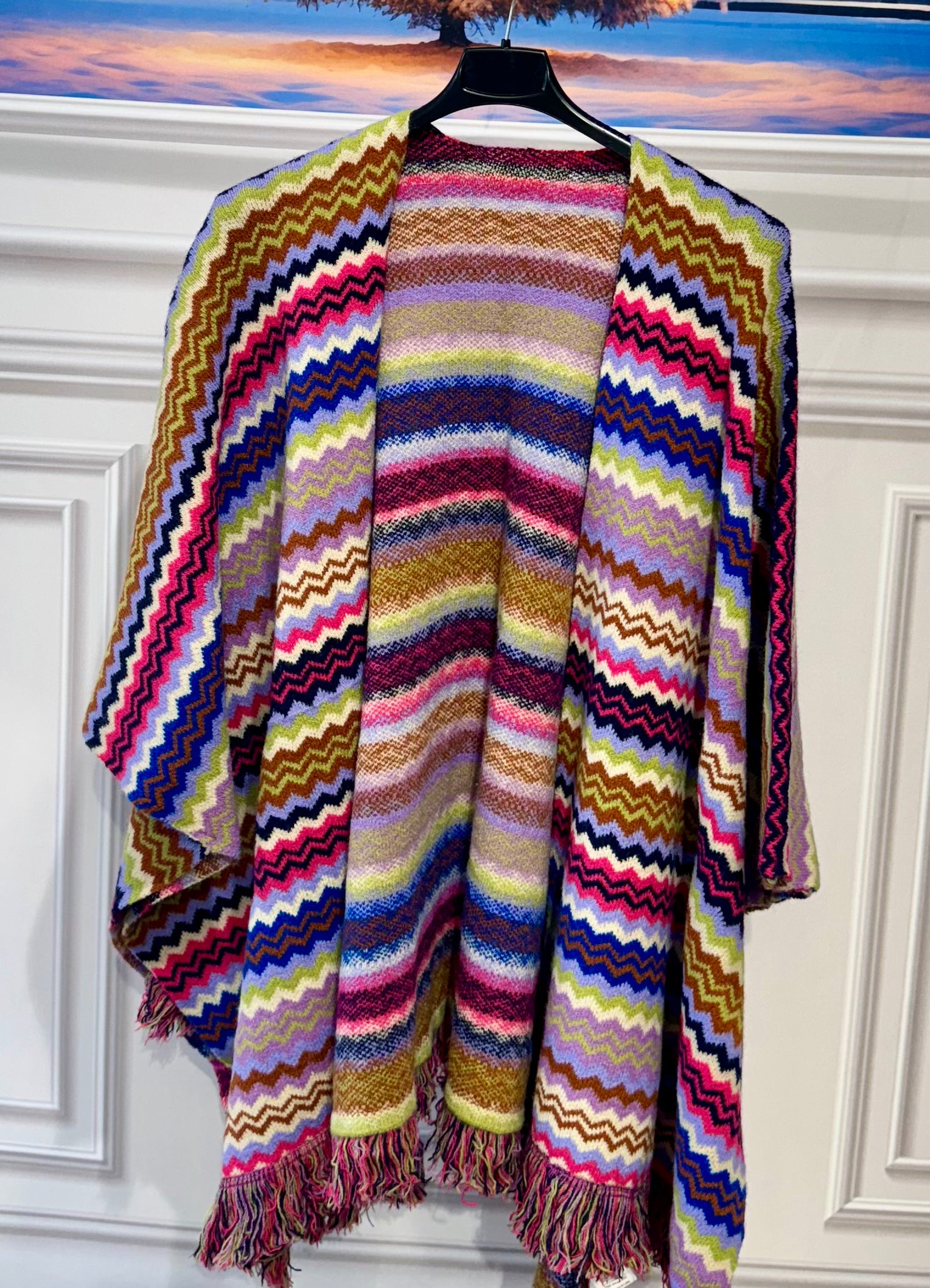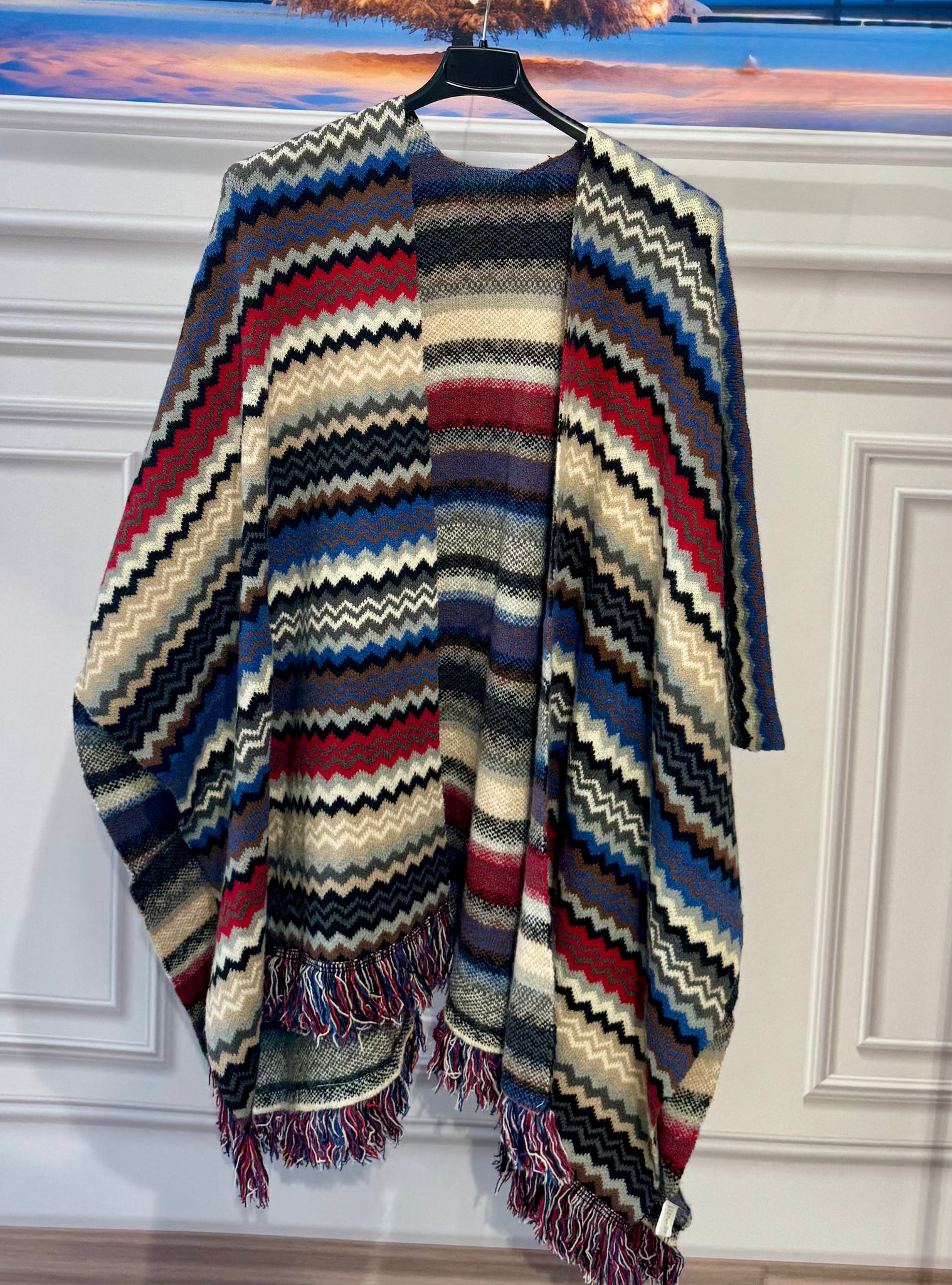 Mantella in lana pettinata fantasia geometrica multicolore sfrangiata sulla fine