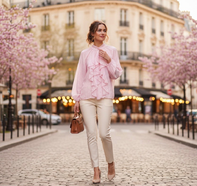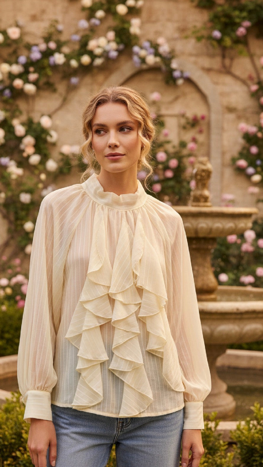 Blusa in tessuto leggero effetto organza, con maniche morbide e polsini elasticizzati. Il davanti è impreziosito da balze arricciate che donano movimento e femminilità, mentre il collo è rifinito con un fiocco regolabile sul retro per un tocco elegante e delicato. Vestibilità da 114cm a 126cm di giroseno
