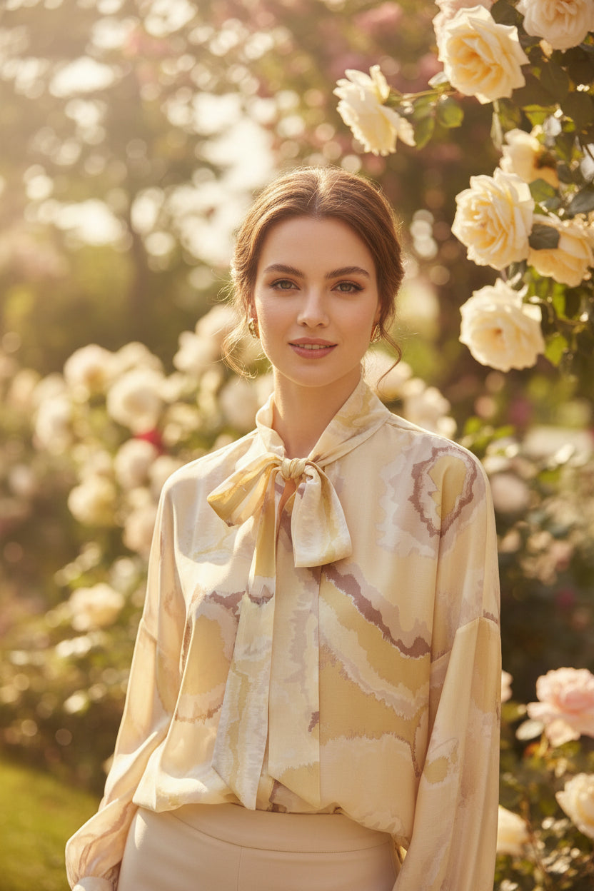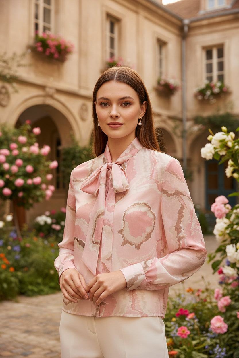 Blusa in tessuto leggero effetto organza, con maniche morbide e polsino stretto. Lo scollo a V è valorizzato da un elegante collo a cravattino, per un look femminile e raffinato.Vestibilità 148cm di giroseno