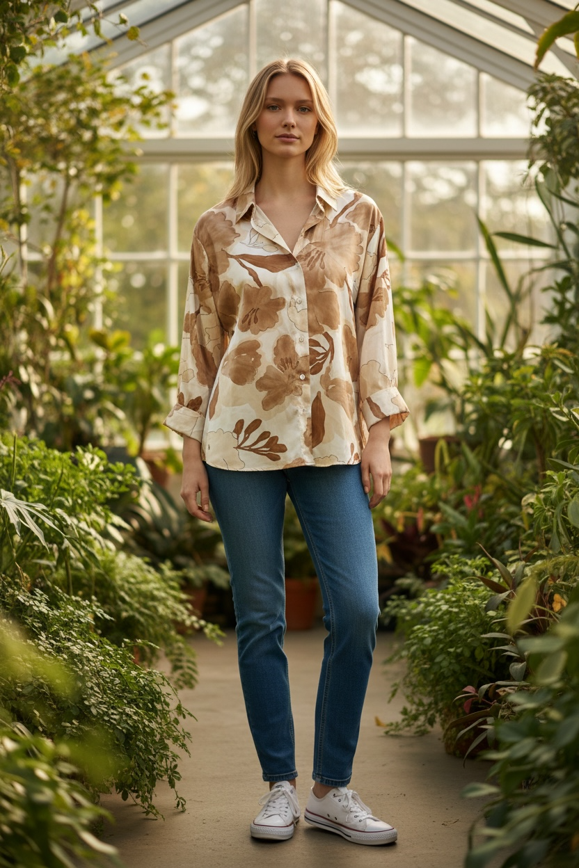 Camicia effetto raso seta con fantasia floreale e dettaglio laminato oro vestibilità 140cm di giroseno